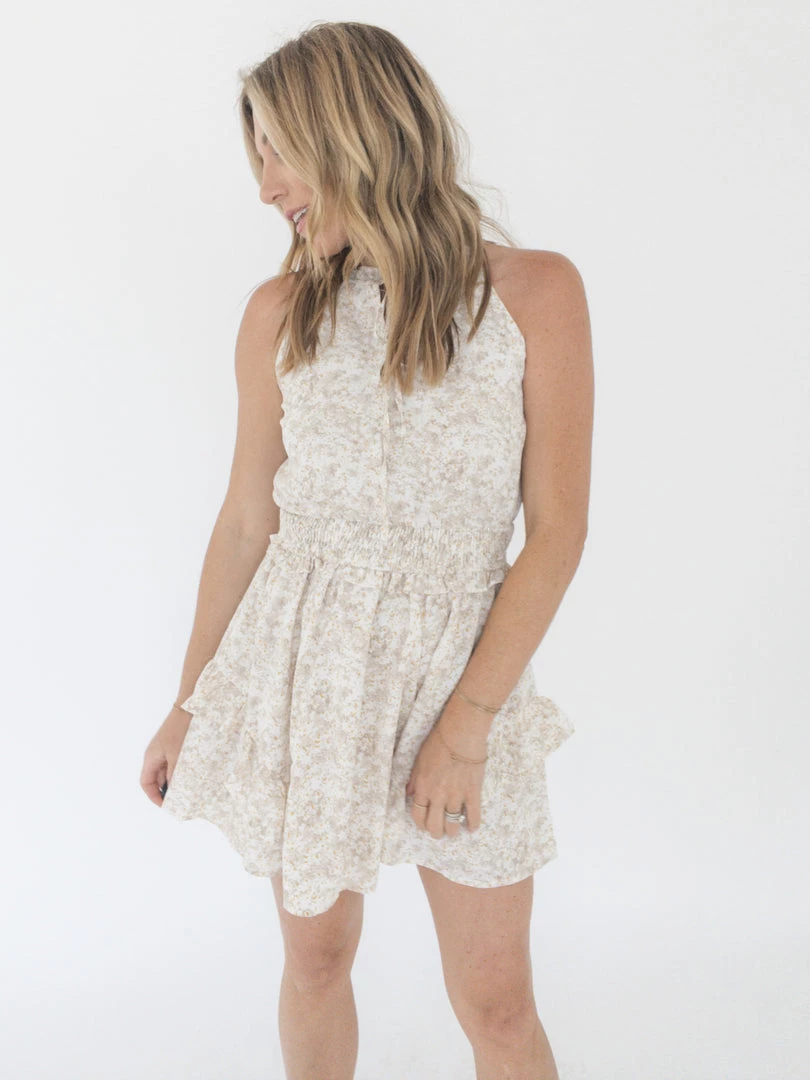 A neutral floral mini dress with all the ruffle details. Susanna has a smocked, elastic waist with a high neck and adjustable tie closure at the front. Her skirt has sweet ruffle details rounding out this feminine mini dress. Lined.