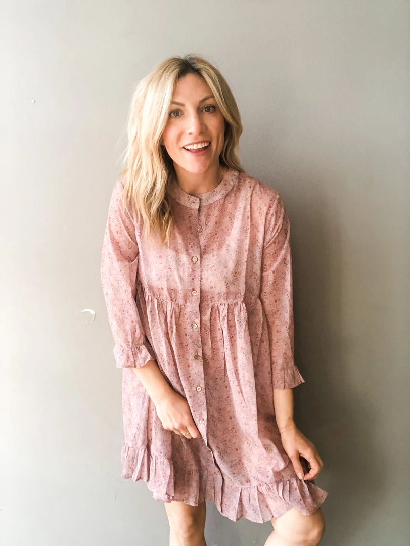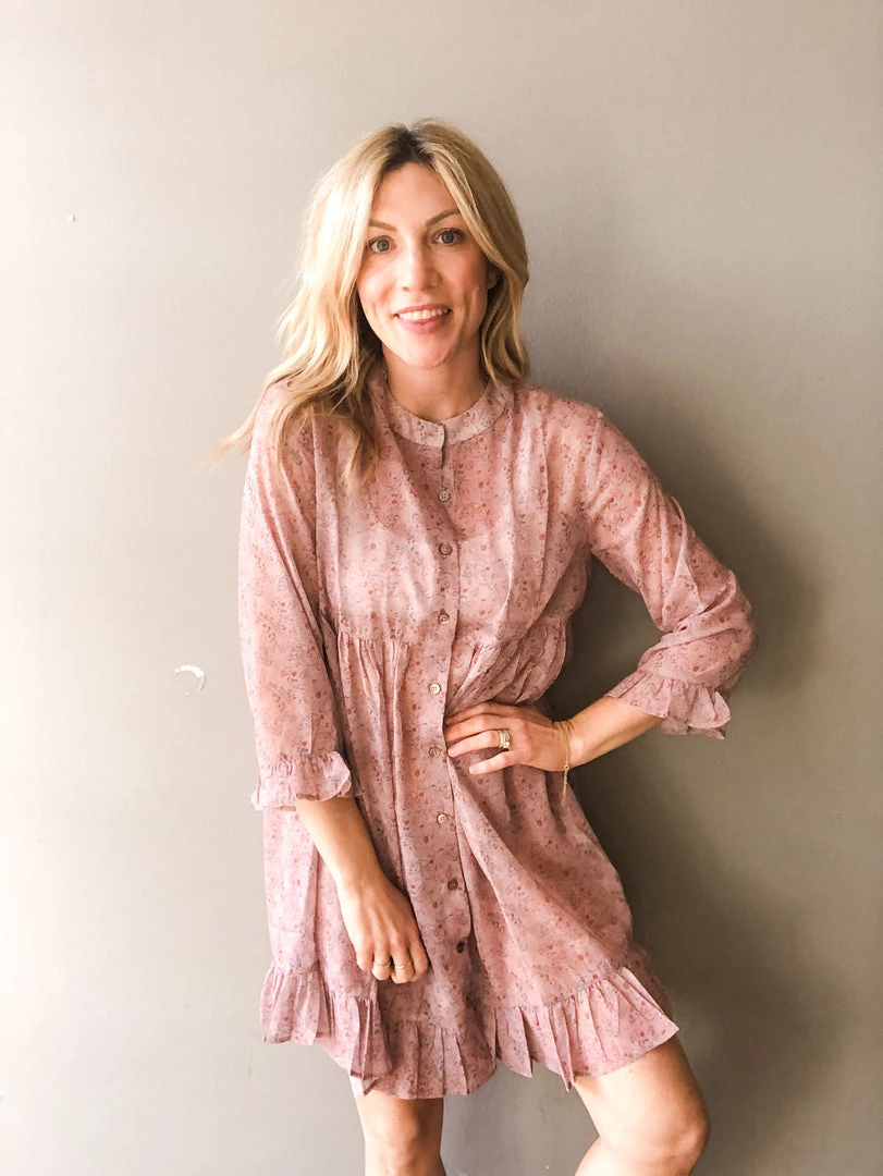 Pretty in pink floral, this sweet mini dress with three quarter length sleeves and ruffle details at the hem, button front and high neck is a perfect segway to spring. Loose fitting babydoll style in a sheer floral fabric. Layer over denim shorts or a slip to complete the look. In love with the boho vibe and feminine touch to this dress.