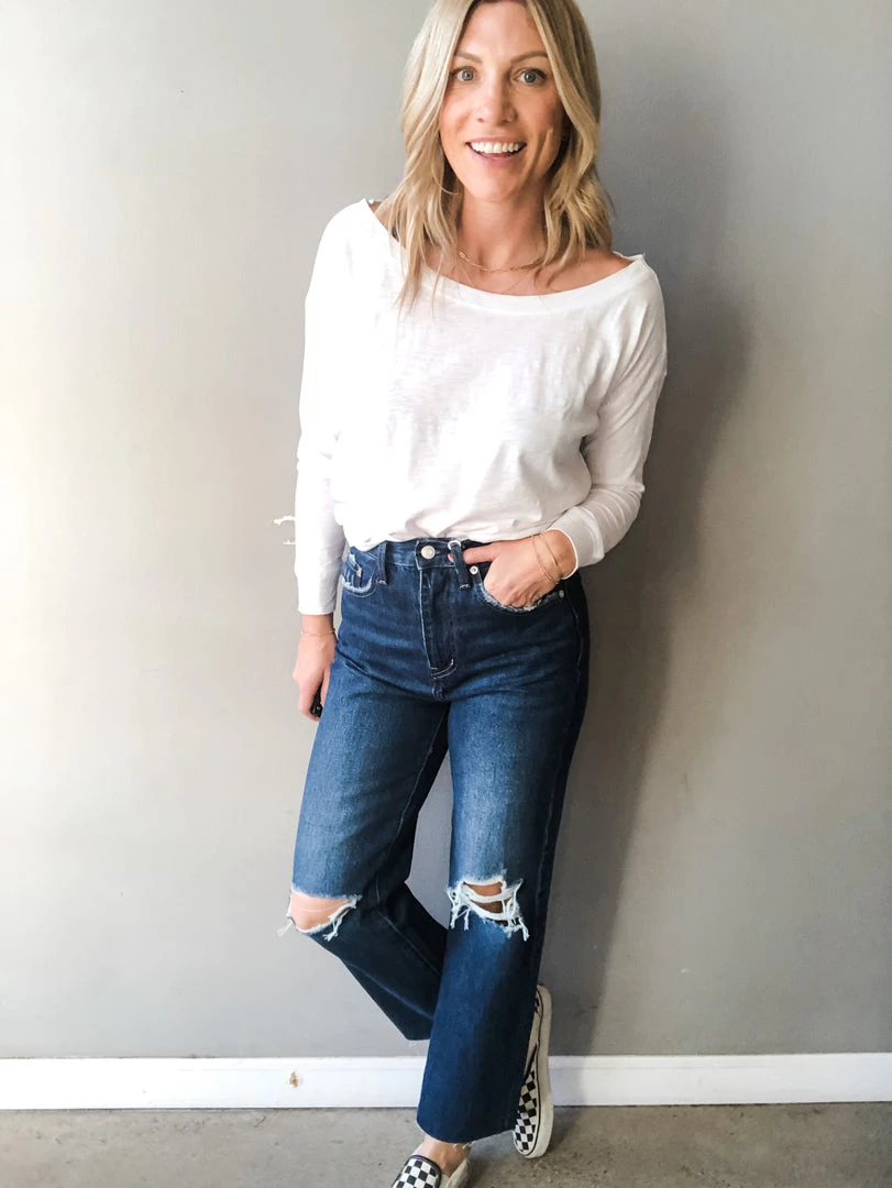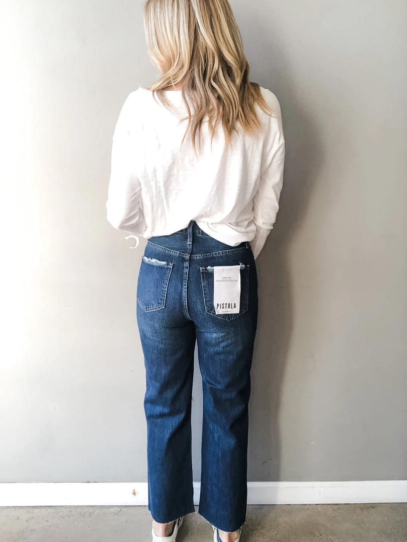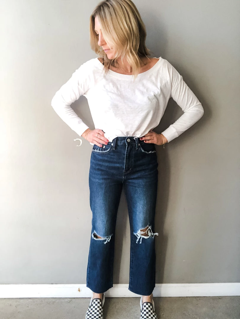 The Cassie Crop is a super high rise straight leg that hugs your waist and is relaxed throughout. This carefree style hits above the ankle and comes in an easy to wear dark wash with distressing at the knees.