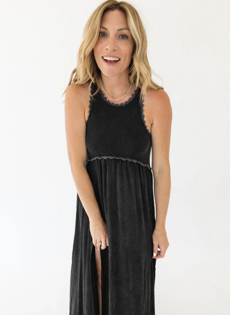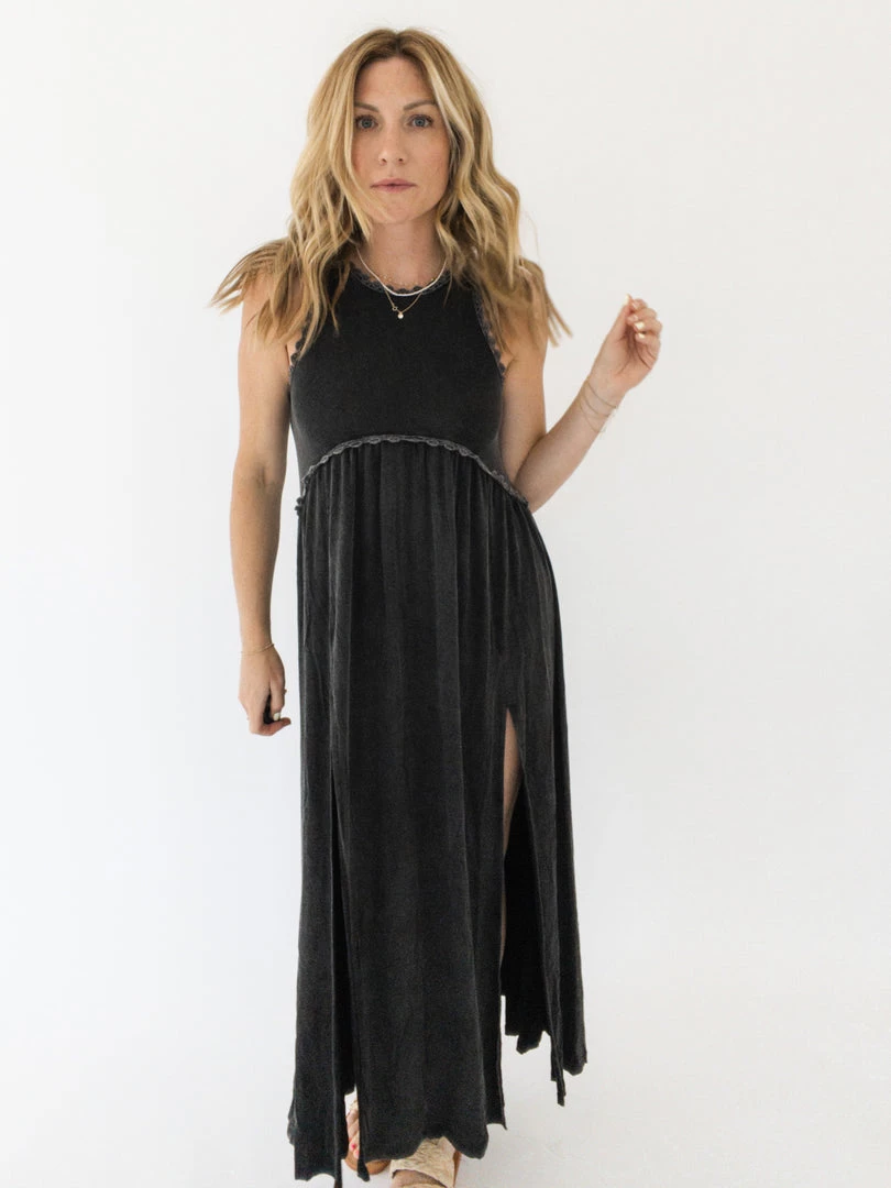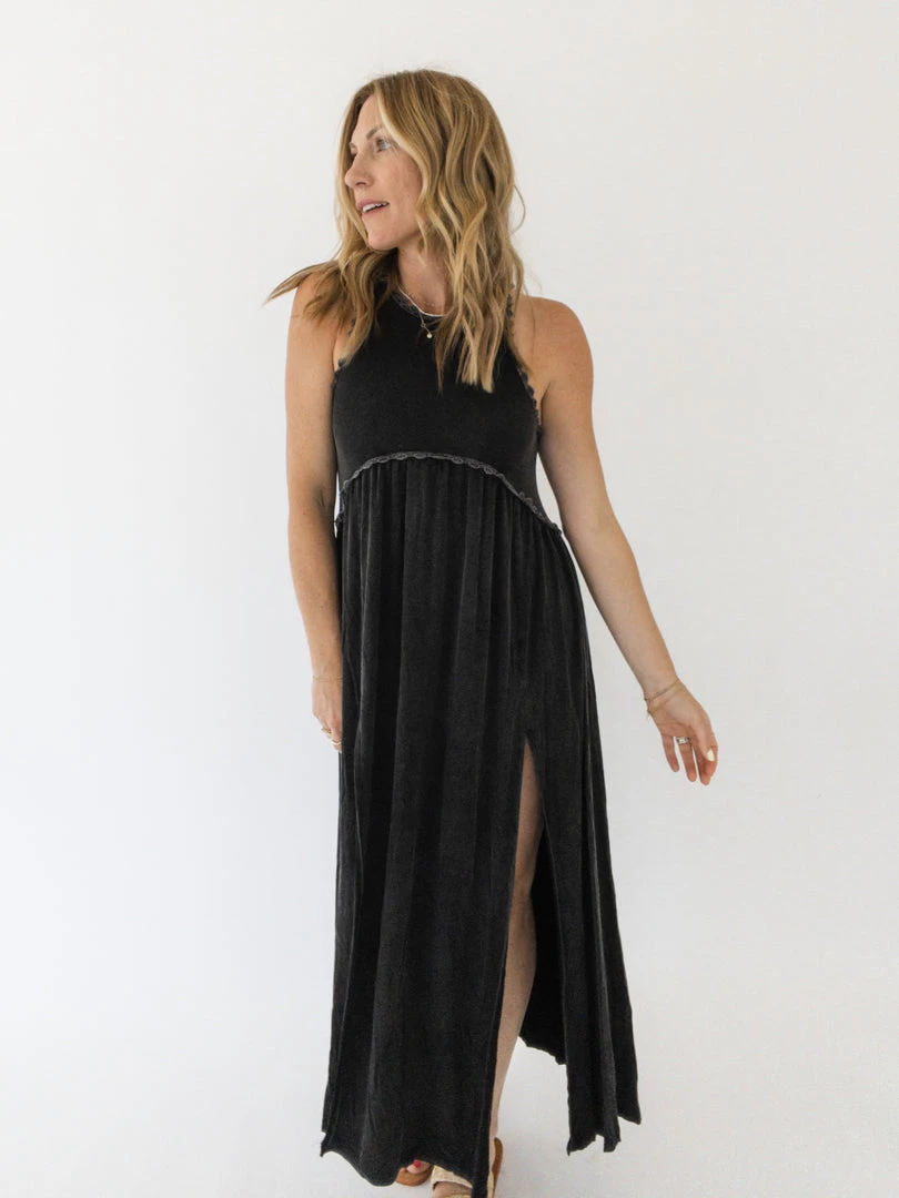This sweet babydoll maxi dress comes in a stonewashed washed black color that can easily be dressed up or down! Super soft and stretchy. We love the easiness of this chic silhouette that slips on and zips up the back. Side slits on either side for easy walking and dancing the night away.