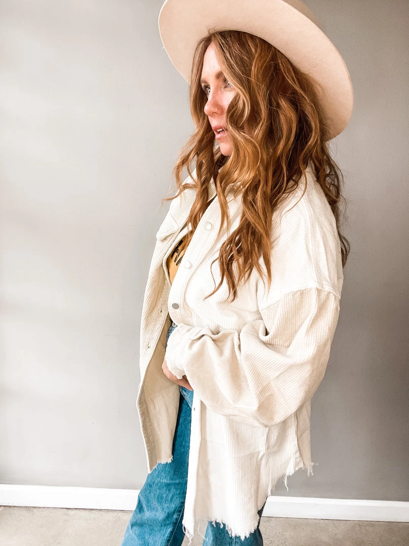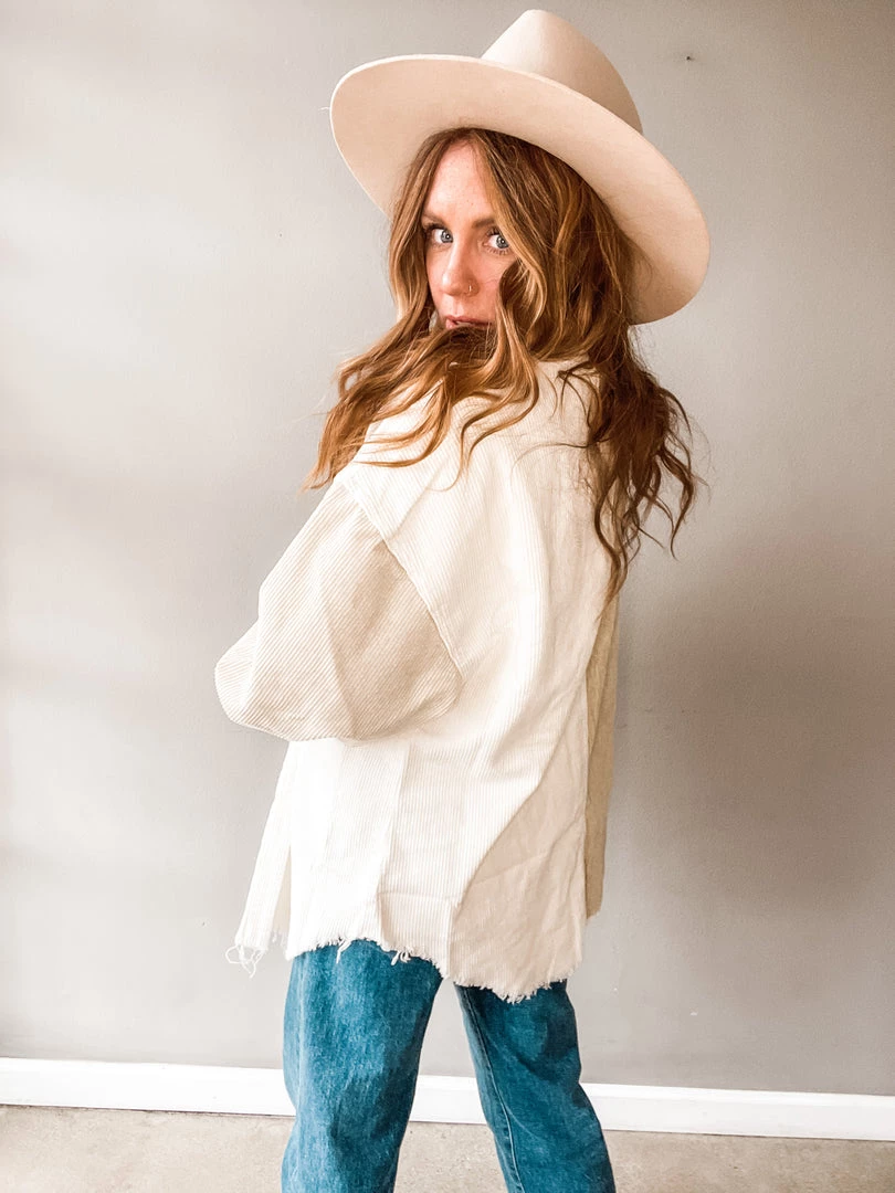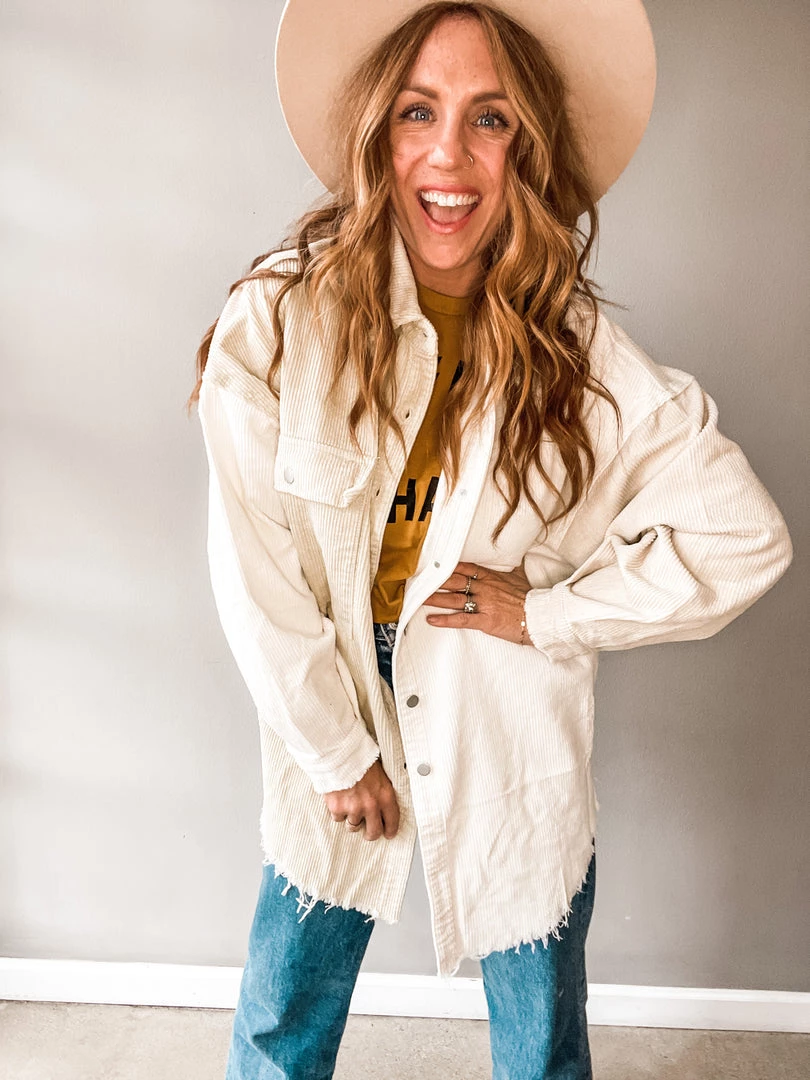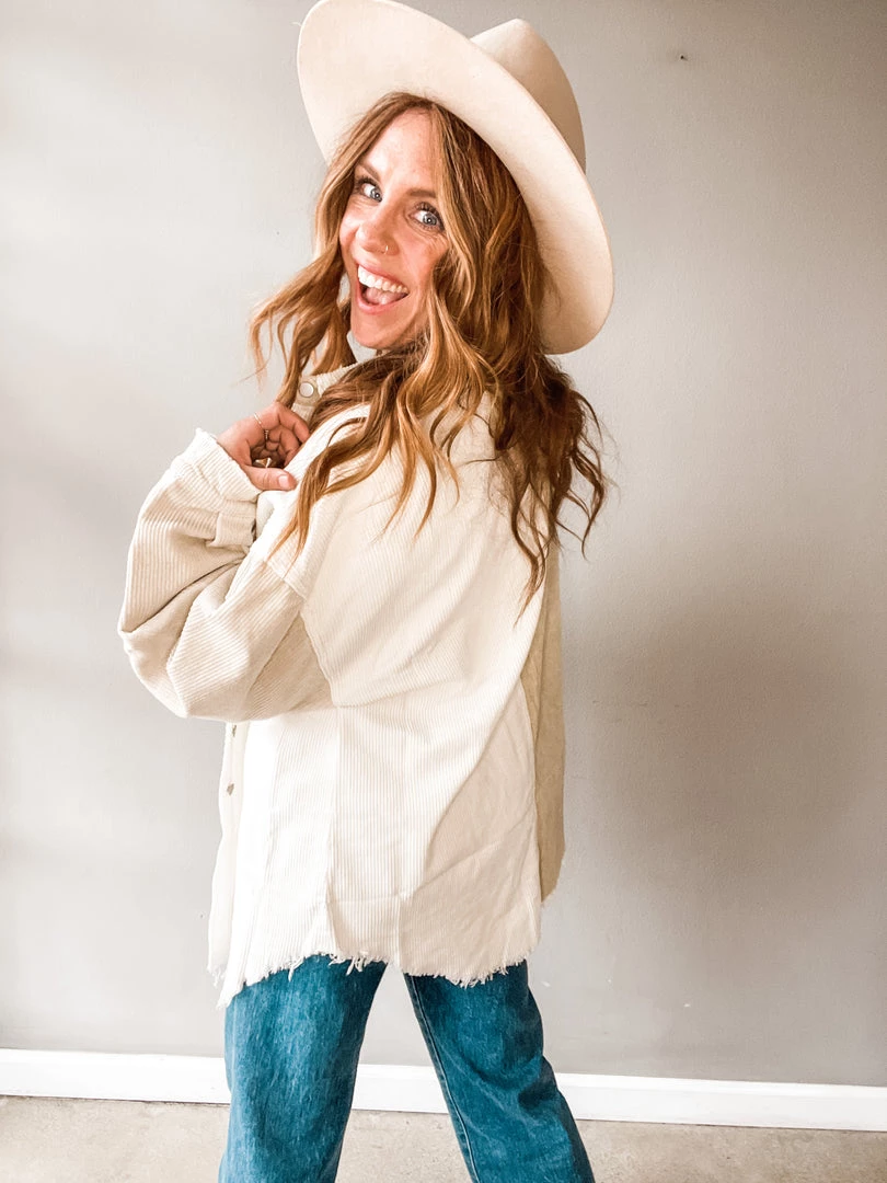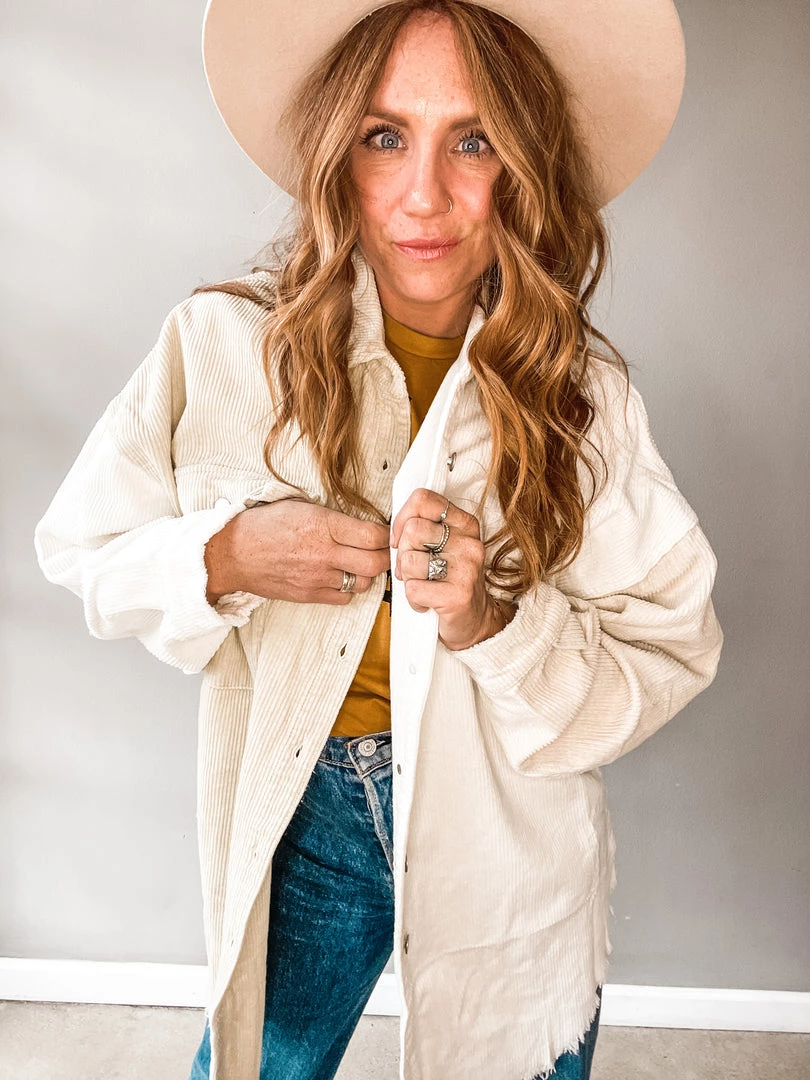 Cool girl necessity right here! The Chai Colorblock Corduroy Shacket is neutral enough to pair, while having just enough sass to stand out. Features a one half ivory, one half beige body and a raw hem. Pair with a bodysuit, denim and booties.