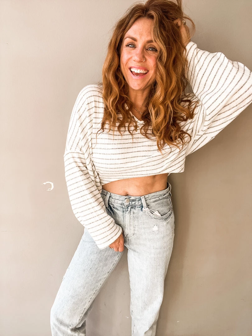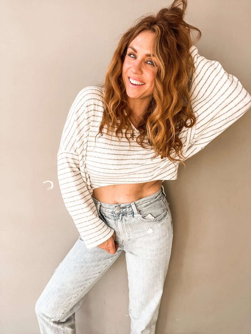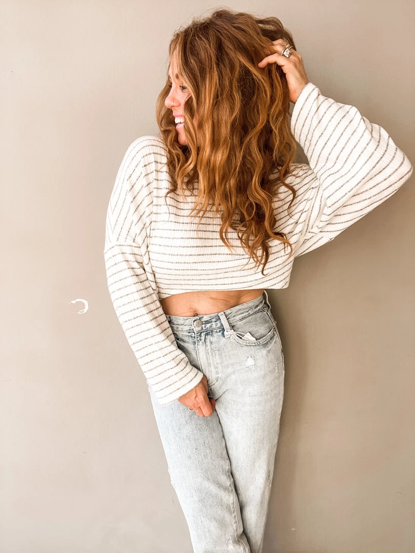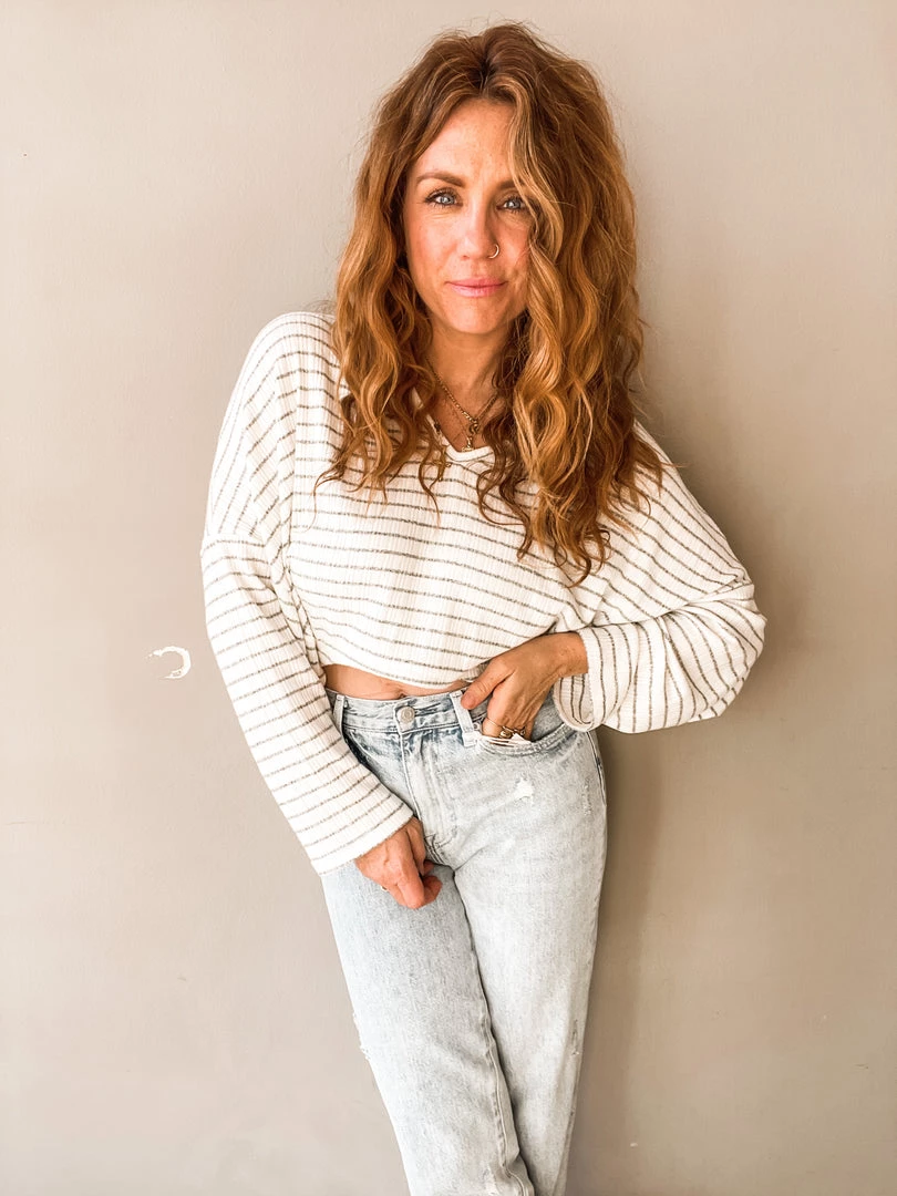 Cropped. Cozy. A must have. The Ariela Striped Long sleeve is a lightweight, soft ribbed fabric. This long sleeve crop has subtle batwing sleeves with drop shoulder detail. A slouchy wide V neck that you can toss over any cami or bralette. A scoop cut cropped hem that will stay put around your torso. A perfect toss on with some high rise jeans or shorts.