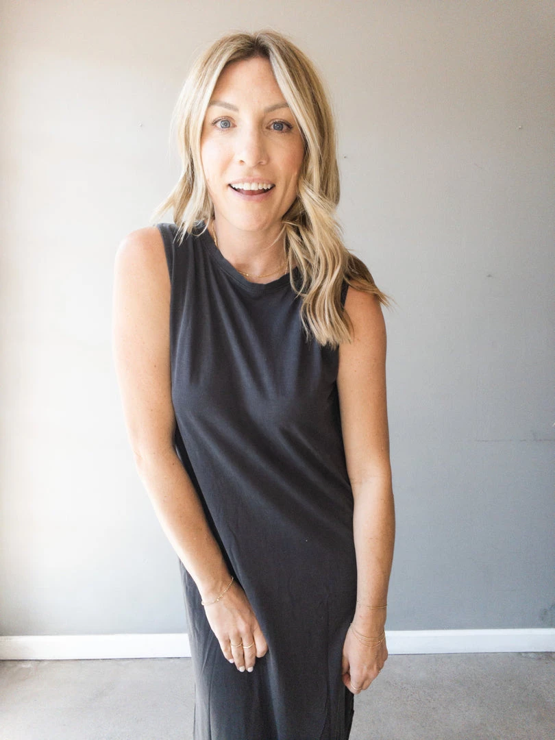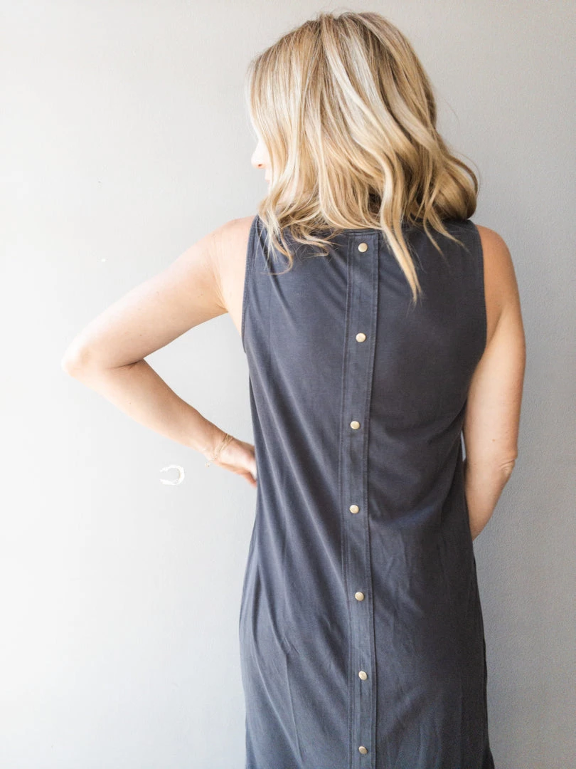 Made in a buttery soft cotton jersey fabric, this dress features a crew neckline and an easy fitting silhouette. Snap closures at the back and a shirt tail hemline elevate this style beyond a basic. This crazy comfortable dress is the only thing you’ll be wearing this season.