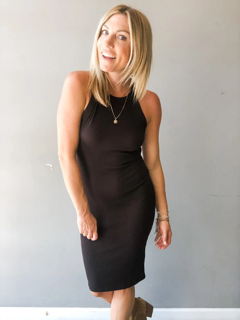 Day to night, or dusk ’til dawn? We’ll let you decide. This amazing body-skimming dress is made from the softest ribbed fabric. It has a super flattering high-neckline and midi-length hemline. Wear this dress to the office and then out for drinks with the girls. The styling possibilities are endless.