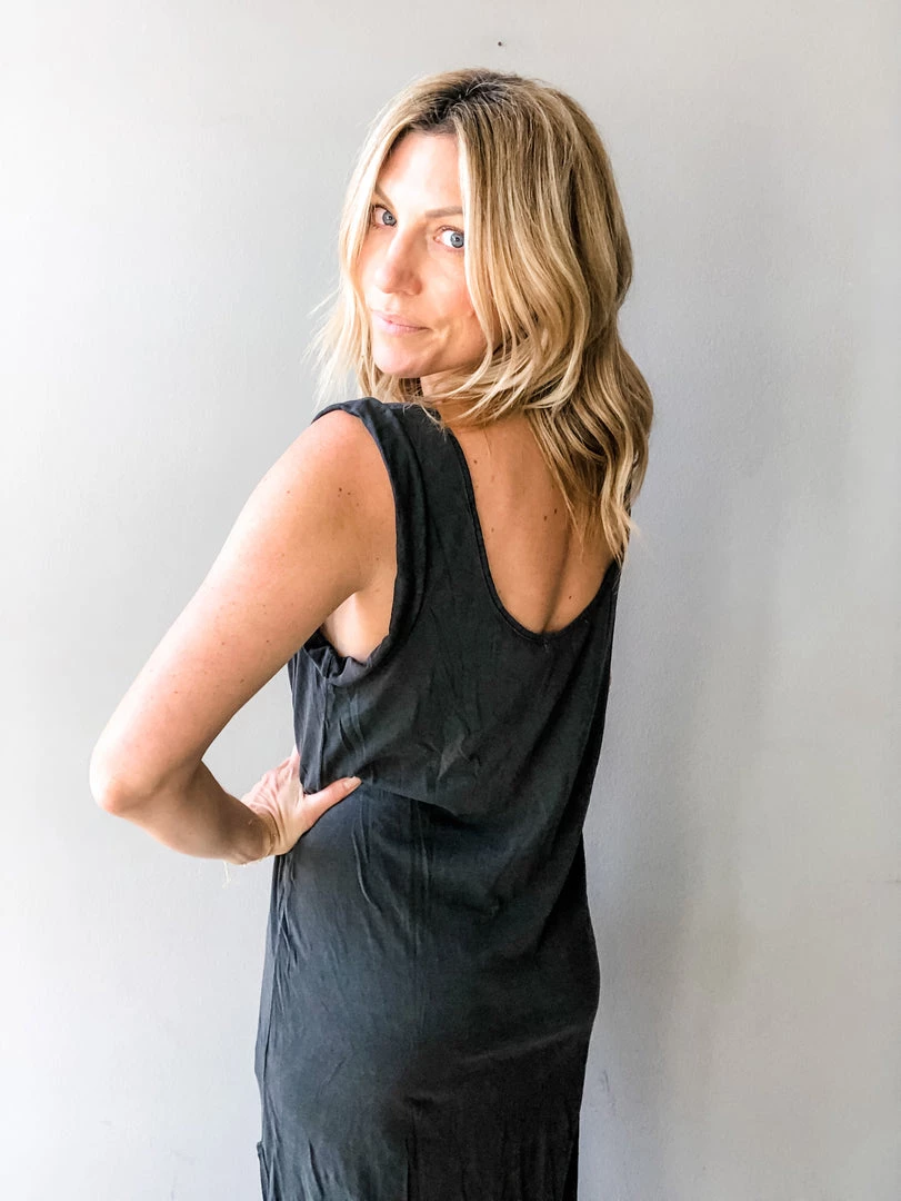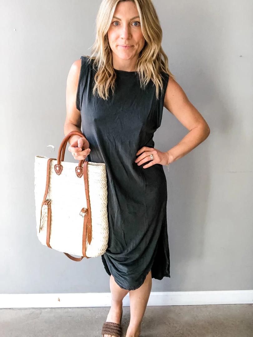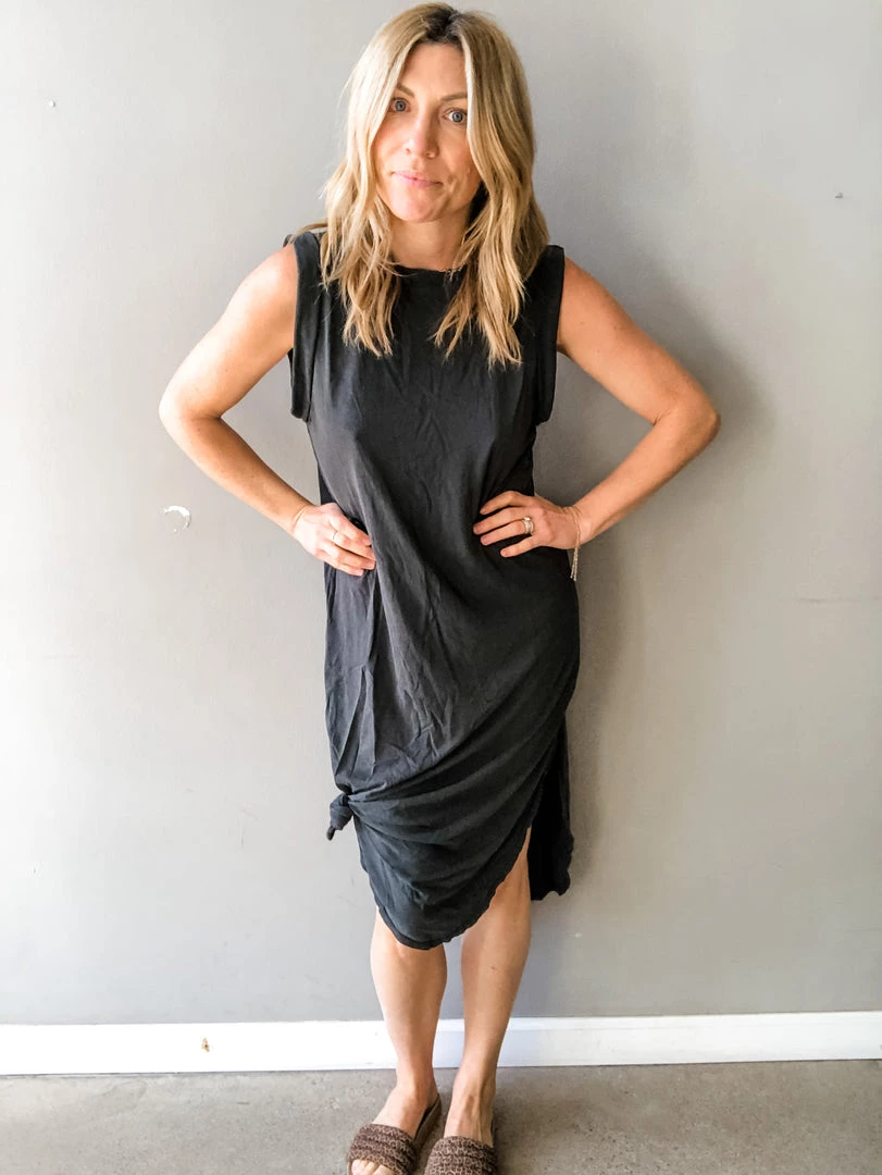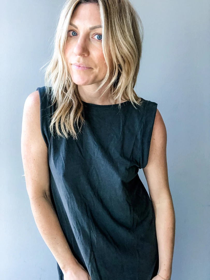 A piece with endless possibilities! A relaxed fitting dress with a high neck and low scoop back, rolled sleeves with a muscle tank cut in a lightweight drapery fabric. Toss on when poolside or pair with booties and a jacket for a night out.