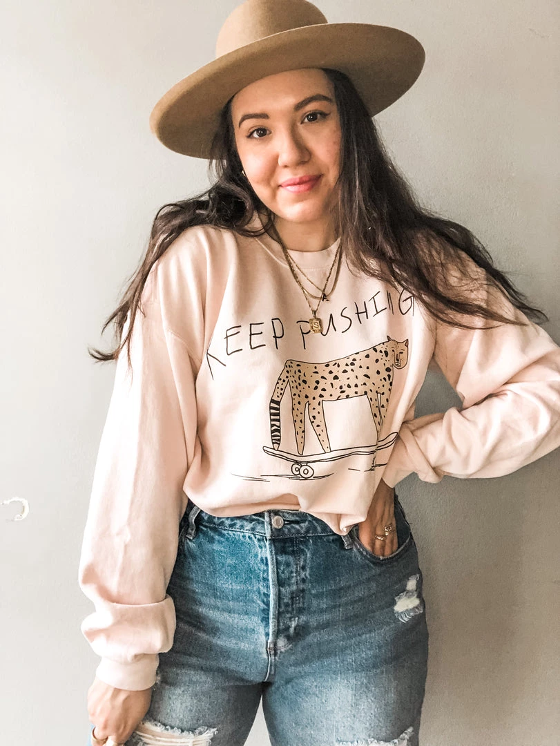 Just keep pushing. This lightweight crewneck sweatshirt is the perfect motivation you need to start off your day. Keep Pushing features a leopard on a skateboard graphic print, banded cuffs and hemline. Size up for that extra cozy fit.