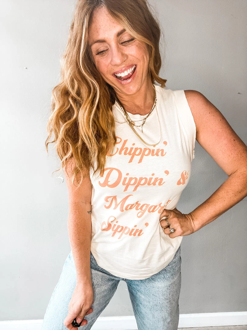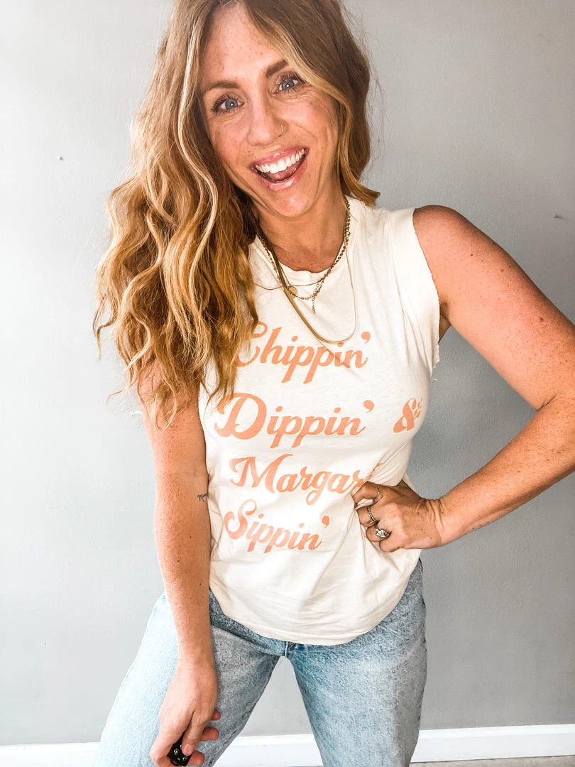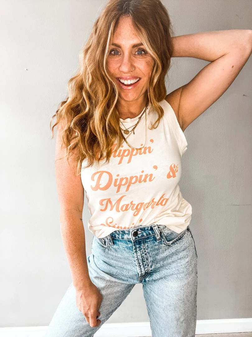 The Chippin, Dippin and Margarita Sippin Muscle Tank is a super soft, fitted muscle tank with all the things we love most about poolside hangs and summertime. This great fitting graphic tank is perfect with all your denim cutoffs and jeans.