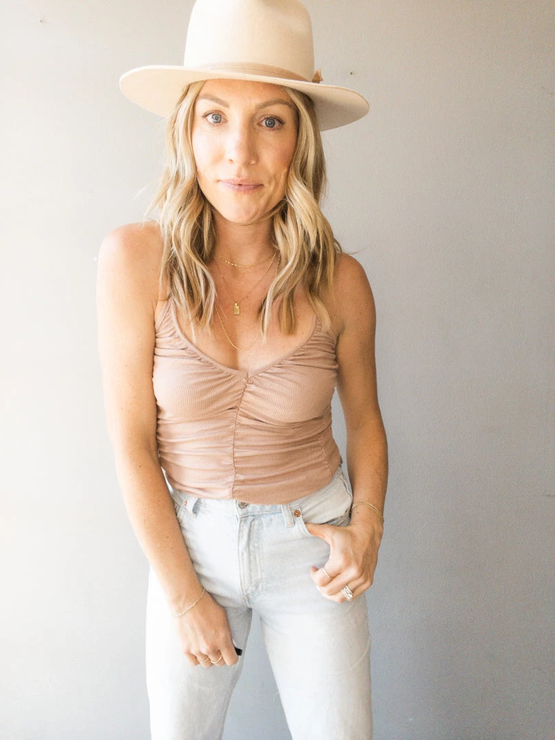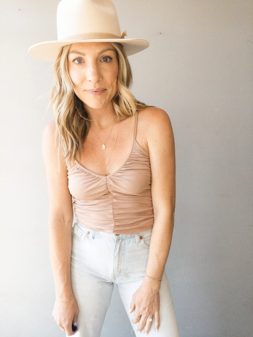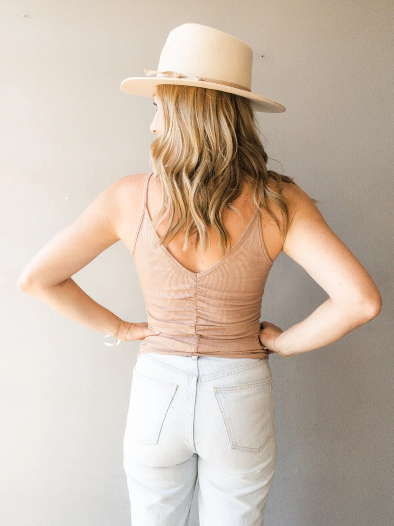 The Mesmerized Ruched Rib Tank is the ultimate for day to night wear. This tank is made of a super soft ribbed knit and features spaghetti straps with ruched center front, side and back details, a v-neck and has a slim fit. Throw it on with jeans, a skirt, or layer under your favorite jacket.