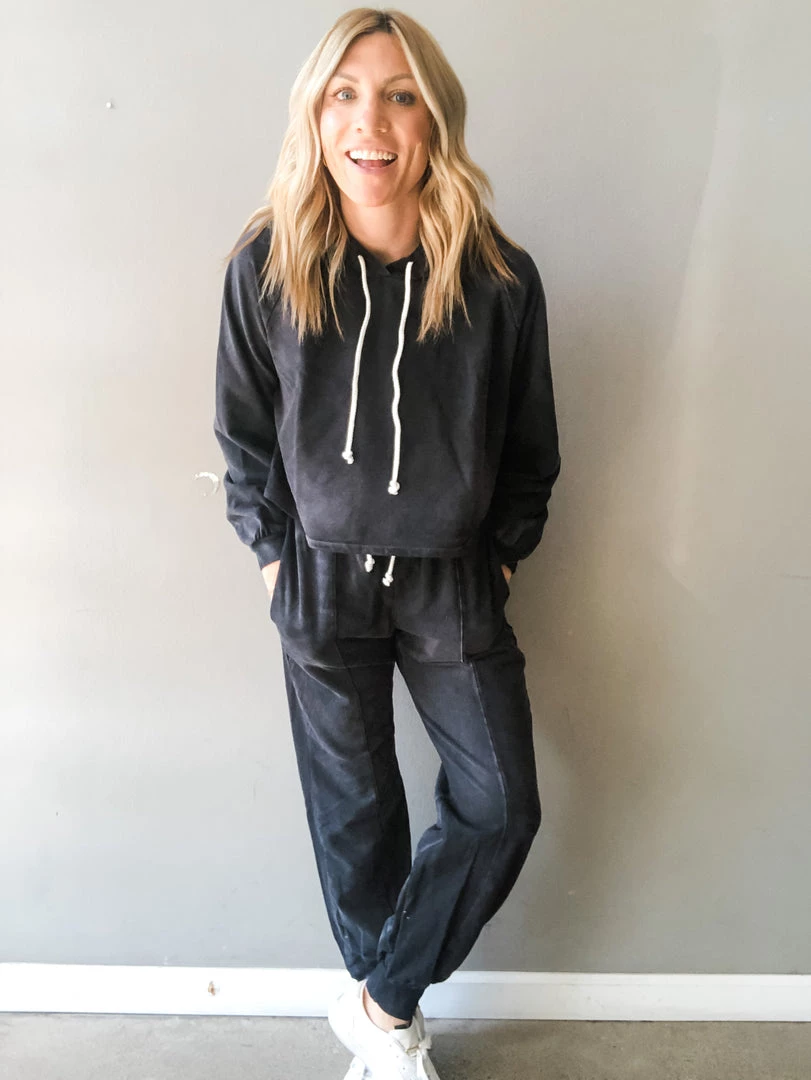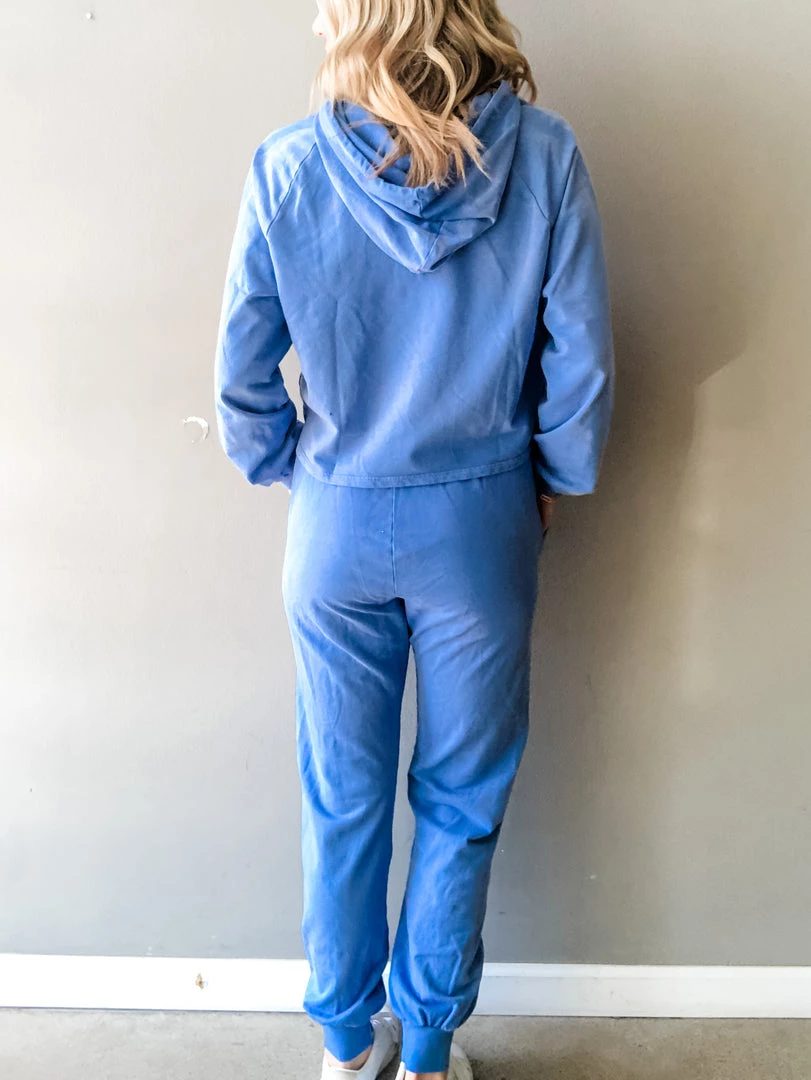 A washed french terry jogger with a vintage feel. High waisted with drawstring closure, side pockets, front seam detail and banded cuffs. Great for lounging, travel or wearing for casual hangs. A matching hoodie completes the set (sold separately) but we also love them solo.