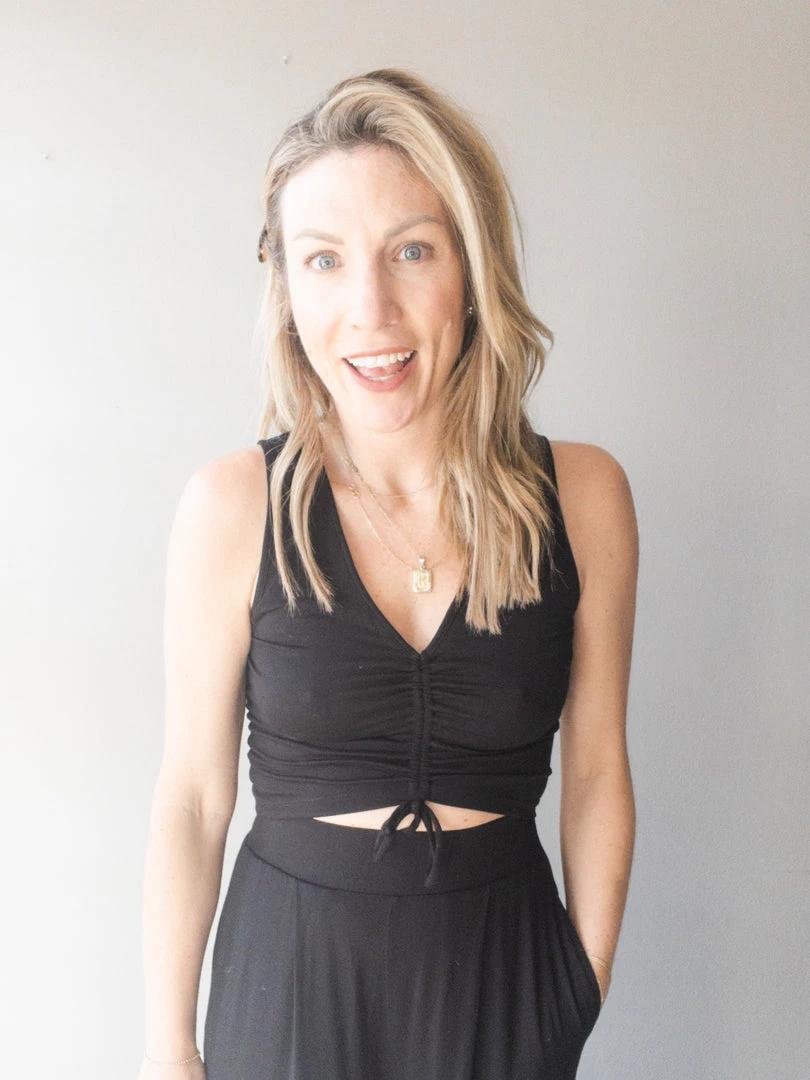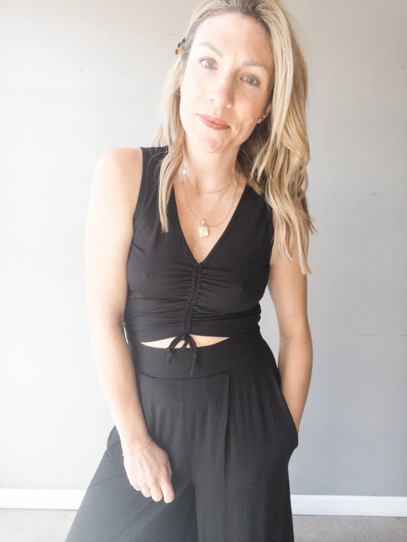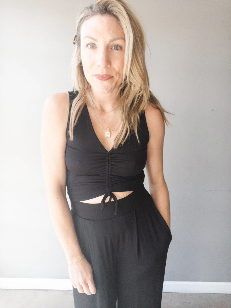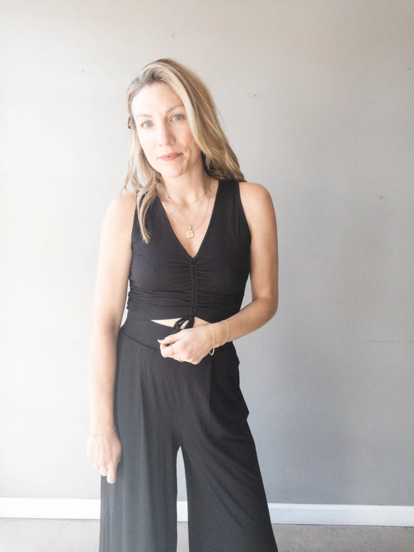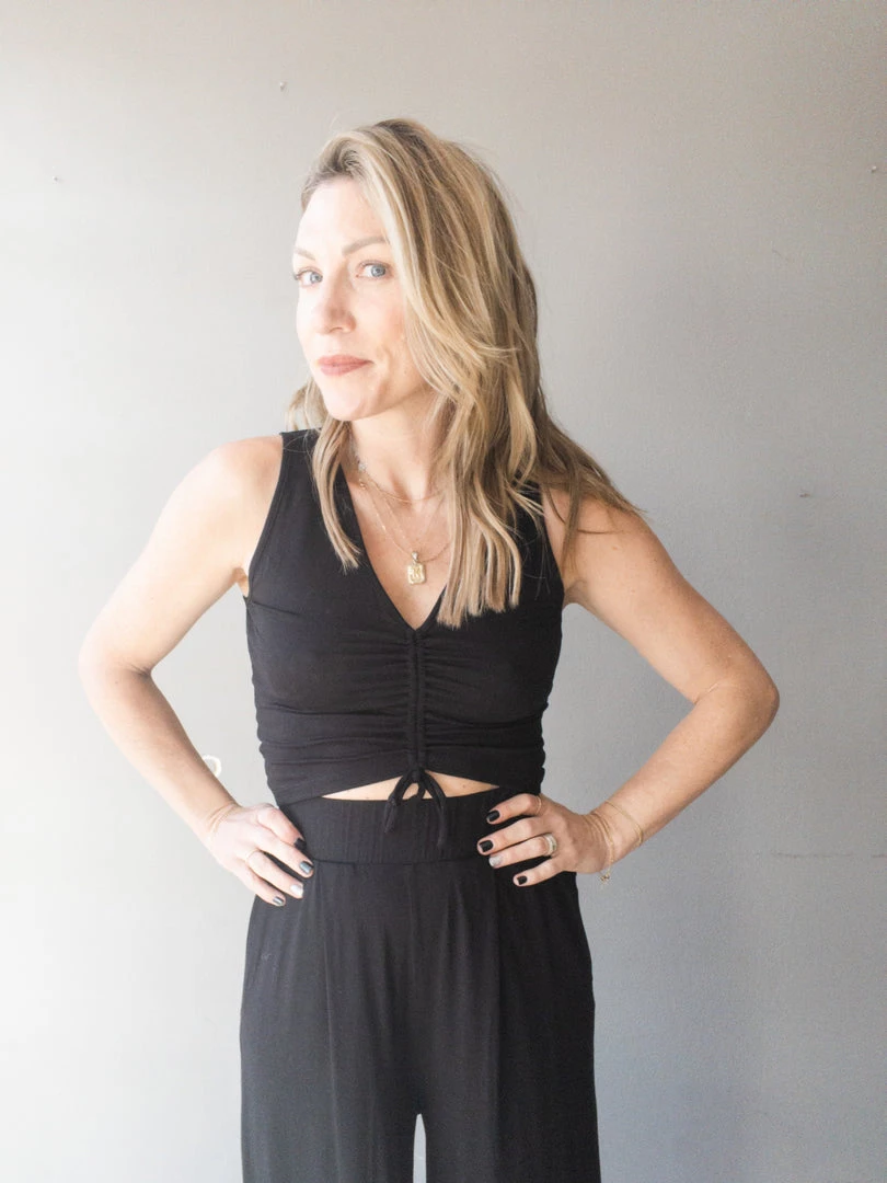 Your new LBT (little black tank). The Spellbound Tank has a v-neckline and slight racerback style. It has ruching and adjustable ties down the front center to give it a cropped effect. Wear this tank with the matching pants and you’ll have a 10/10 outfit. Slim Fit.