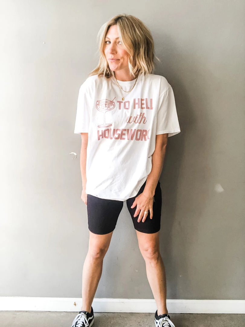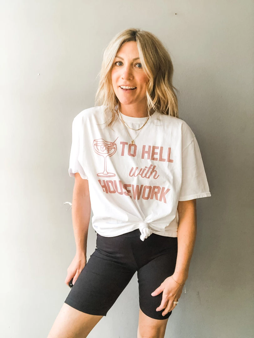 The shirt says it all. To Hell with Housework! Kick your feet up and serve yourself another glass. A crew neck tee made with 100% cotton fabric for a yummy feel with a perfectly oversized fit. Pair with bike shorts and sneakers for an easy ‘fit we love.