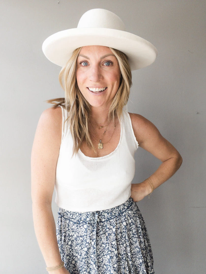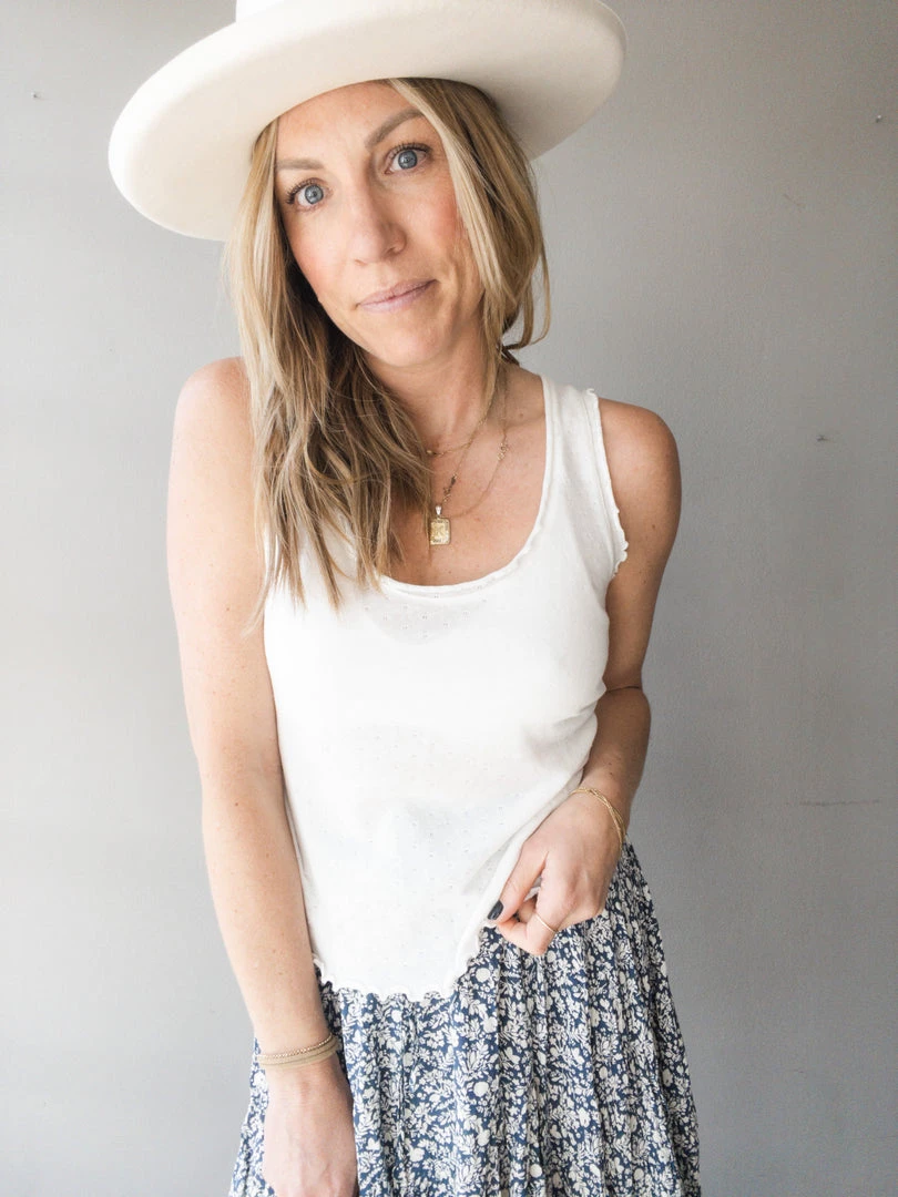 Time to re-up on your white tank basics.Ā This tank is made from lightweight poinetelle fabric and is slim fitting. It has a square neckline and thick straps. Lettuce stitching along the neck and hemline are the cherry on top of this sweet tank. Can literally pair with everything, adding a soft feminine touch.Ā Fitted.