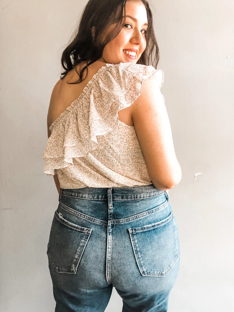 We love the itsy bitsy floral print of this one shoulder number. A fun and flirty update with ruffle neckline and exposed shoulder. Double button closure with cheeky cut bottom. Elasticated neckline for easy fitting and a slightly loose torso for a blousy look you can rock for work or play with jeans or cutoffs.
