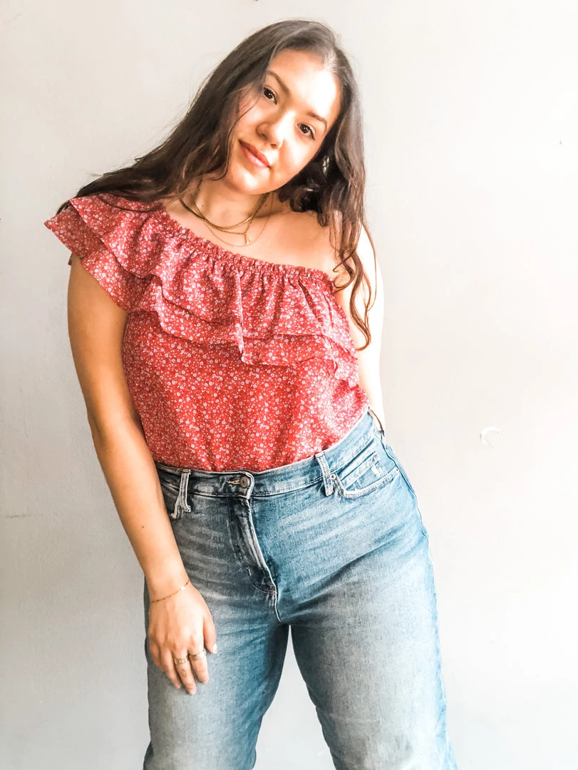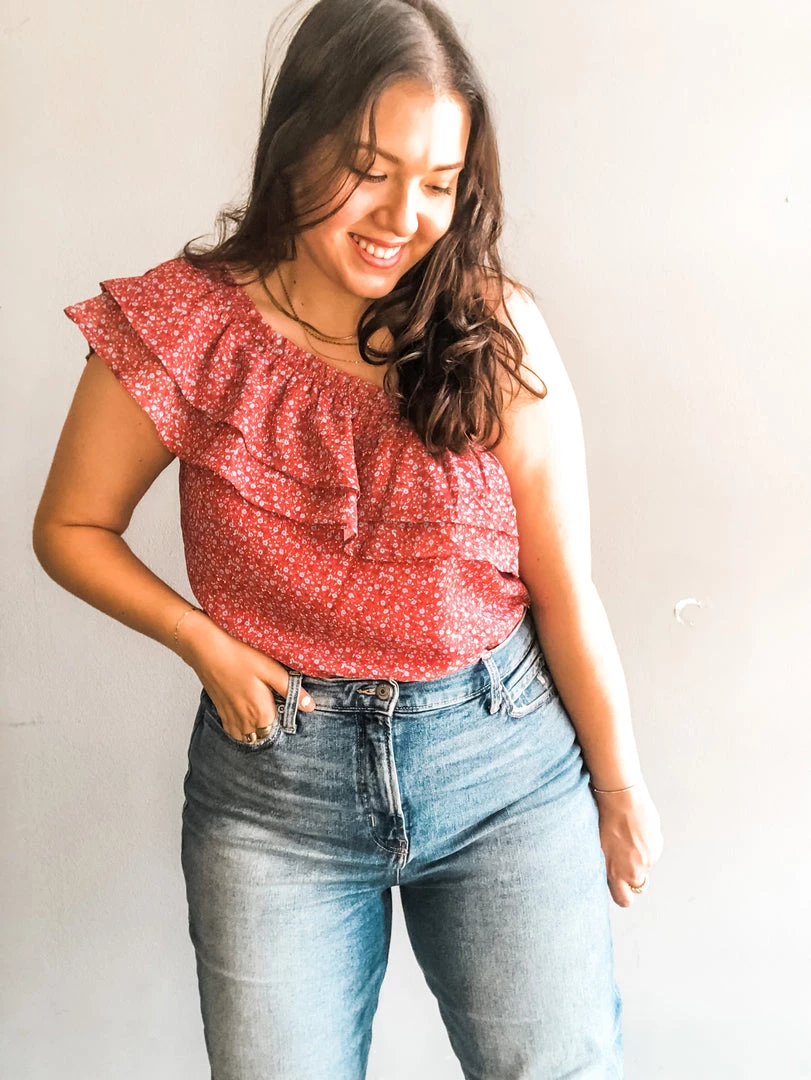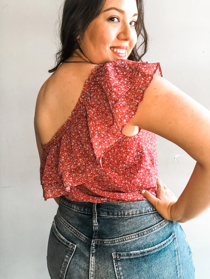 We love the itsy bitsy floral print of this one shoulder number. A fun and flirty update with ruffle neckline and exposed shoulder. Double button closure with cheeky cut bottom. Elasticated neckline for easy fitting and a slightly loose torso for a blousy look you can rock for work or play with jeans or cutoffs.
