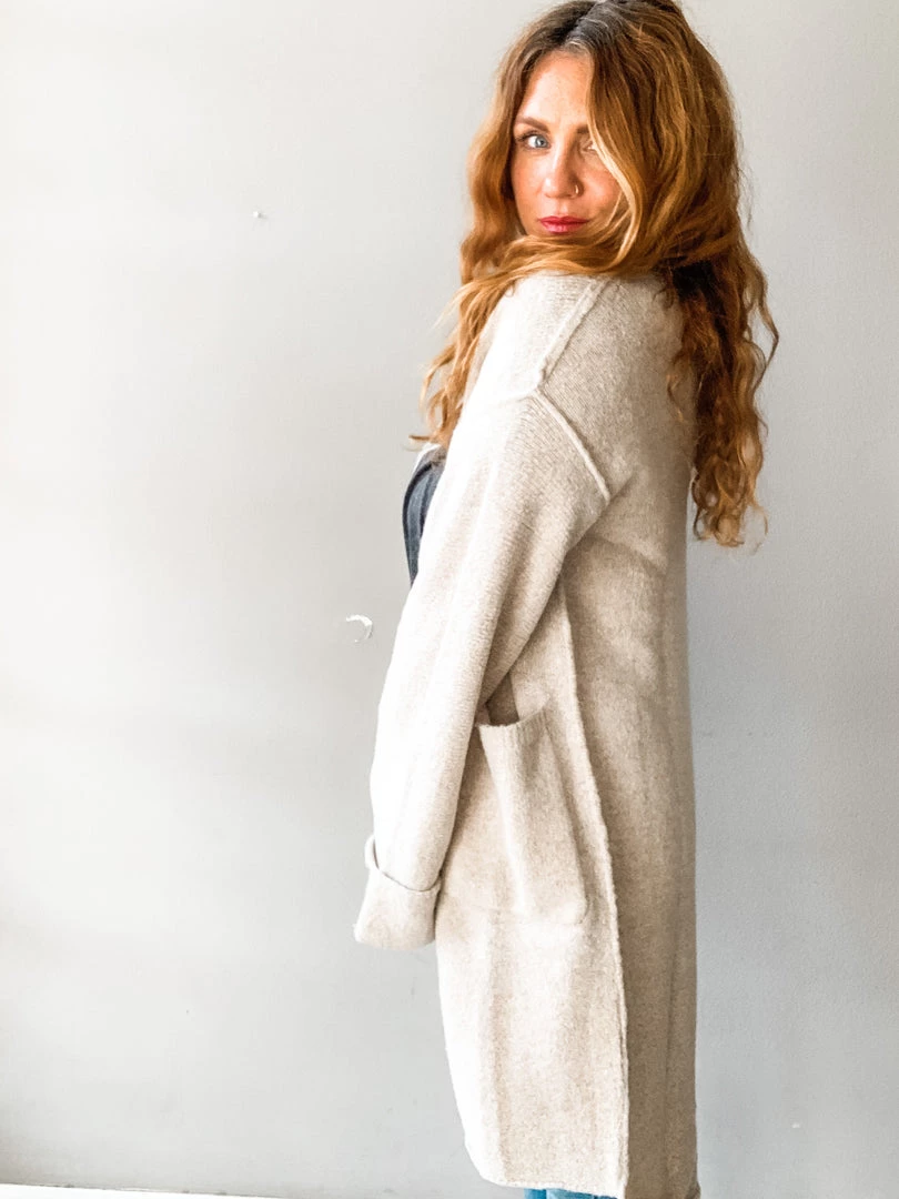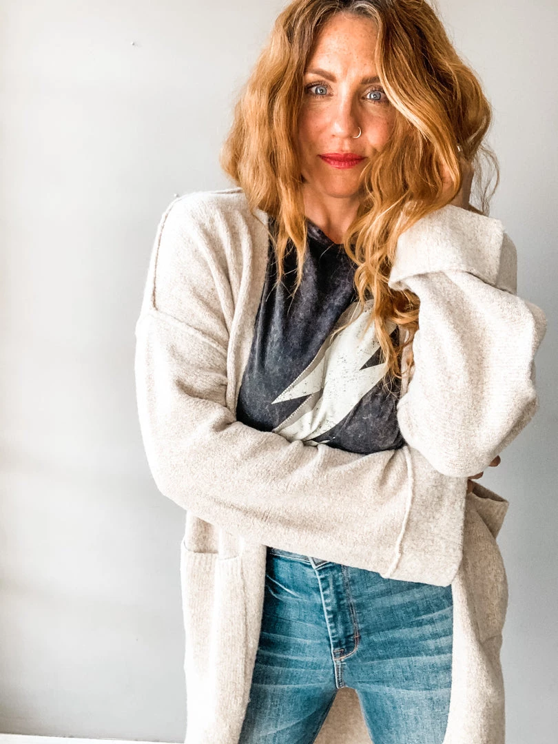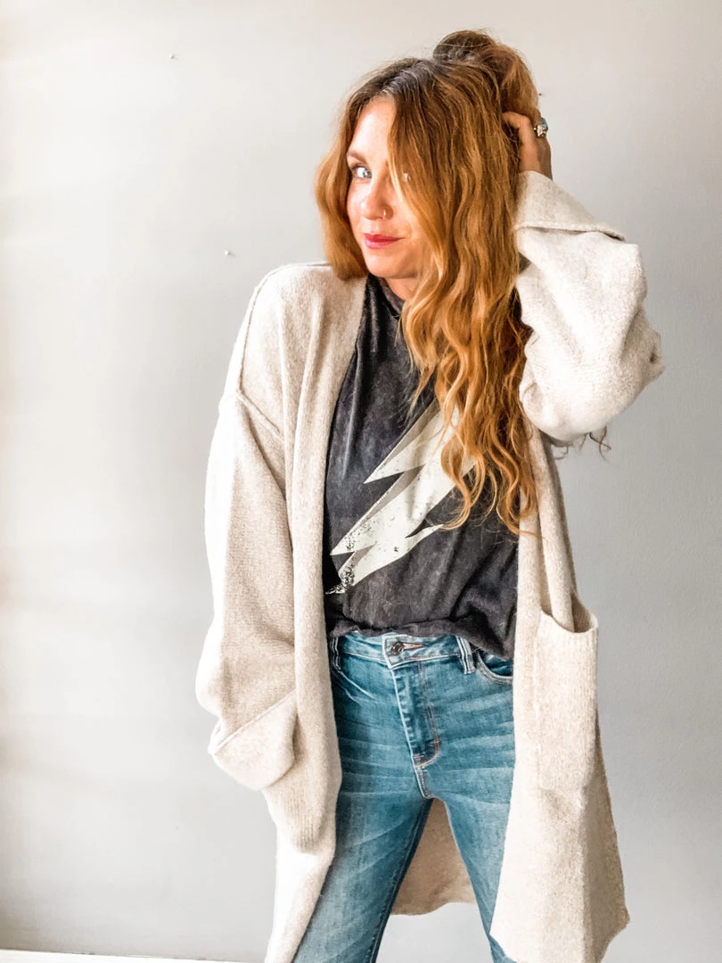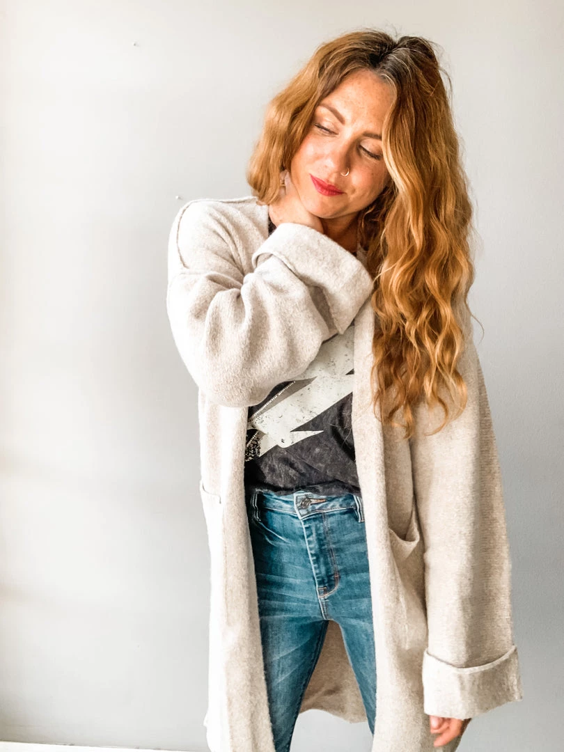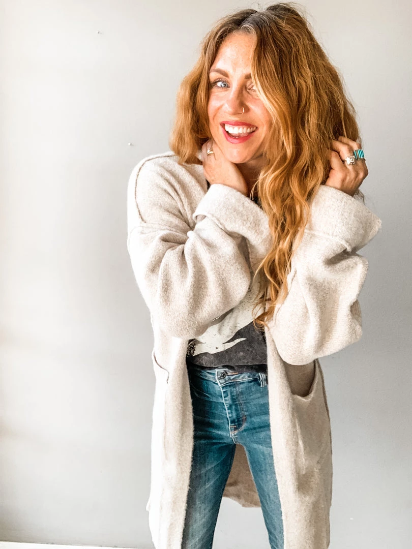 The Cup of Joe Cardigan is a delicious heather grey/taupe combo that we love! Super soft, longer, oversized fit with deep side pockets and a rolled sleeve that is perfect for pairing over all your Fall favorites!