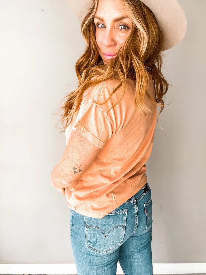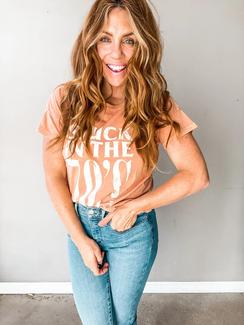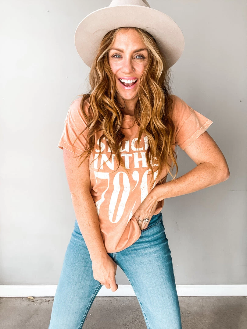 Stuck in the 70’s? You aren’t alone girl. Our Stuck in the 70’s Tee is a boxy slightly cropped tee that will pair perfectly with all your fav high rise denim and cutoffs. We love the peachy blush tone of this easy, take everywhere, wear maybe everyday, grpahic tee!