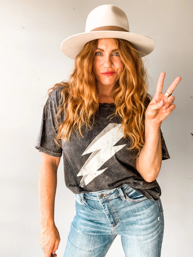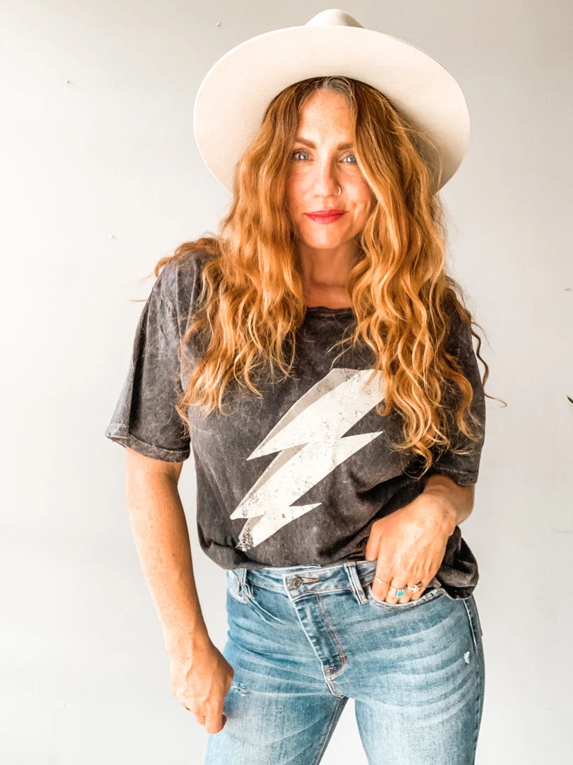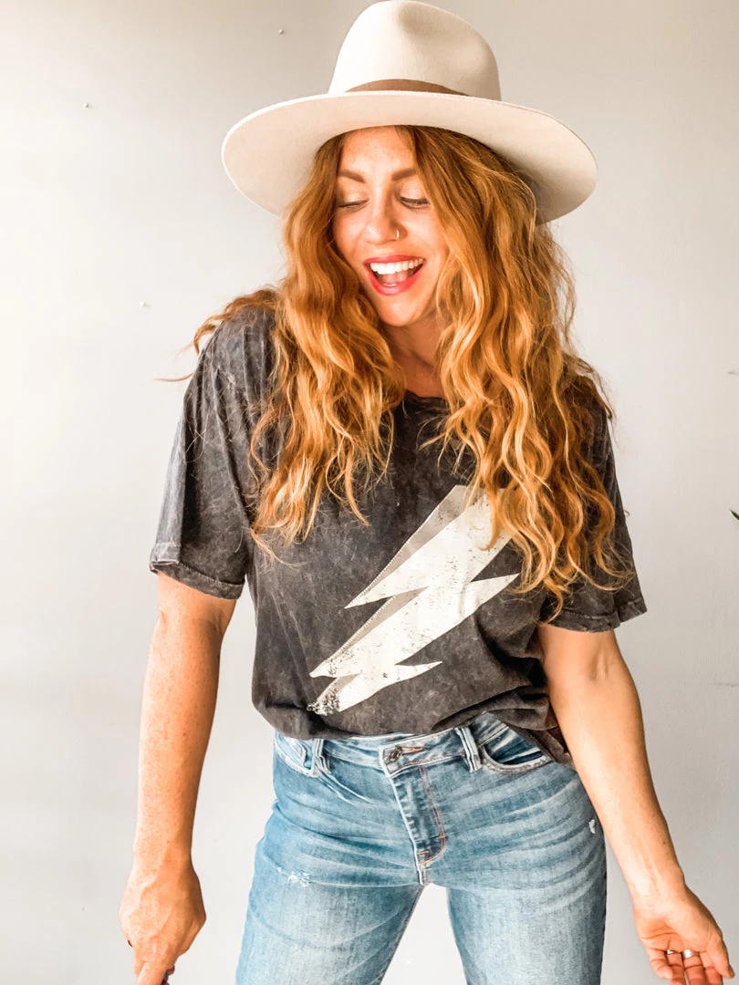 The Lightning Strike Graphic Tee is a great fun basic with a a rock and roll vibe. We love the slight distressing details along the neckline of this oversized, vintage black tee that will compliment any and all bottoms!