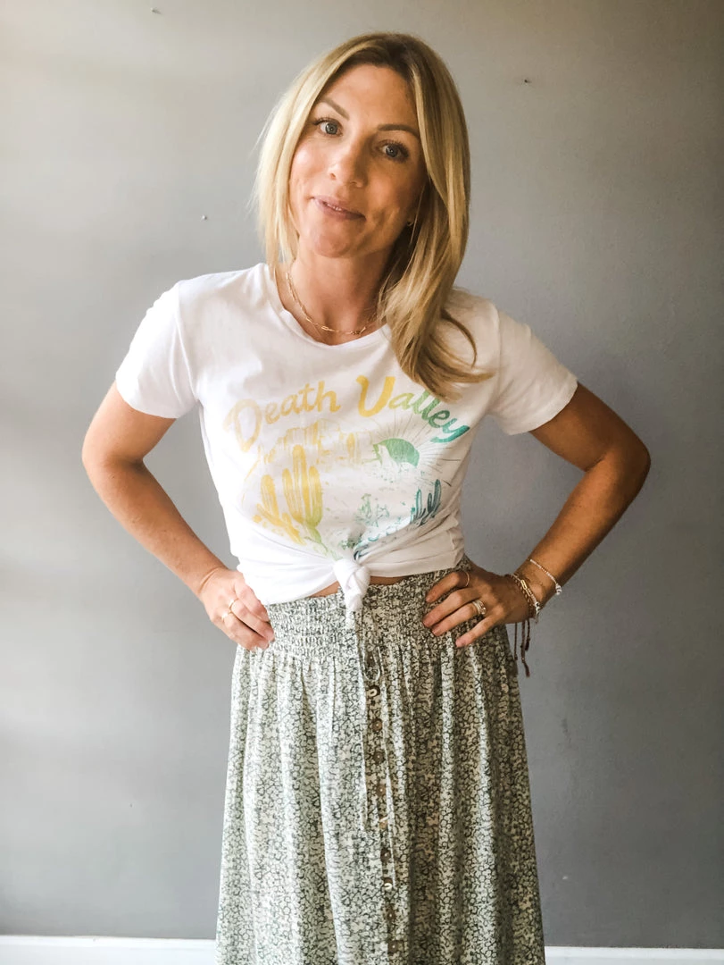 We just can’t get enough of a flowy midi skirt!! It’s the perfect toss on piece for summer. Wear it with one of our fav Z Supply tanks or a graphic tee and some slides or toss it over your swimmie as you head into town for a little post swim bite. The Mimi Skirt is a sage green number with fine floral print, functioning button front and elastic high waist with adjustable tie details.