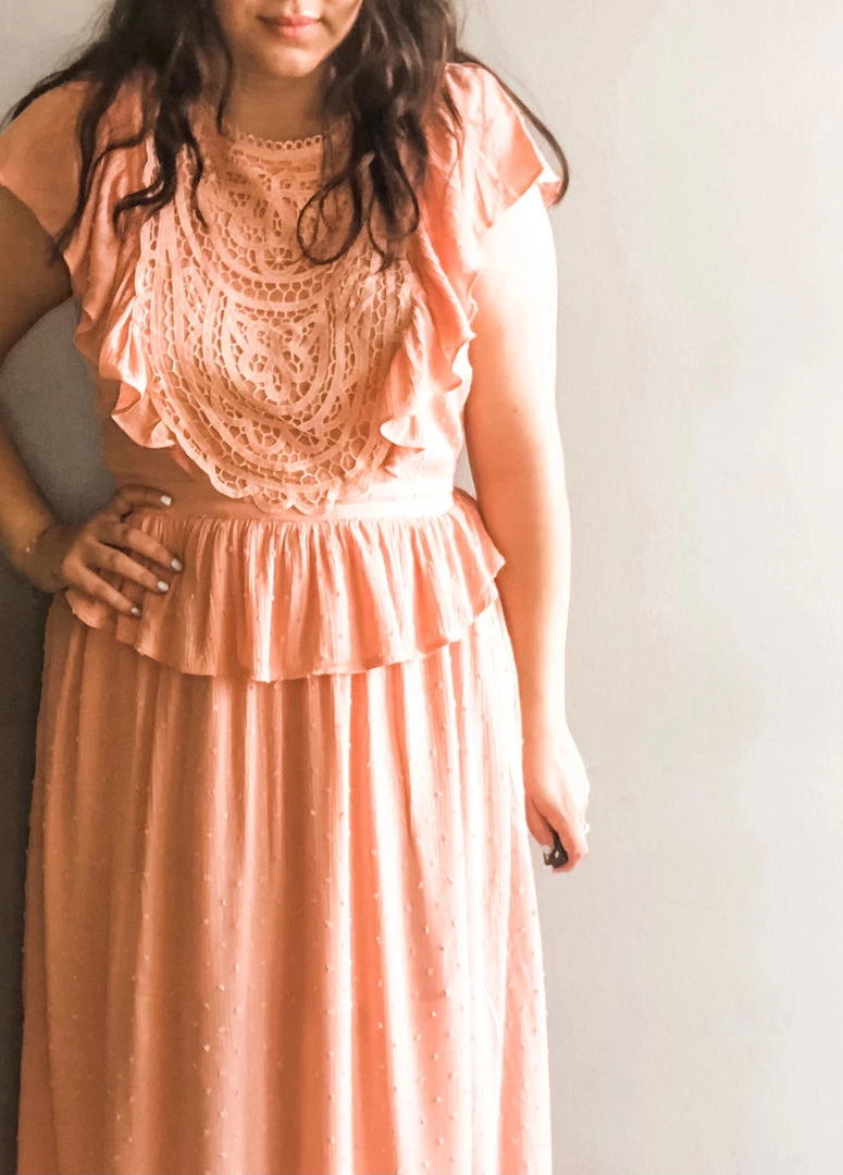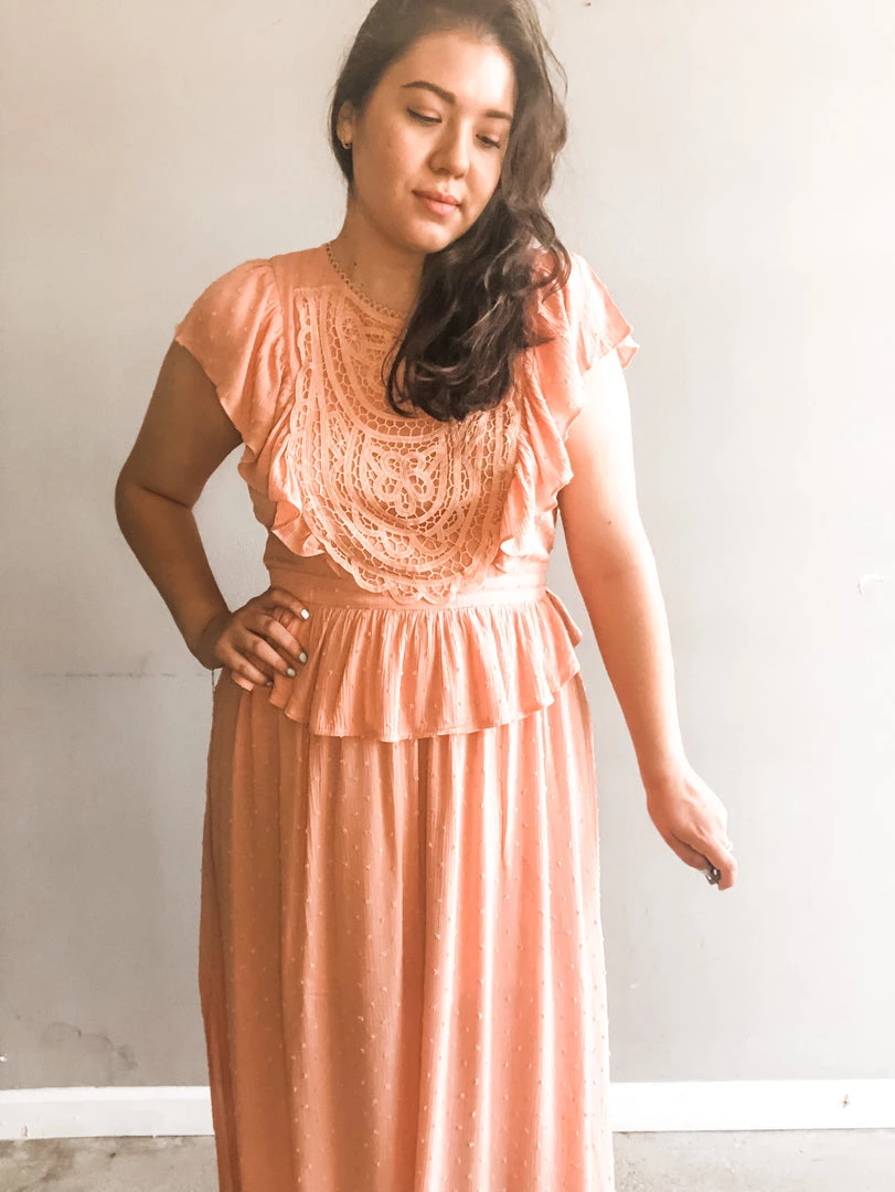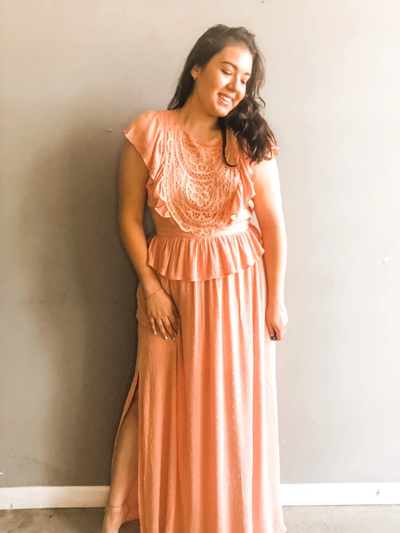 Kell and I saw this maxi and HAD to have it. Feminine, fun and full of little details that will make your outfit pop!!! We love the fun front lace details and peplum ruffle detail. A side slit and open back adds to this picture perfect dress for any special occasion!!!