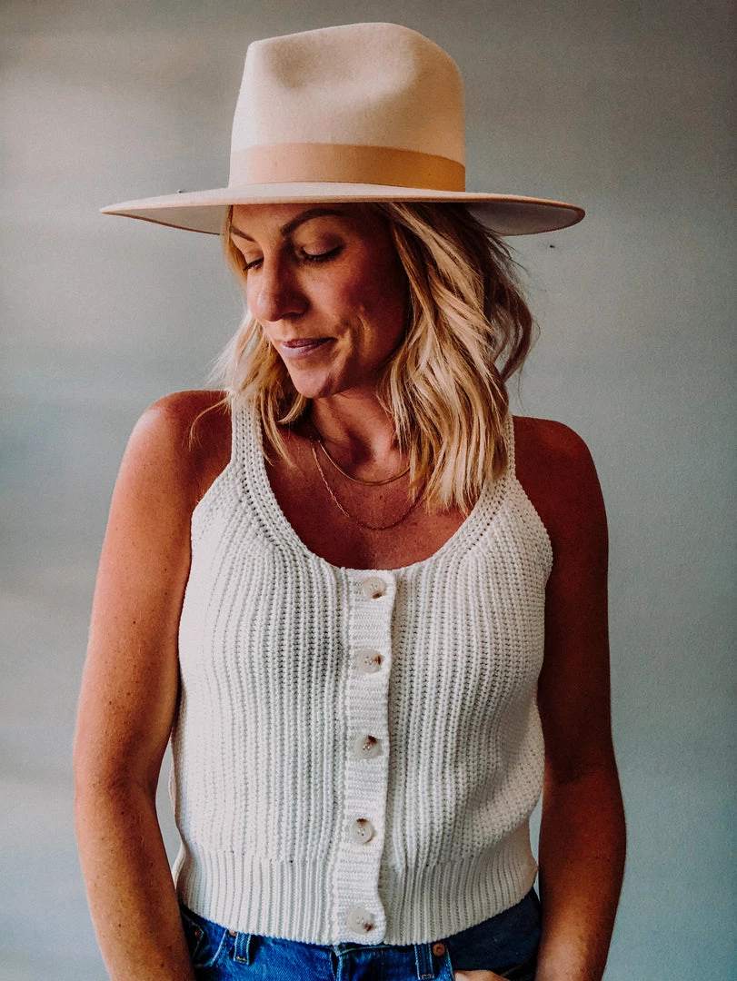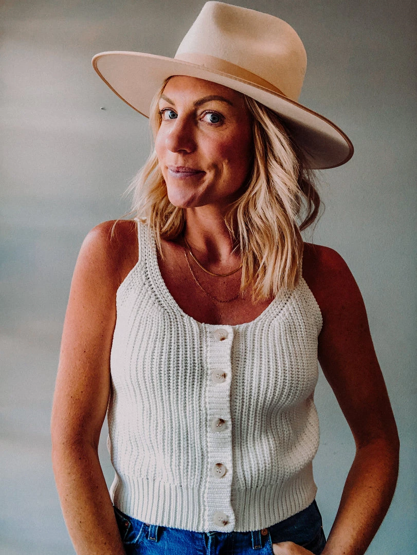 Taking a basic tank to the next level. This soft open knit tank with front button closure gives a sweet and sophisticated look to your good ole tee shirt and jeans look. We love it paired with denim or a midi skirt for a little more dressed up occasion.