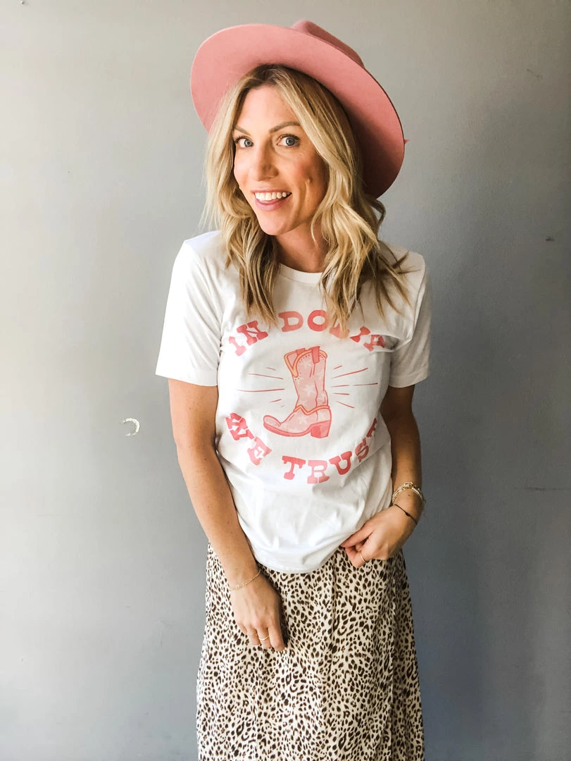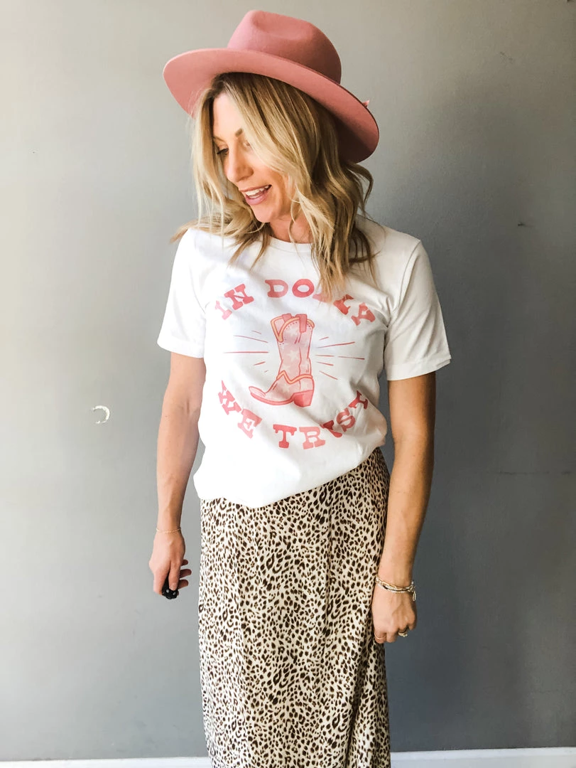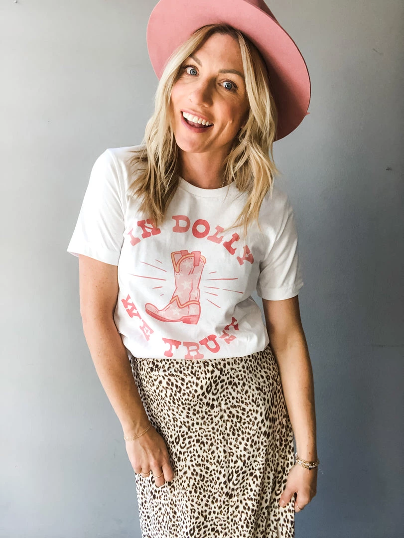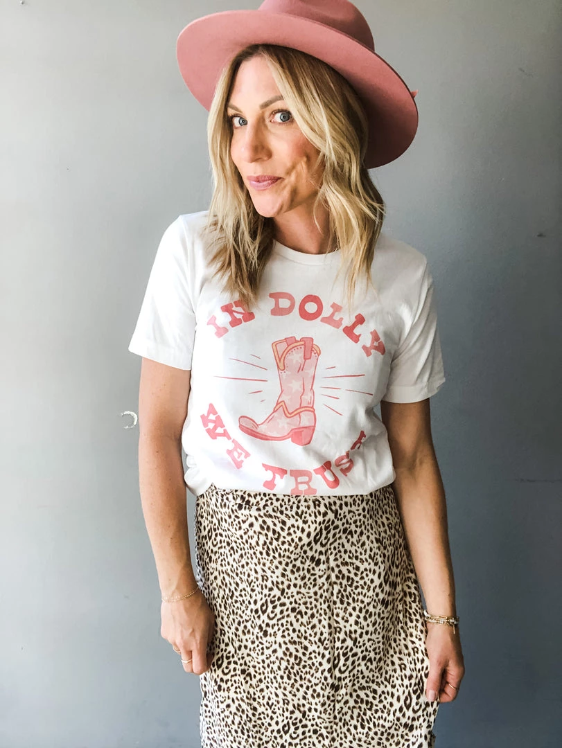 This tee speaks for itself. In Dolly We Trust country graphic tee on a white loose fitting crew neck. For all our country loving, Dolly Parton fans, this one is for you. Pair with denim or a fun midi skirt and your fav booties.