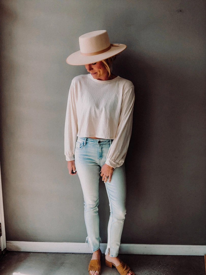 The Amelia Skinny is a mid rise skinny jean in a super light blue wash. These jeans have a zipper and button front closure with a split frayed hem detail and hit just below the belly button. A perfect summer denim to pair with slides and a tee for a causal look we love.