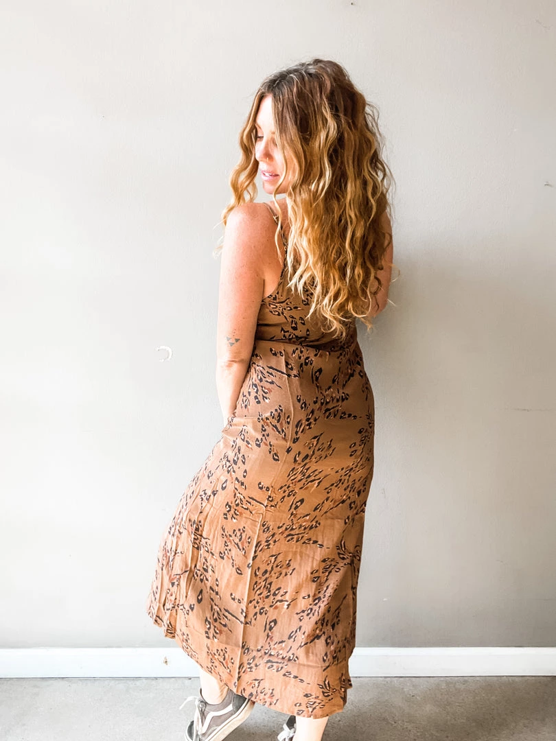The Monica is a sleek slip style midi dress in a fun and flirty animal print. Wear with sneakers and gold hoop earrings for a more casual look, or throw on a leather jacket over her for a night out. The Monica has a flatteirng double v-neck and a front slit.
