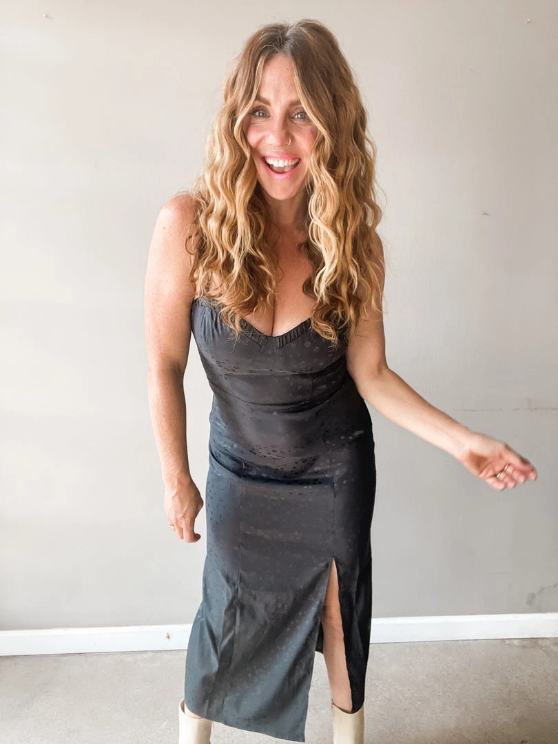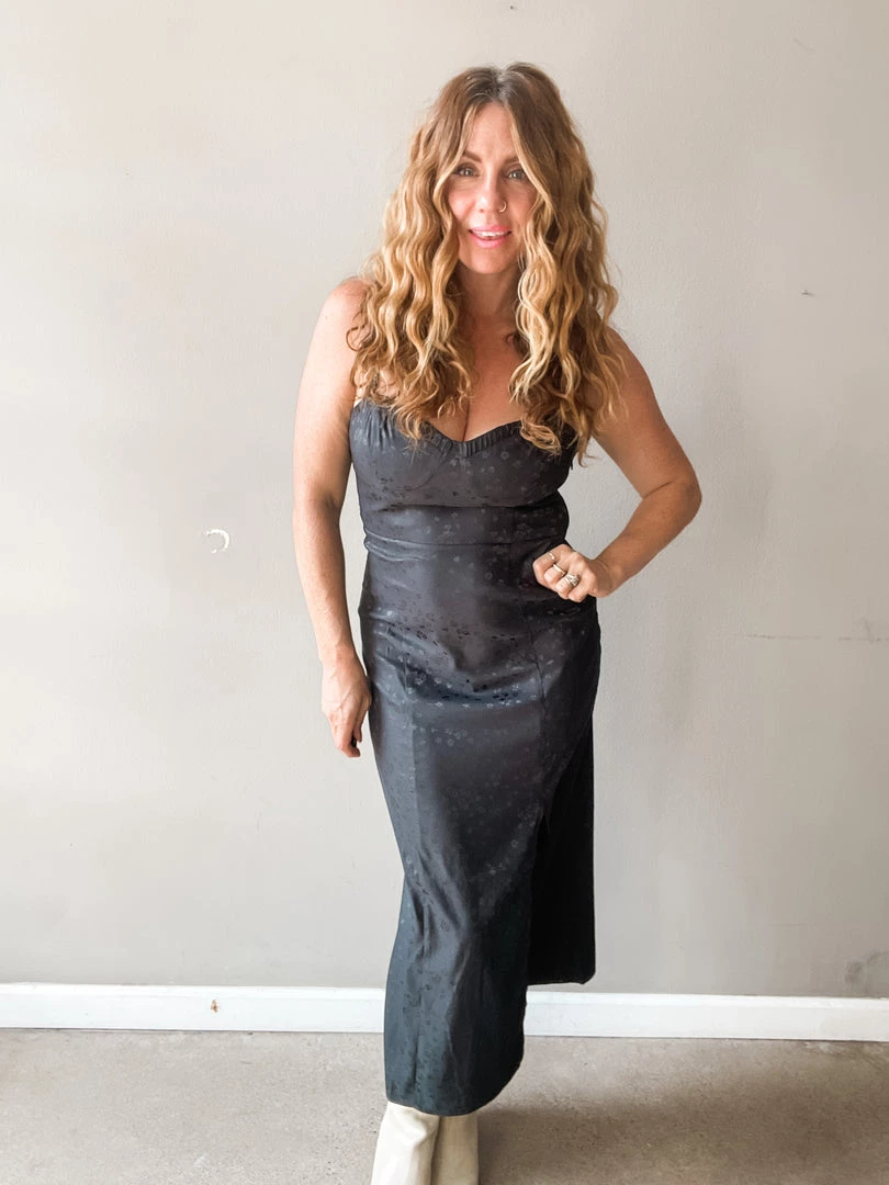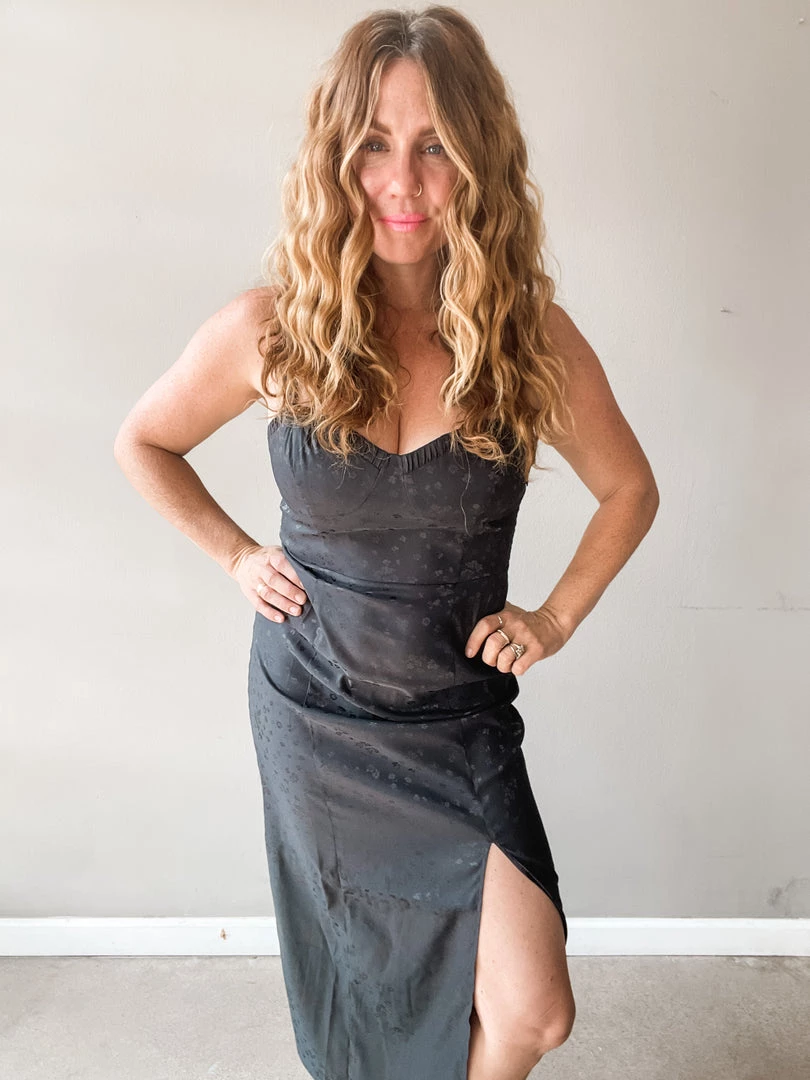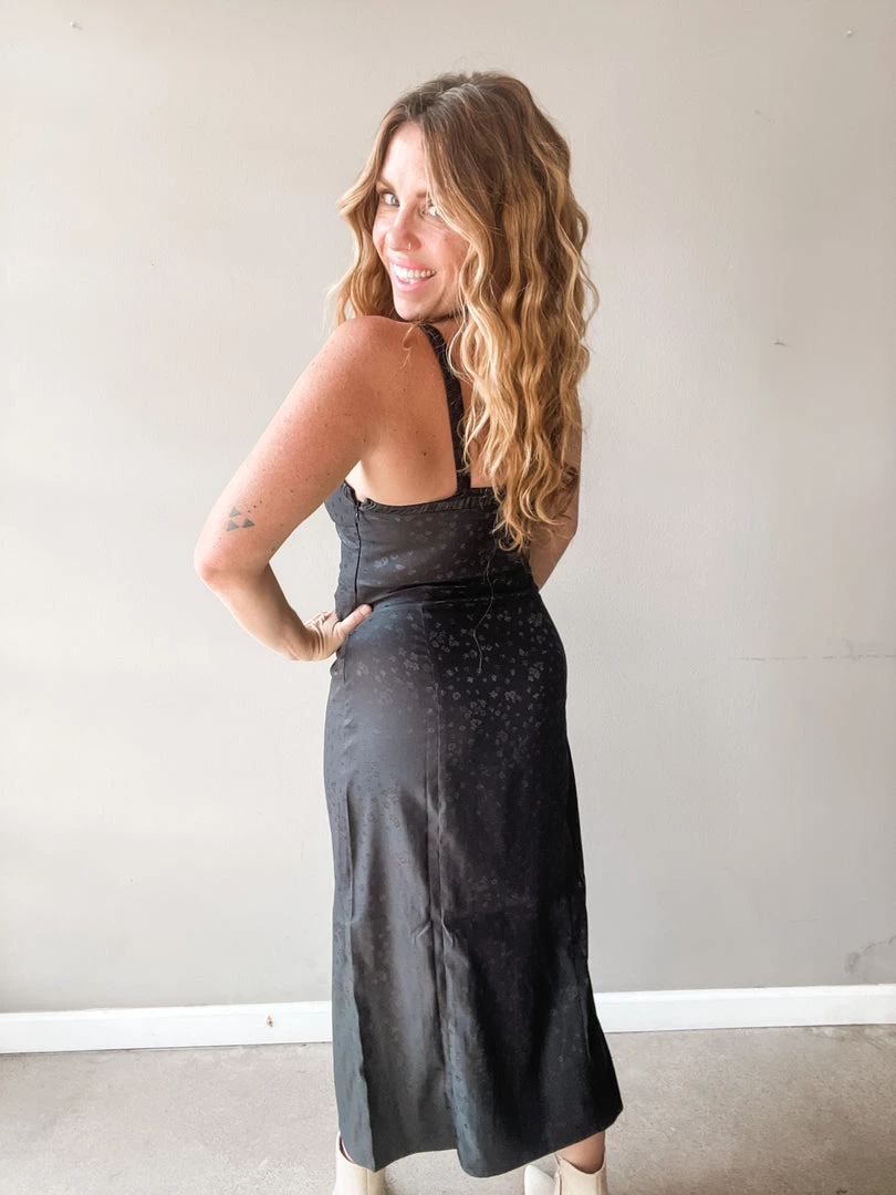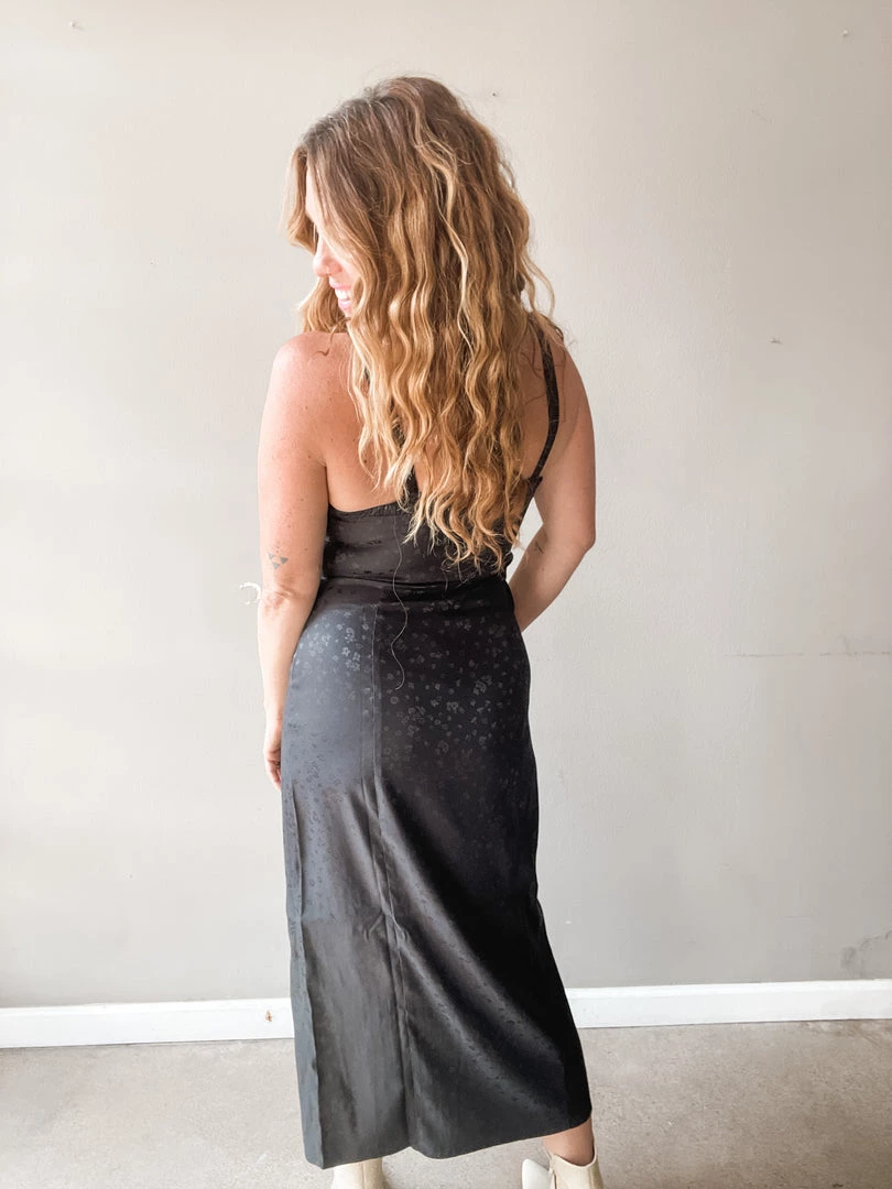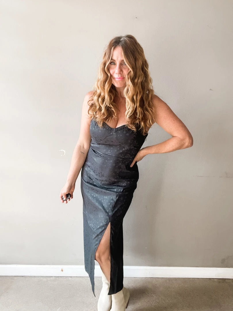 Embrace your feminine side this fall! The Darlene midi dress is every bit flirty as it is fashionable, featuring a sweetheart corset style bust and a slit up the left side. Pair with booties, and your next night out is covered! The black snake-like print goes with everything, so prepare for plenty of wear.