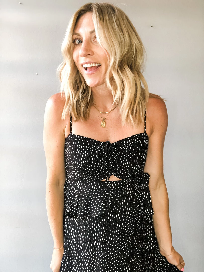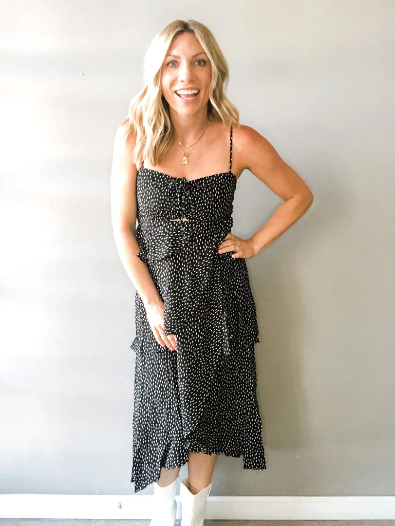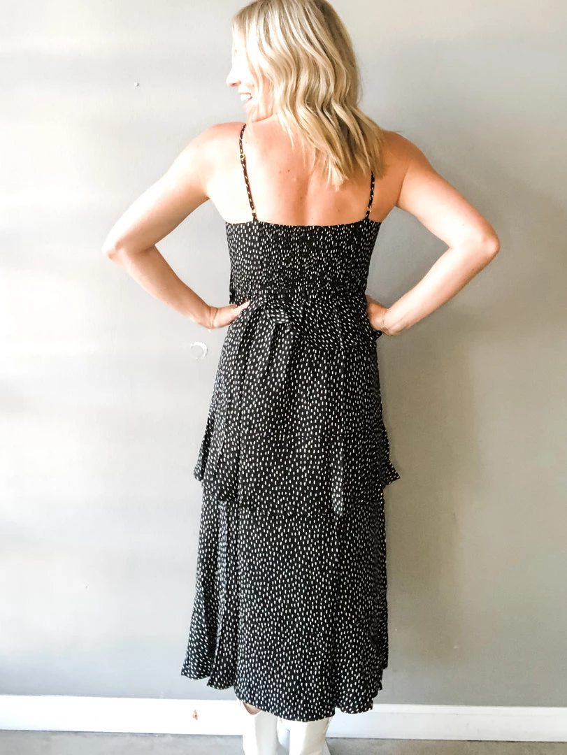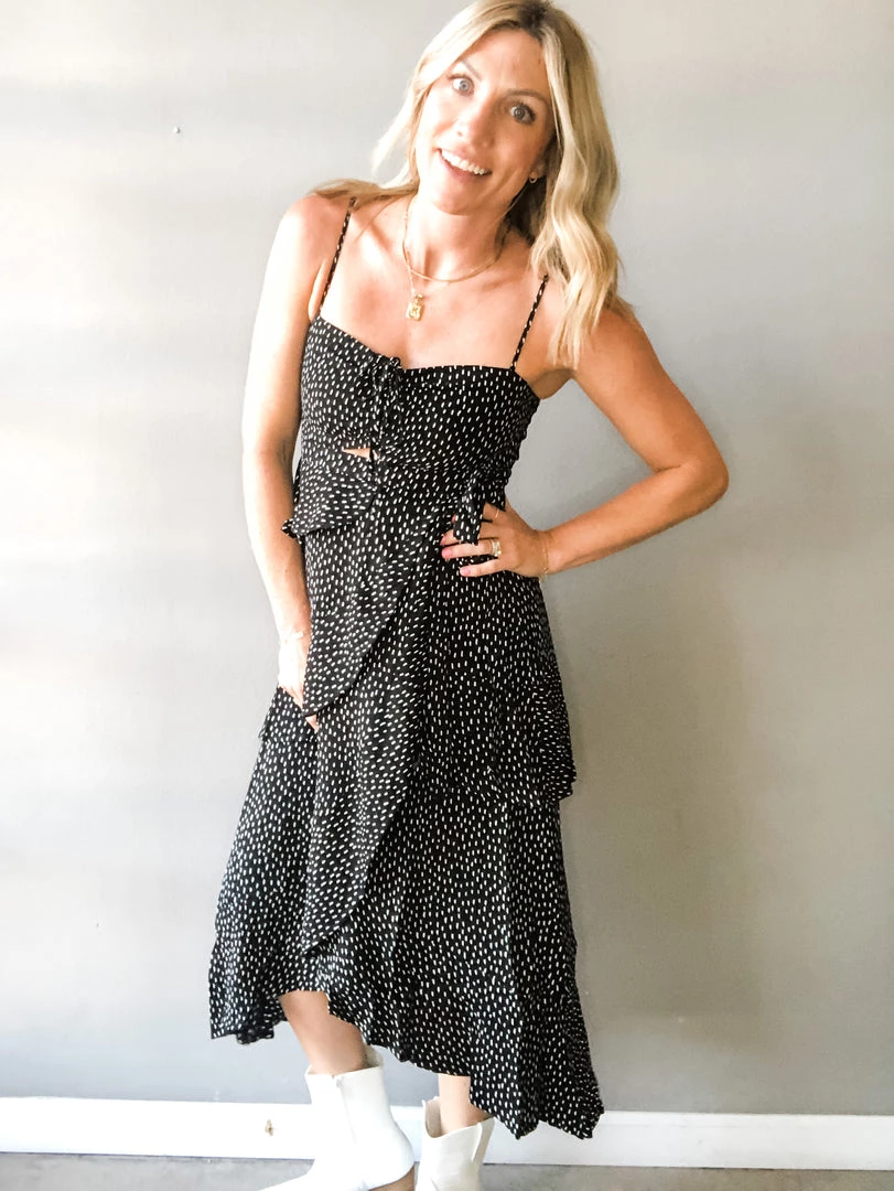 We love fun statement pieces like the Elliot midi dress, stepping out of the box for your special outings! This ruffle tiered midi dress has a mini cutout at the center, wrap tie at the waist, smocked back and adjustable spaghetti shoulder straps. Pair with heels or some fun booties and turn heads all night long.