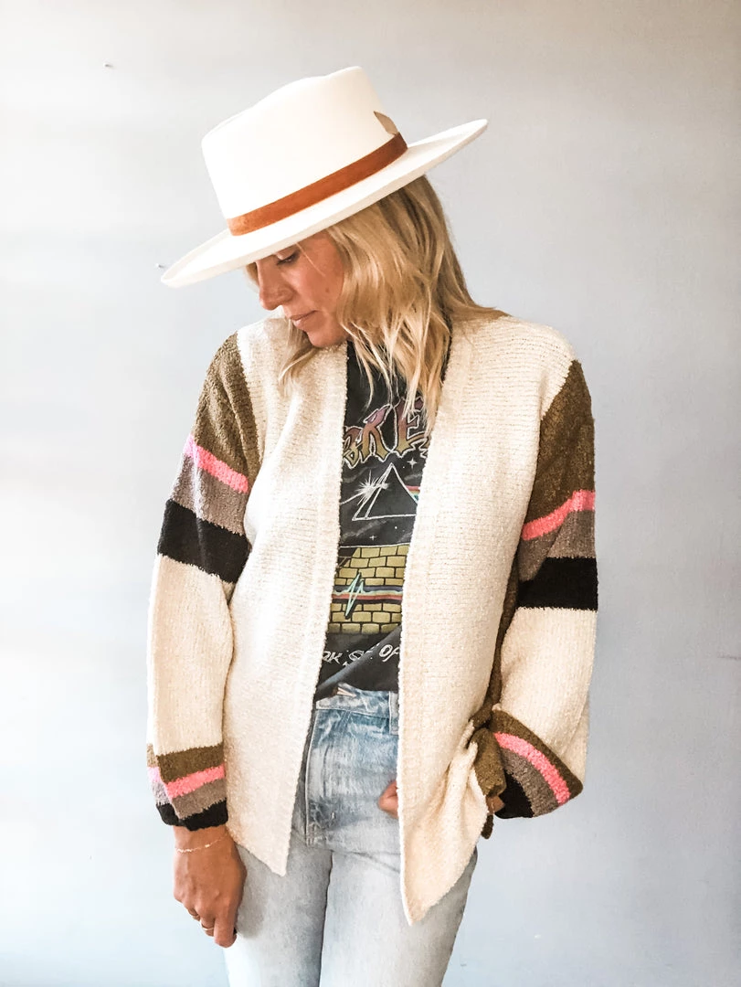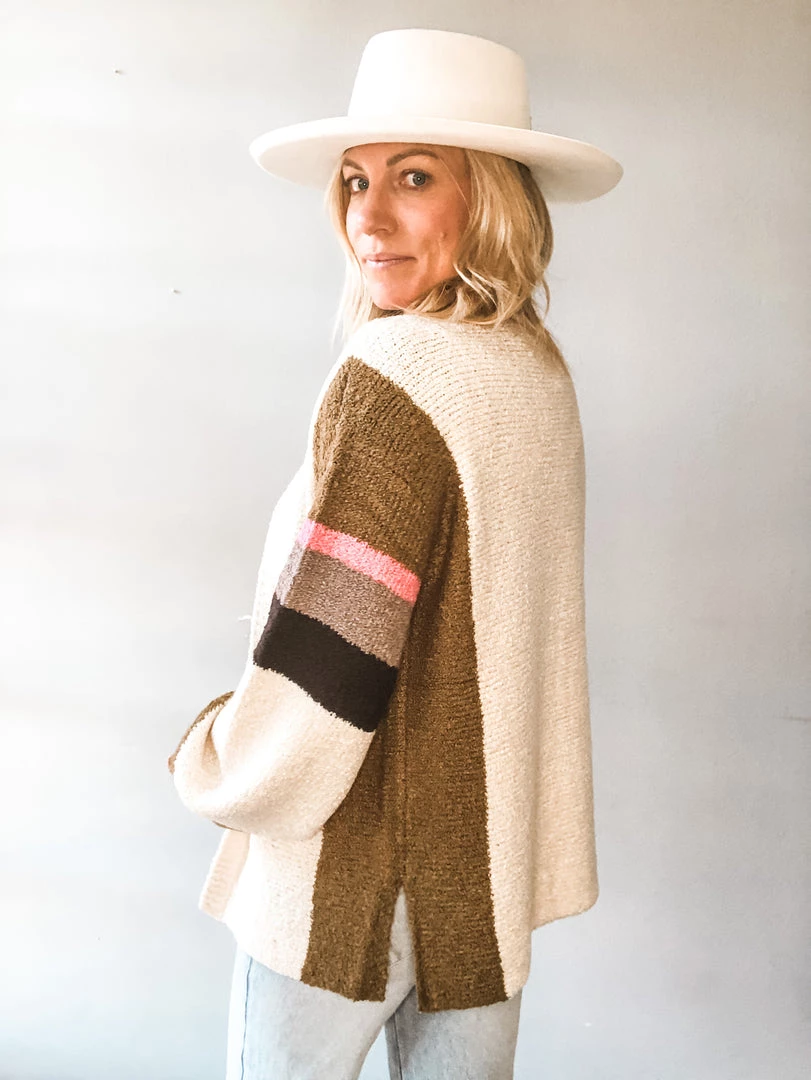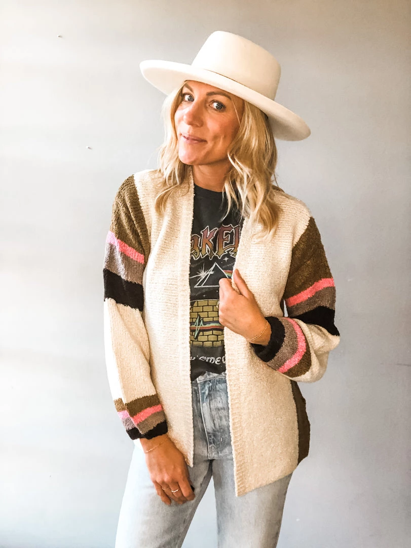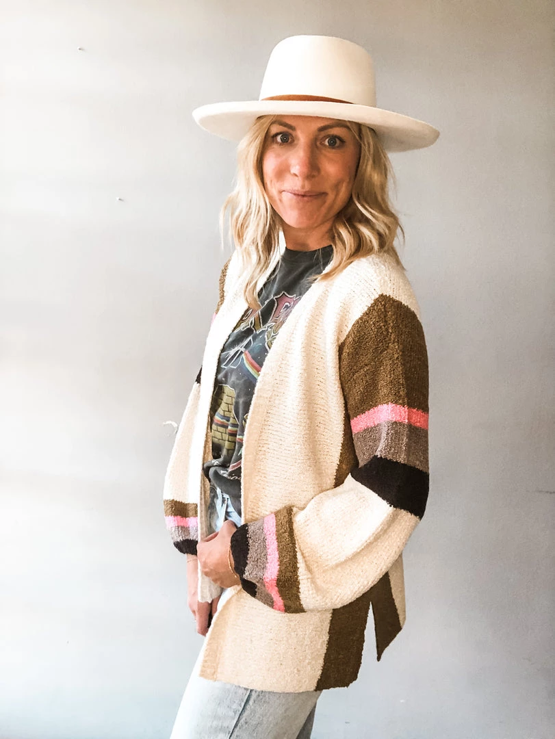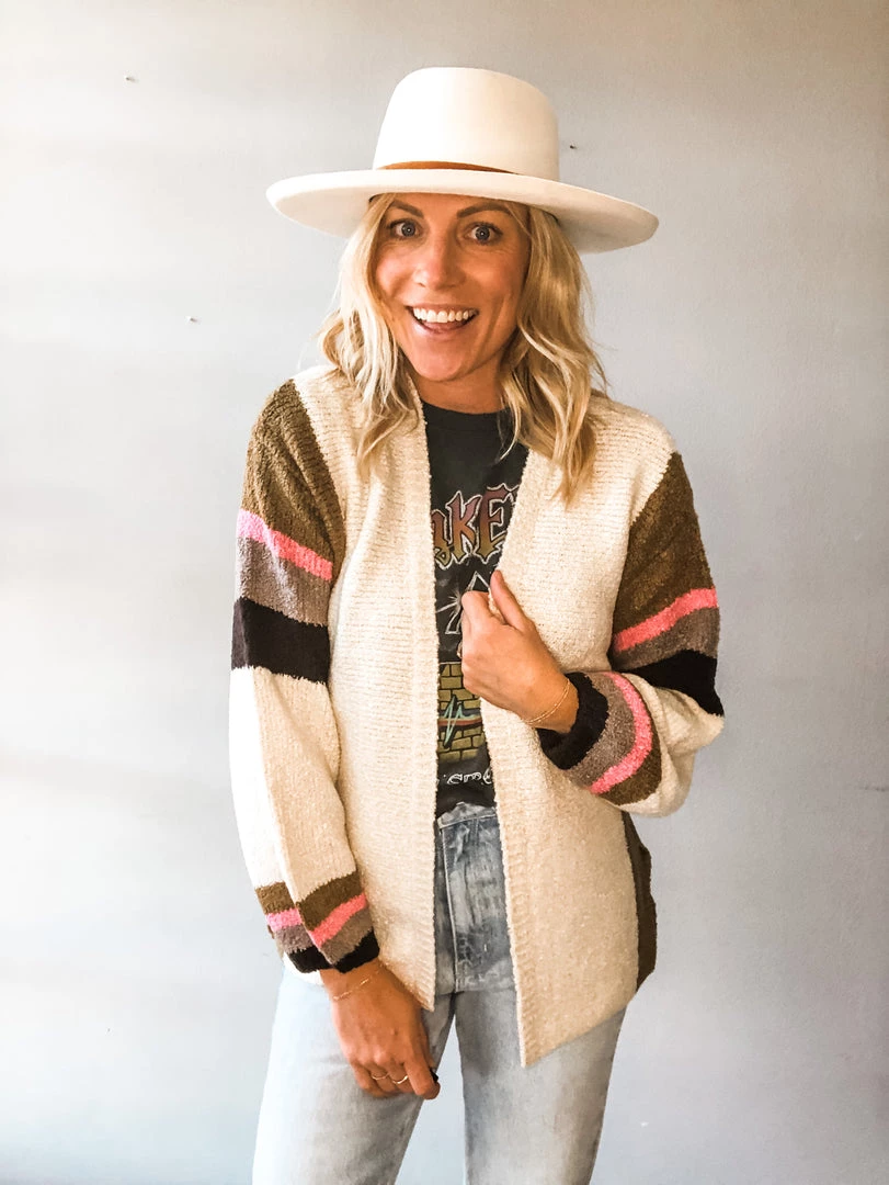 A cozy fall stripe cardigan that is perfect for layering. Loose fitting and soft, we love this knit cardigan for work or play.
