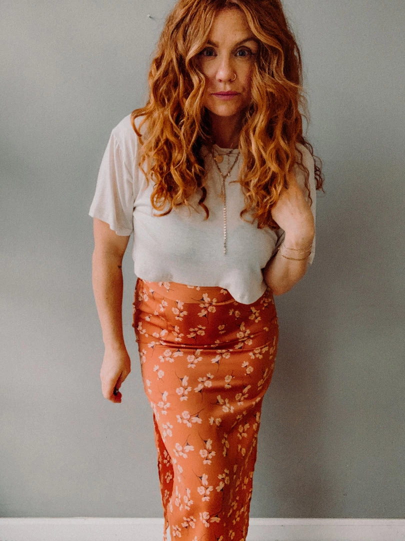 Country concert or weekend getaway, this dreamy midi skirt, with sexy side slits, will go everywhere with you. Oh, and did we mention it’s made from 100% recycled fabric, so you can feel good while wearing it! We love this high waisted (with elastic wasit on the back), super chic satin-y fabric of this spring staple. Perfect with boots, wedges or your favorite boots and a crop or bodysuit underneath!