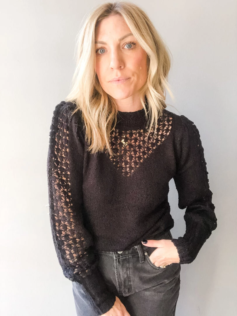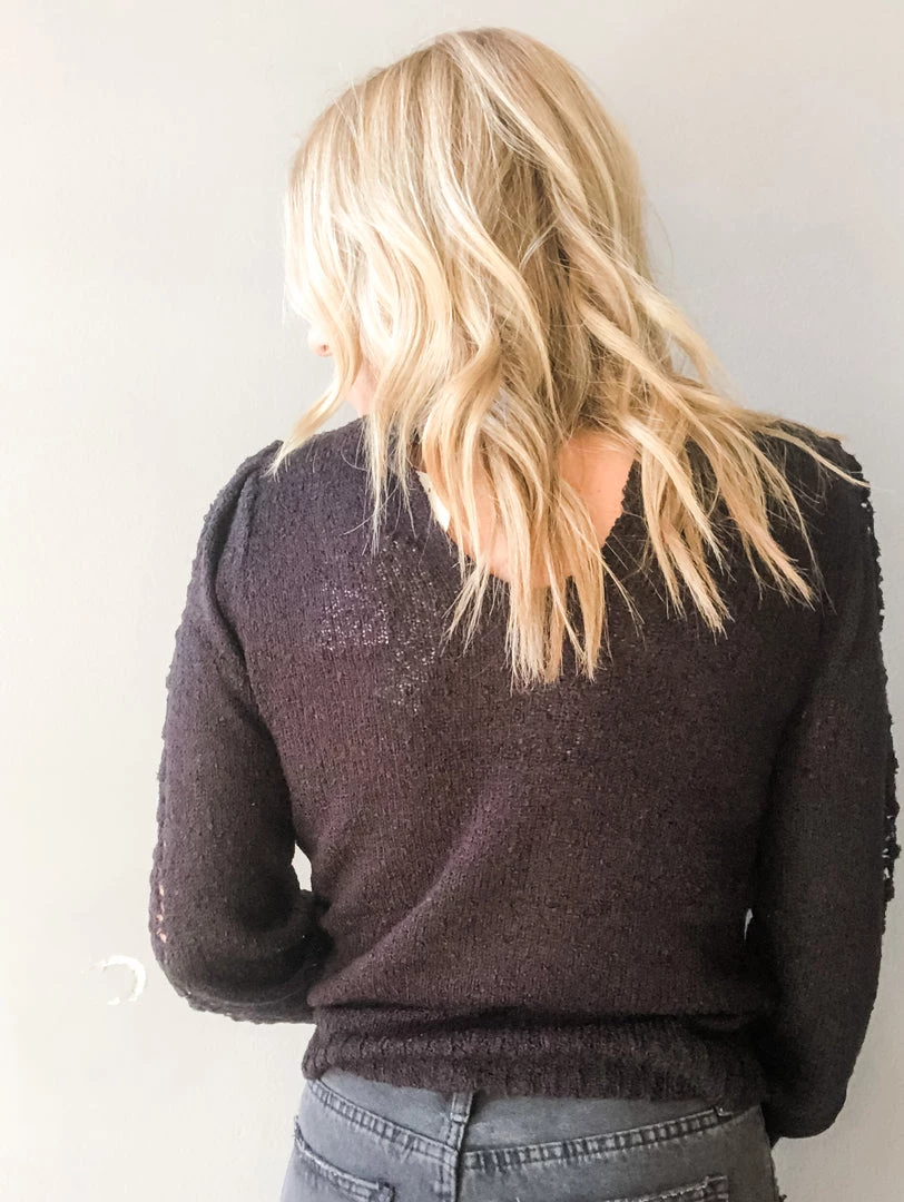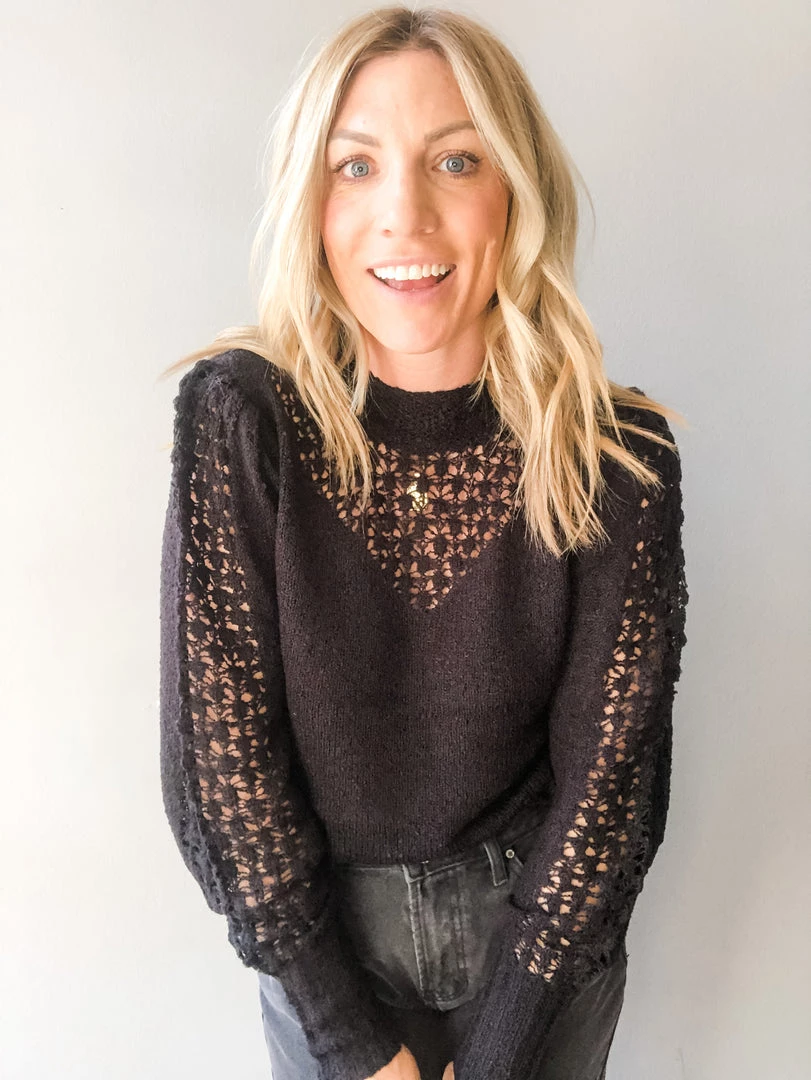 Delicate and dainty! This beautiful, lightweight long-sleeve sweater features mini cutouts in the chest and at the arms. Wear slightly tucked into a printed skirts for a sophisticated fall look. Black goes with everything, so don’t expect this piece to collect dust in your closet! Button closure at the neck with key hole cutout.