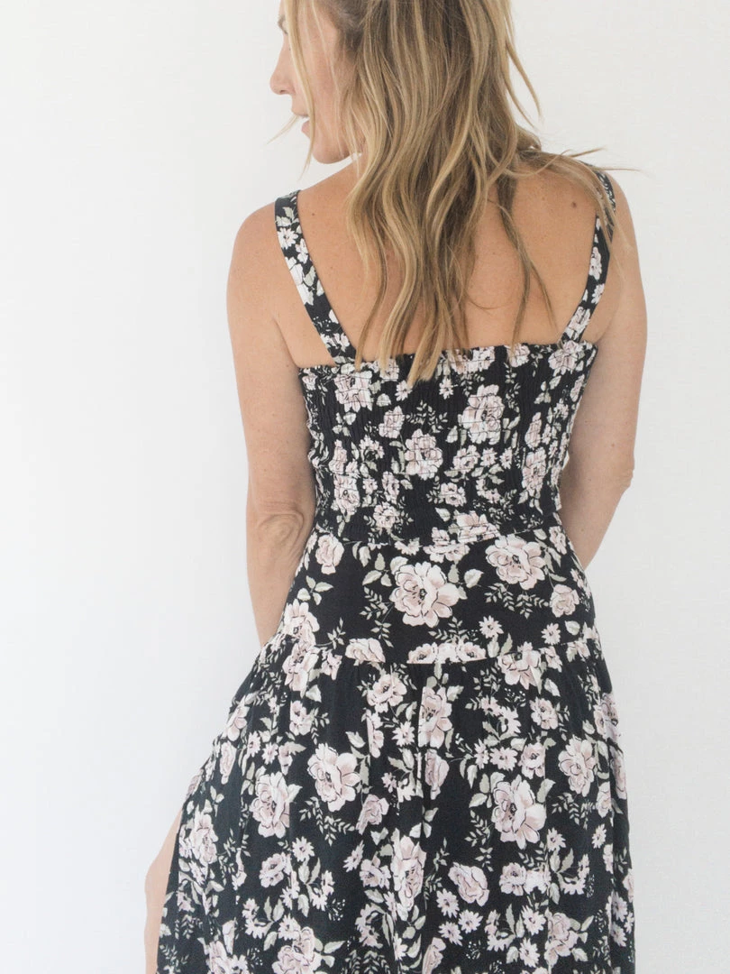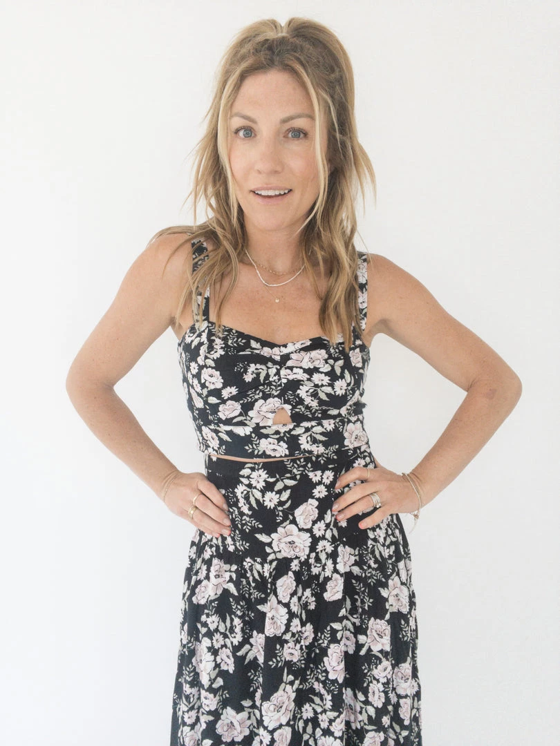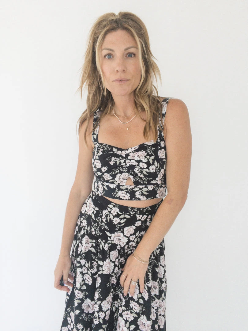 This crop can be paired with its matching maxi skirt or be worn with your favorite denim pant. It has adjustable tank straps via internal buttons, a smocked back, stitching detail giving a slight rouched look, and a small keyhole under the bust. We love it!