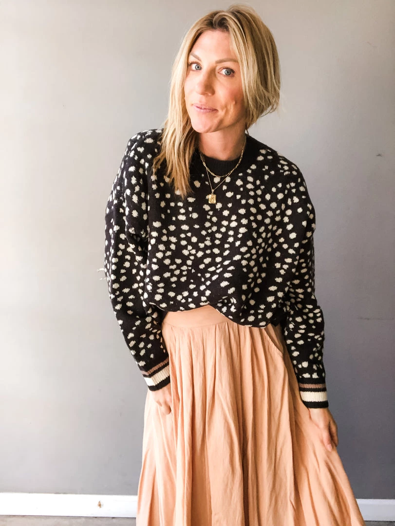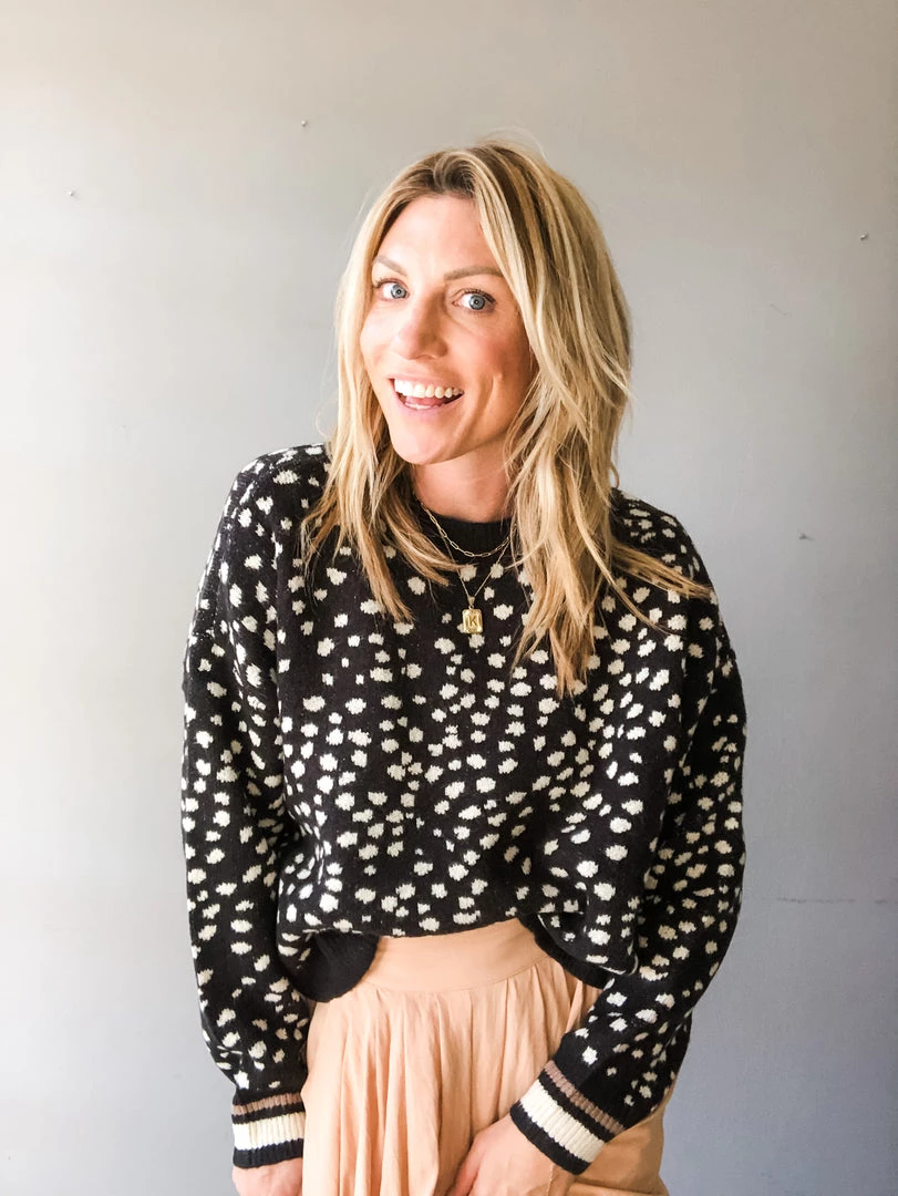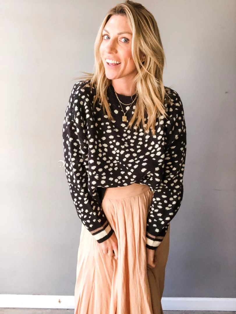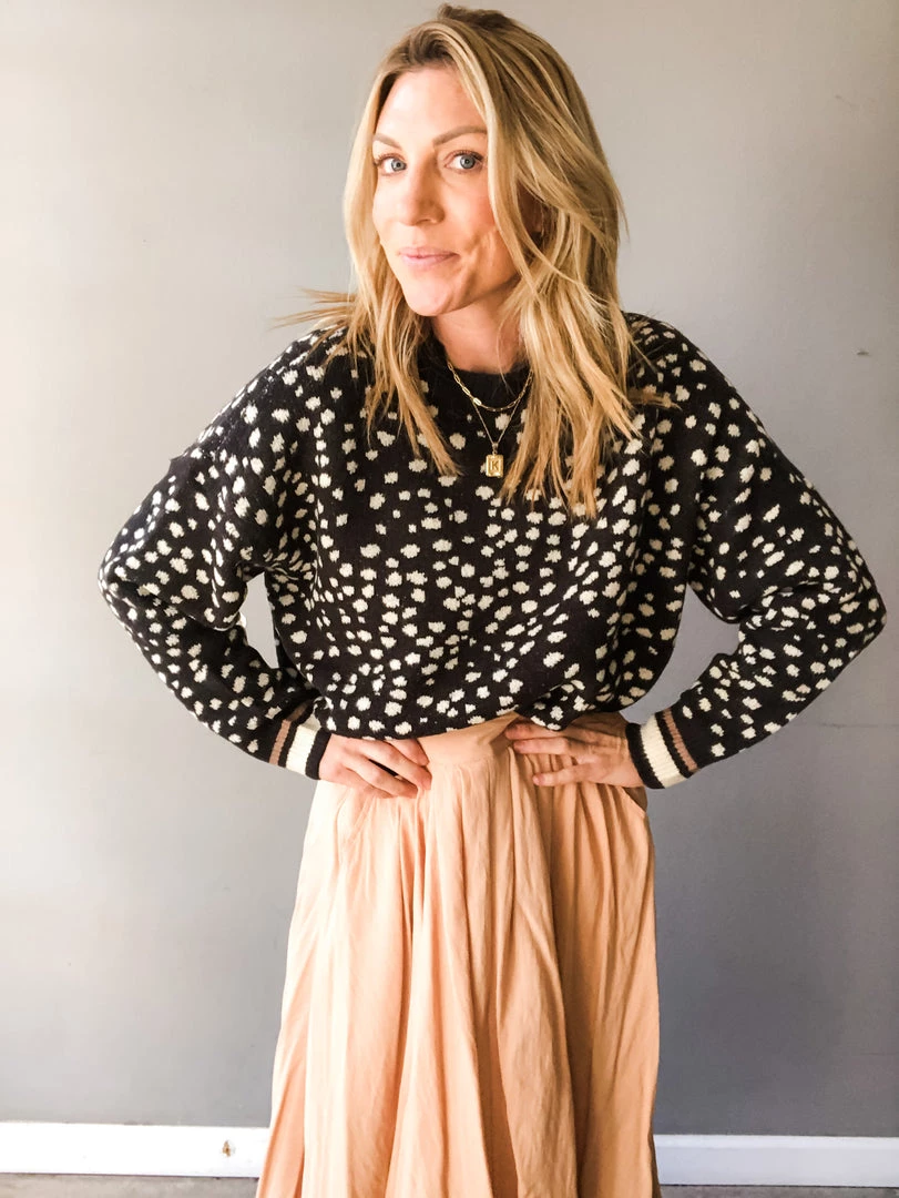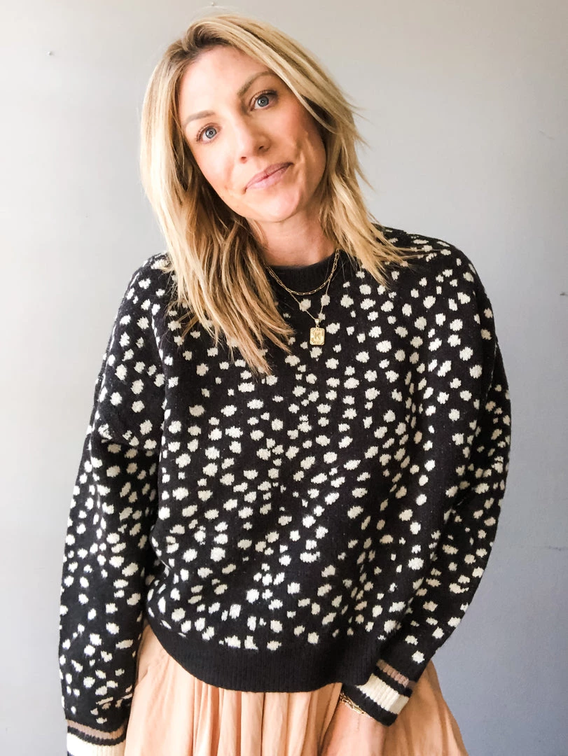 A loose fitting sweater with an all over speckled print and contrasting striped cuff. We love this cozy knit and the sophistication of this sweater for any style and age. An easy to wear and pair sweater for any occasion.