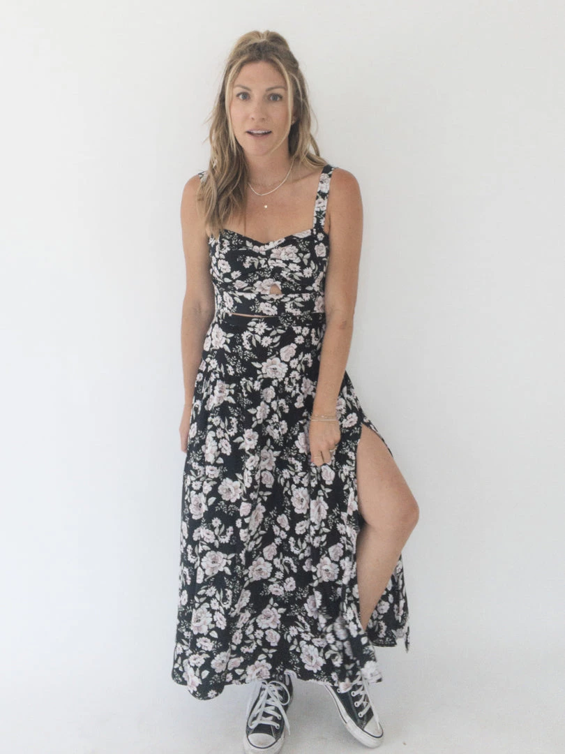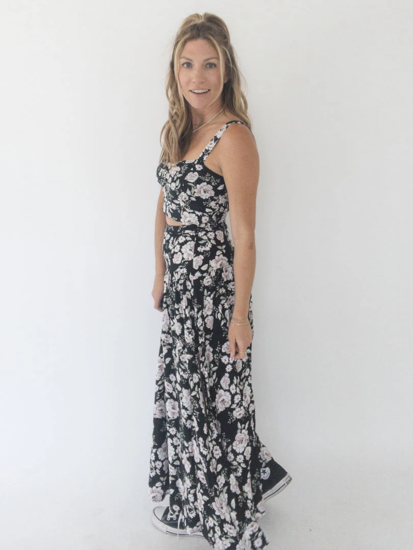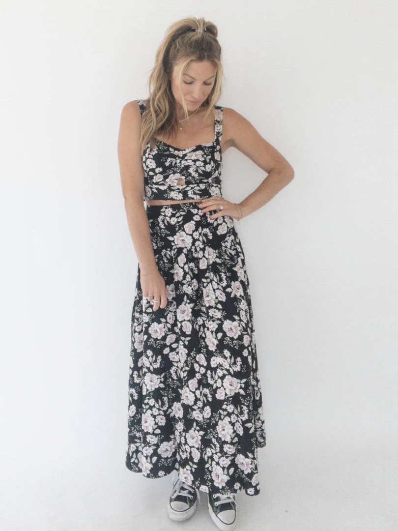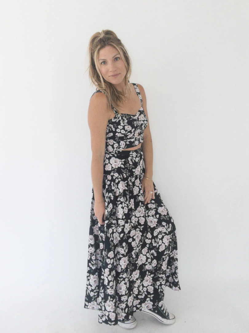 This beautiful maxi skirt can be paired with its matching cropped tank or be worn with a solid top. It’s fitted at the waist and has a stitching detail that breaks up the skirt from the waist. It also has a slit up both sides of the legs and a side zipper.