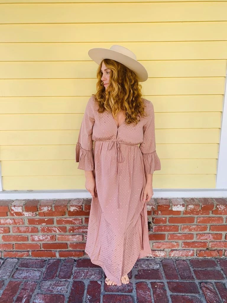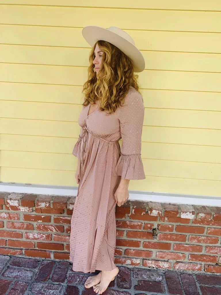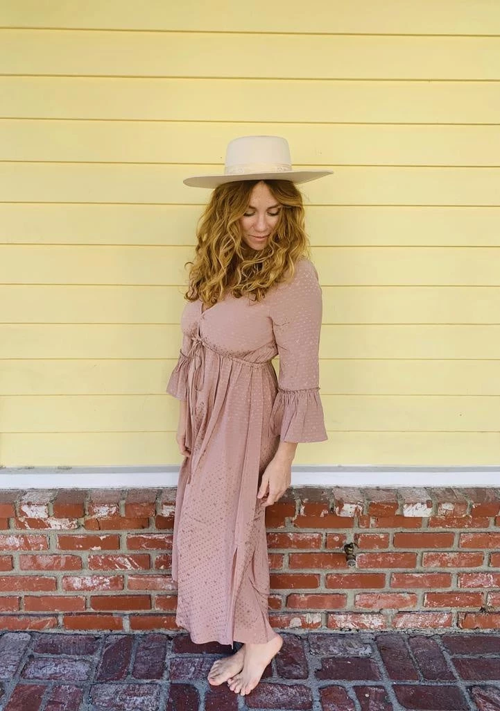 Our Saltwater Luxe Olivia Midi Dress fits like a dream! This gorgeous desert rose colored dress has side slits, a cinched waistline and snap closure at the bust. Model wears a size Medium.