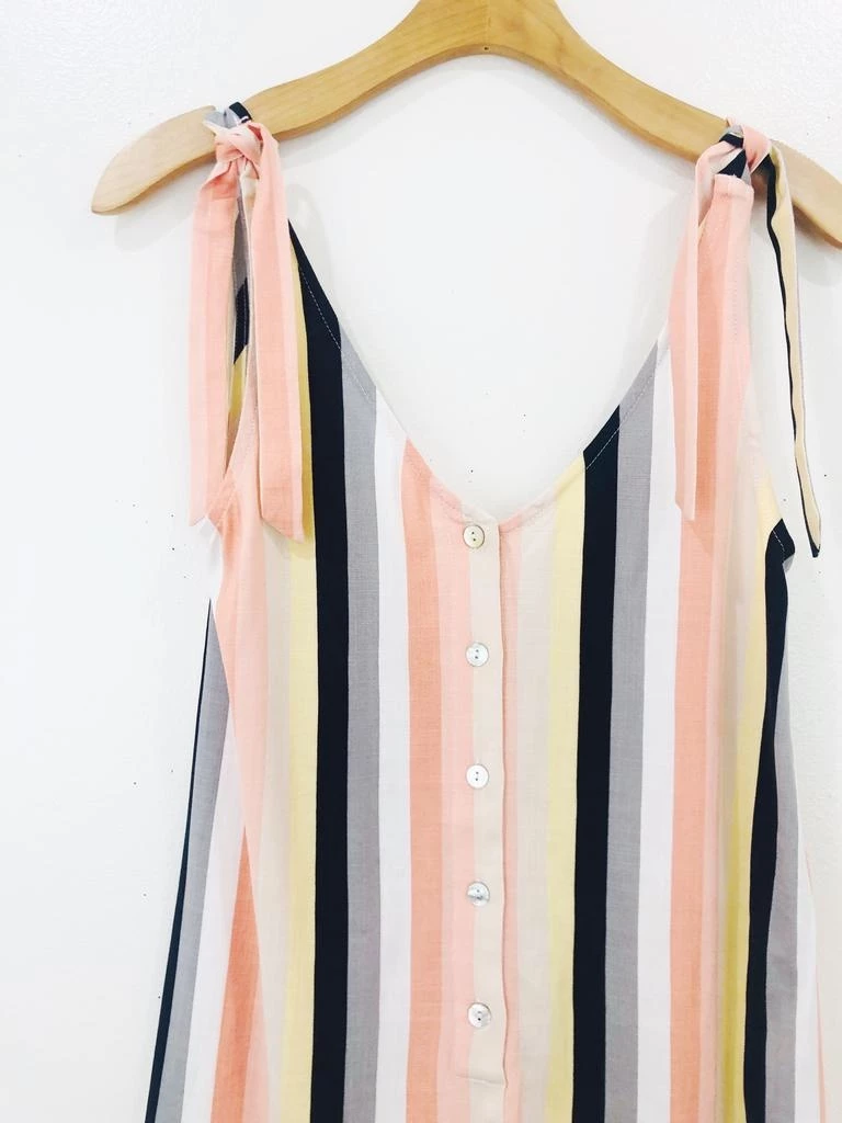 A muted multi stripe romper from Saltwater Luxe that can be worn so many ways. Throw it on for any occasion. Llayer it over a simple white tee or over a bikini for beach days. We love this piece and its versatility.