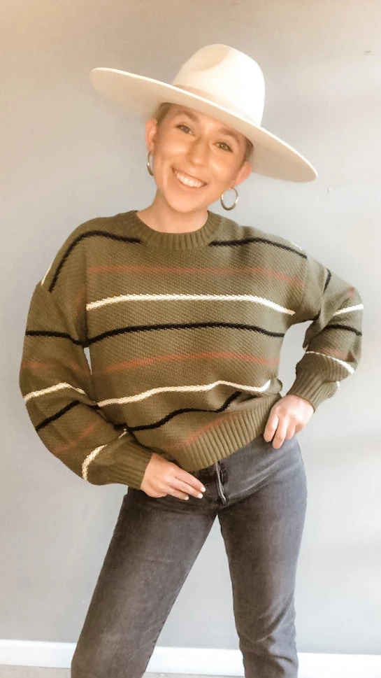 It’s sweater weather and we couldn’t be more excited to add this buttery soft striped sweater to the mix. This chic moss colored sweater is perfect for everyday wear or dressed up for the holidays. Paired with high waisted denim, booties and Lack of Color Montana hat.