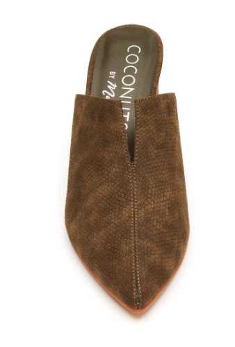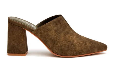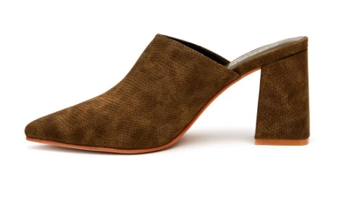A pointy toe mule with a modern silhouette, v notch and teaxtured synthetic leather make the Night Moves one of our favorite fall shoes. Pairs well with denim and a basic tee for an easy casual look or with a midi dress for a night out. Padded insole. 3.5 in heel. Whole sizes only; 1/2 sizes are suggested to size up.