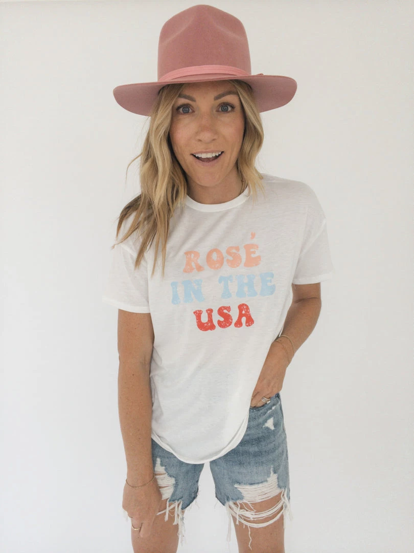 Everyone loves Rose in the USA!! A light weight, oversized crew neck tee with ROSE IN THE USA graphic. Tie her up, tuck in or wear loose over a swimsuit, this graphic tee is a fun option for showing your love for the red, white and blue!