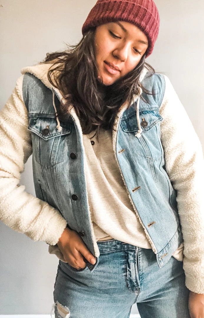 The classic silhouette of a denim jacket now with contrasting sherpa sleeves. An oh-so-plush sherpa lining will give you all the cozy feels. This button front jacket has an adjustable drawstring hood and button closure breast pockets. We love the laid back vibes of this cozy piece. We love it layered over a comfy knit and paired with a great pair of denim and a hot chocloate…or a hot toddy. Your pick.