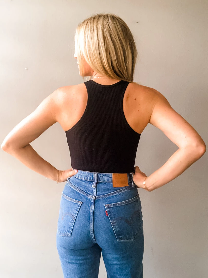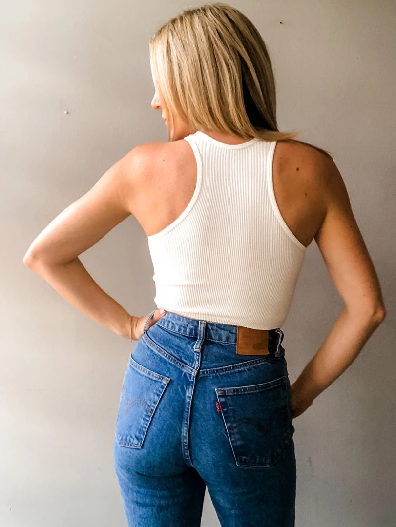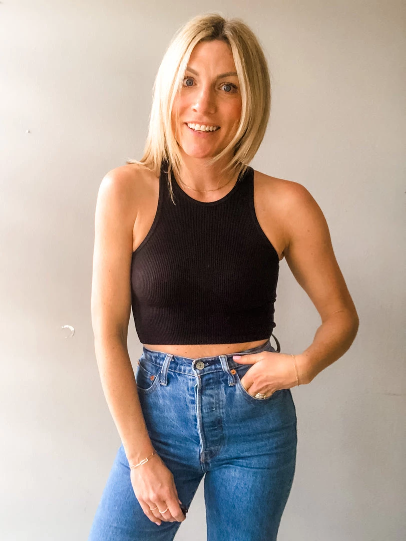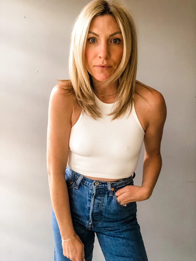 A super stretchy, seamless ribbed tank that is great for layering or pairing with your high rise denim. Lightweight with a high neck and a cropped fit. Available in black and white.