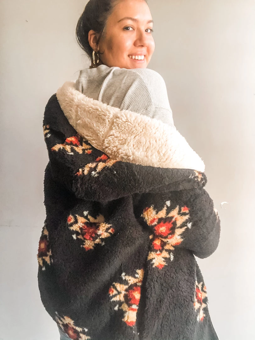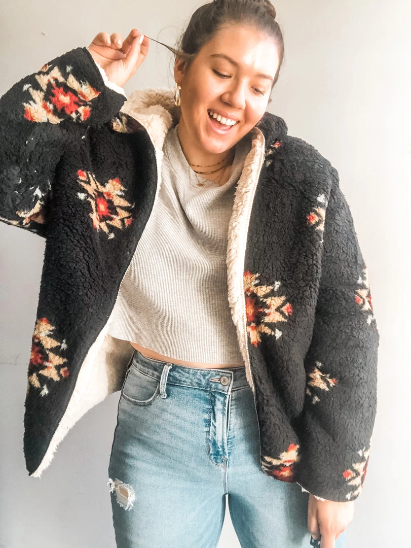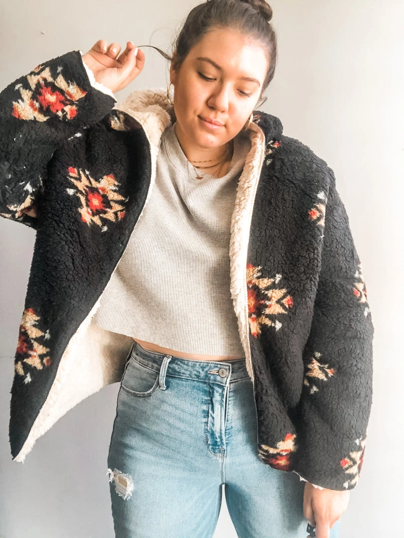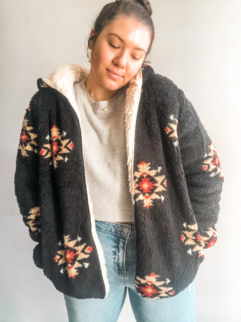 A cozy fleece sherpa jacket with hood and pockets. In a colorway that’s so easy to layer over a tee or cozy knit and paired with a pair of comfy joggers or dressed up with some denim and boots. Super soft and perfect for the cool weather ahead. We love the star pattern and the option to wear this reversable jacket with the soft ivory on the outside. Loose fitting.