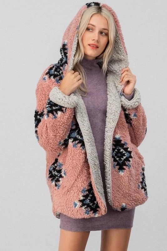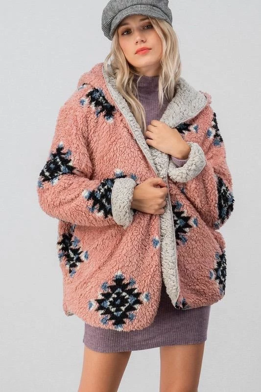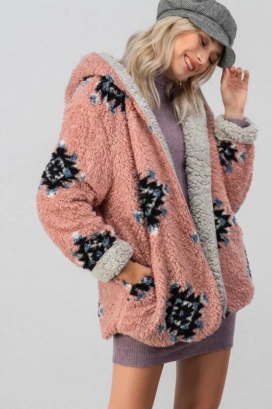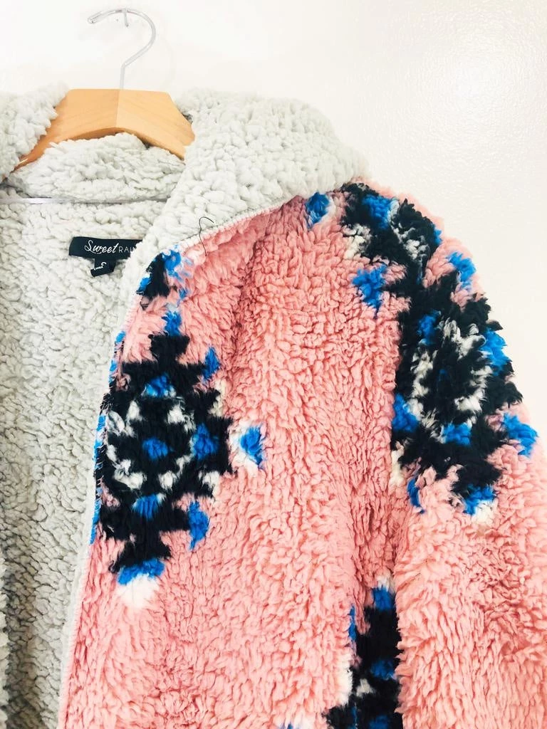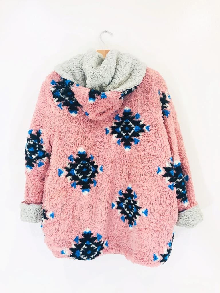 A mauve fleece with geo print design and hood and pocket details. Runs pretty true to size and isn’t too baggy on, but it is a chunkier fleece, so size up if you want it oversized in the body to toss on for those early mornings.