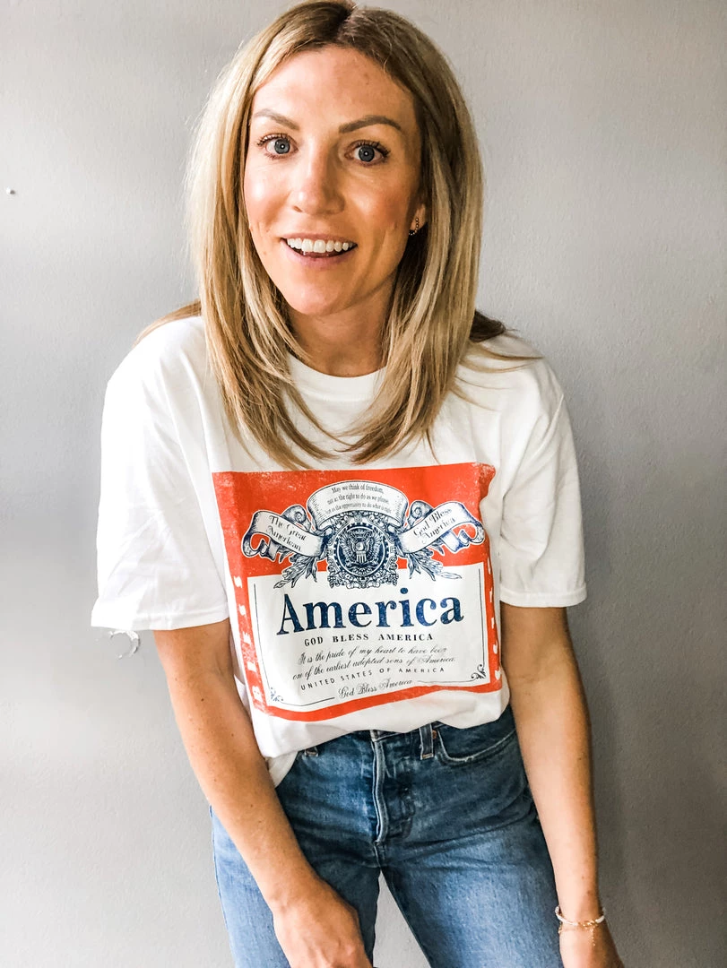 Are best selling sweatshirt is back for summer in a crew neck tee! White oversized tee with America Budweiser logo. Wear loose or tucked in with denim and God Bless The USA!!