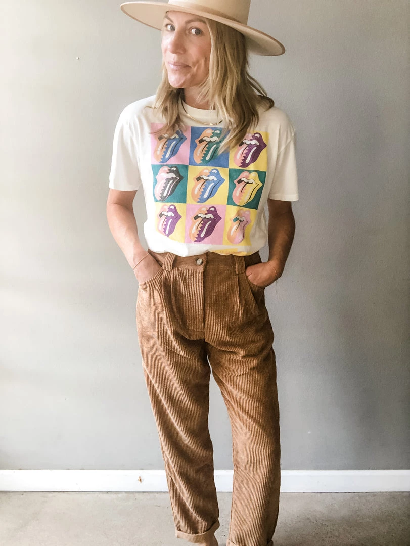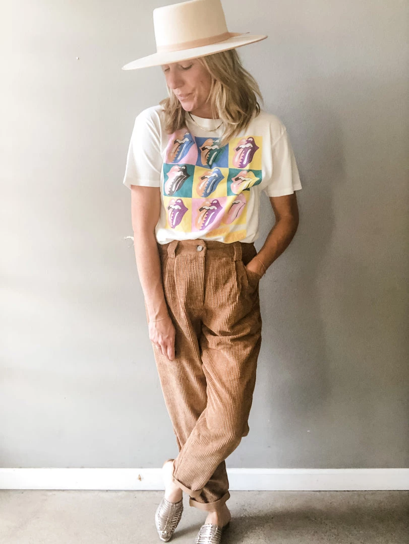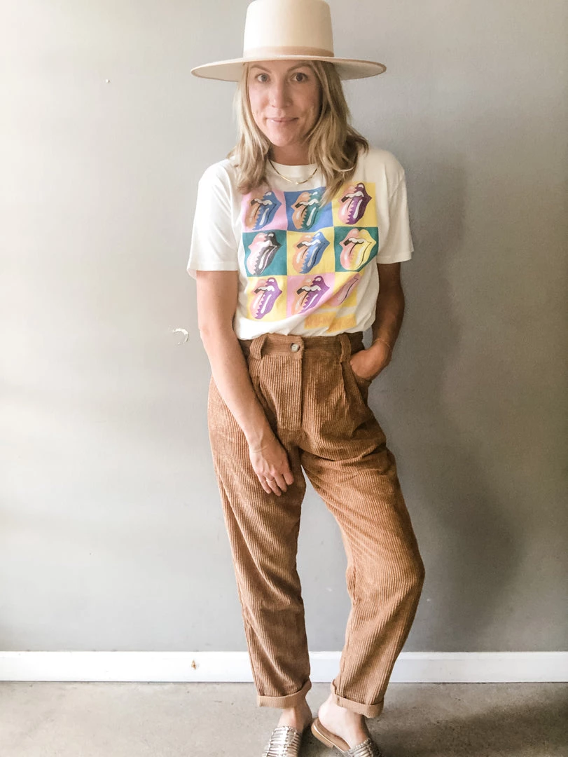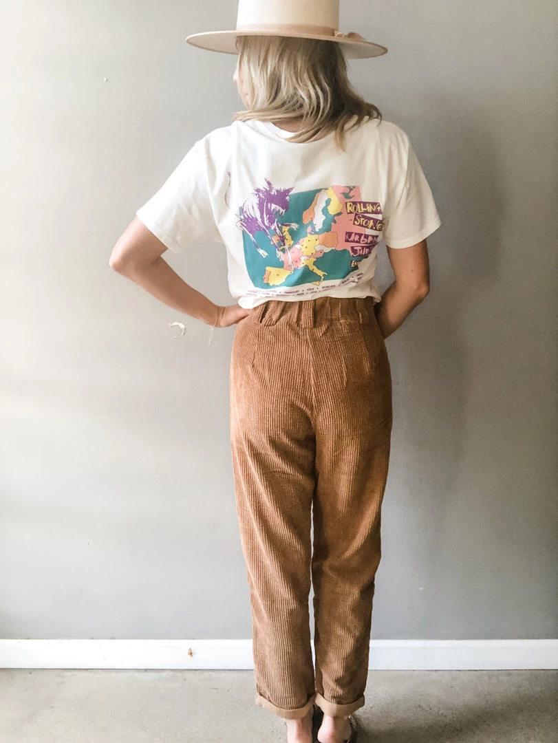 A high waisted slouchy pant in a camel courduroy with side pockets, front zipper and button closure. Such a fun pant to take to work or for play, we love it paired with a graphic tee and a pair of slides. Loose fitting and run big.