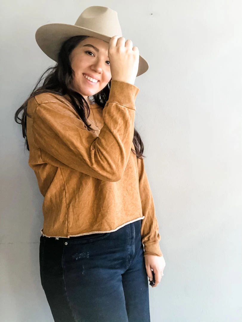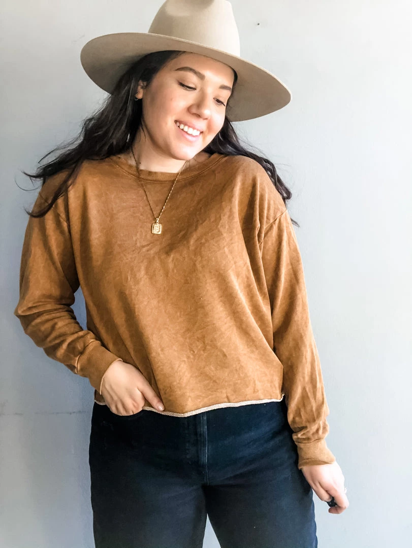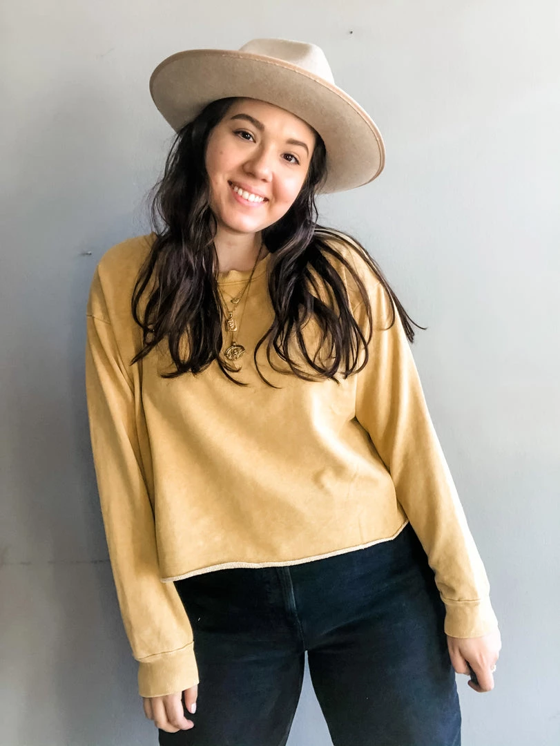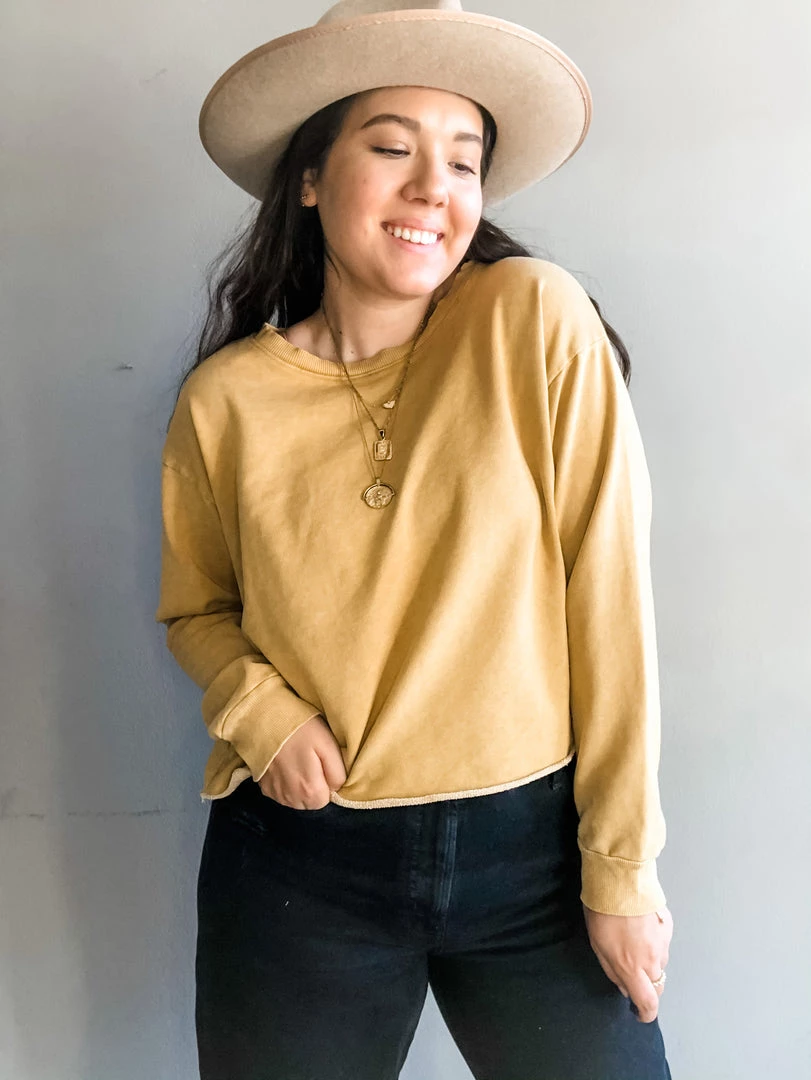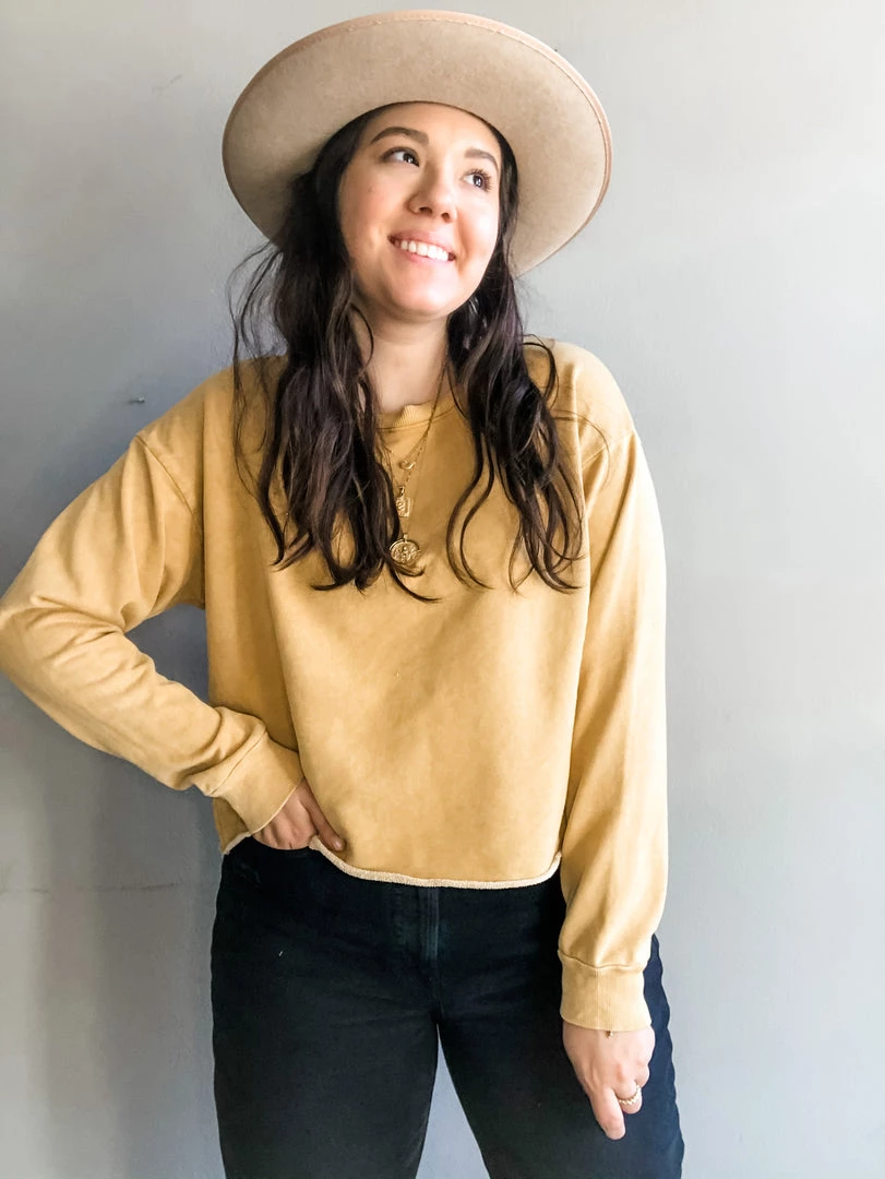 Chill and be chill in this french terry pullover. The Chillaxed Sweatshirt is a slightly cropped long sleeve with a relaxed feel and boxier cut fit. Available in two perfect-for-fall color ways. With banded cuff wrists and vintage wash style, this sweatshirt is going to be your favorite toss-on piece. So easy and super versatile, a winning combo!