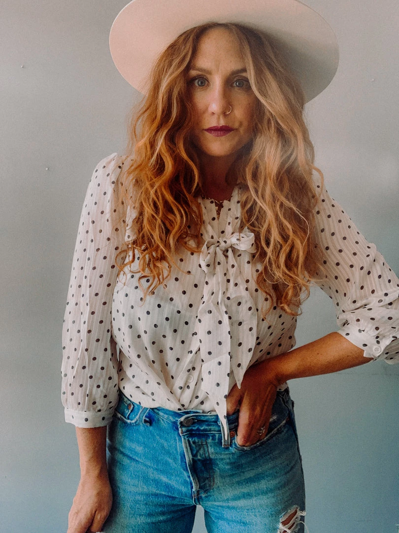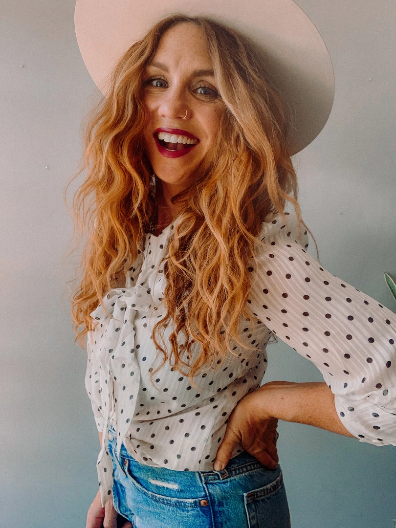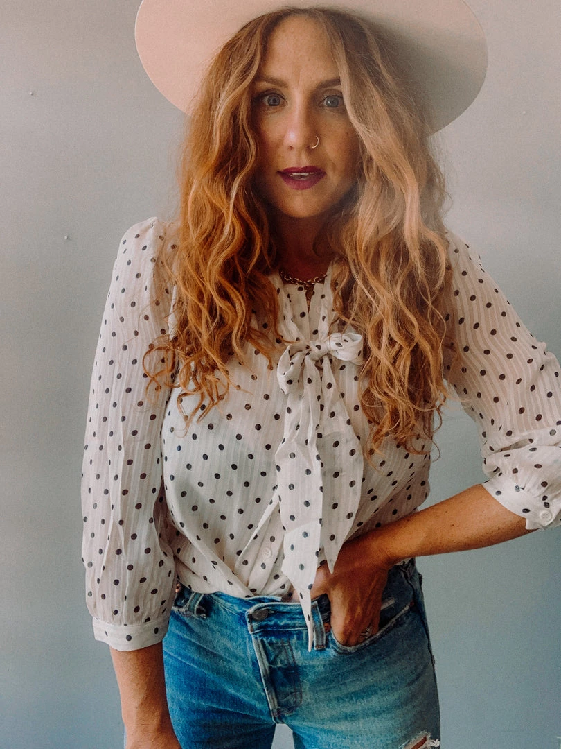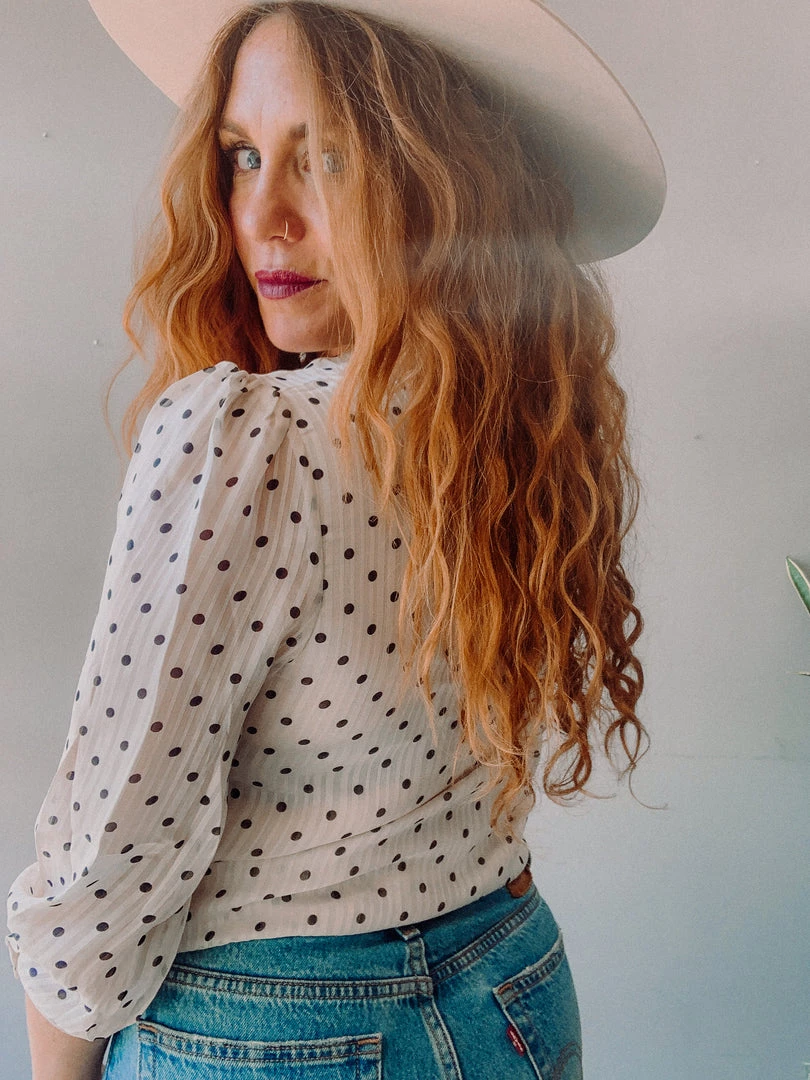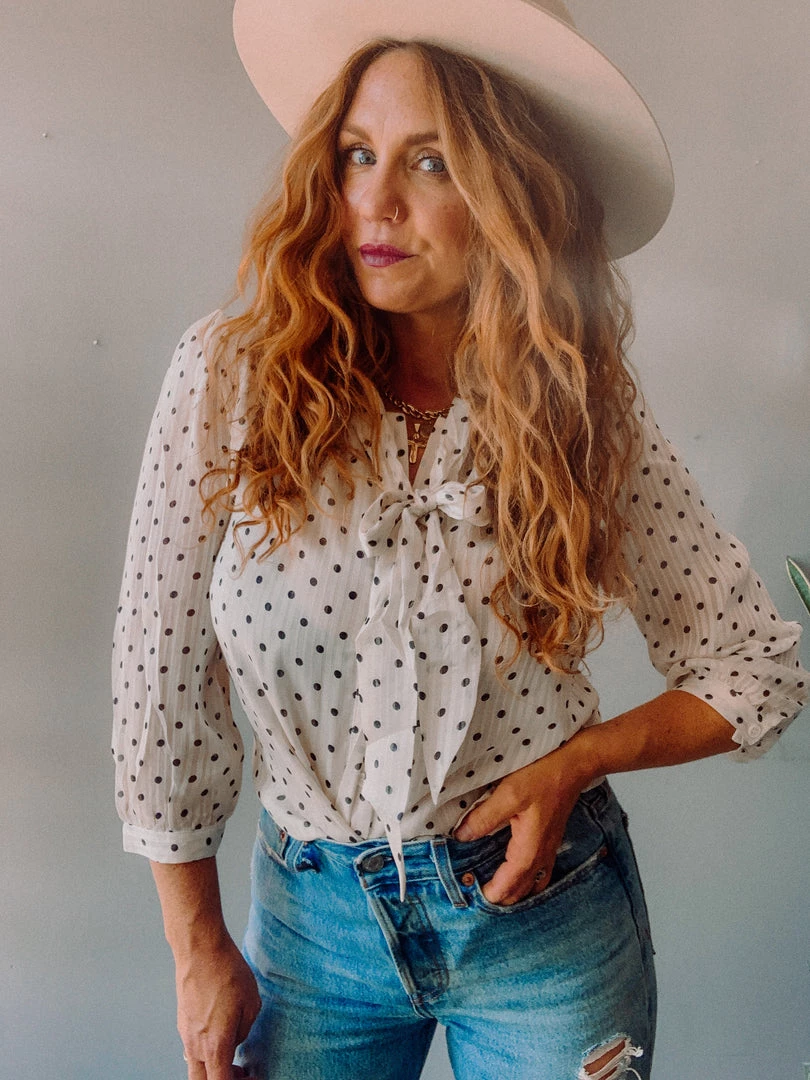 The Out of Office Polka Dot Blouse is one of my fav silhouettes in a classic polka dot pritn. A chic button up blouse with a fun bow tie at the neckline. Love it paired with high rise denim or bells. A great look for a date night, office appropriate, but also just so dang swaggy.