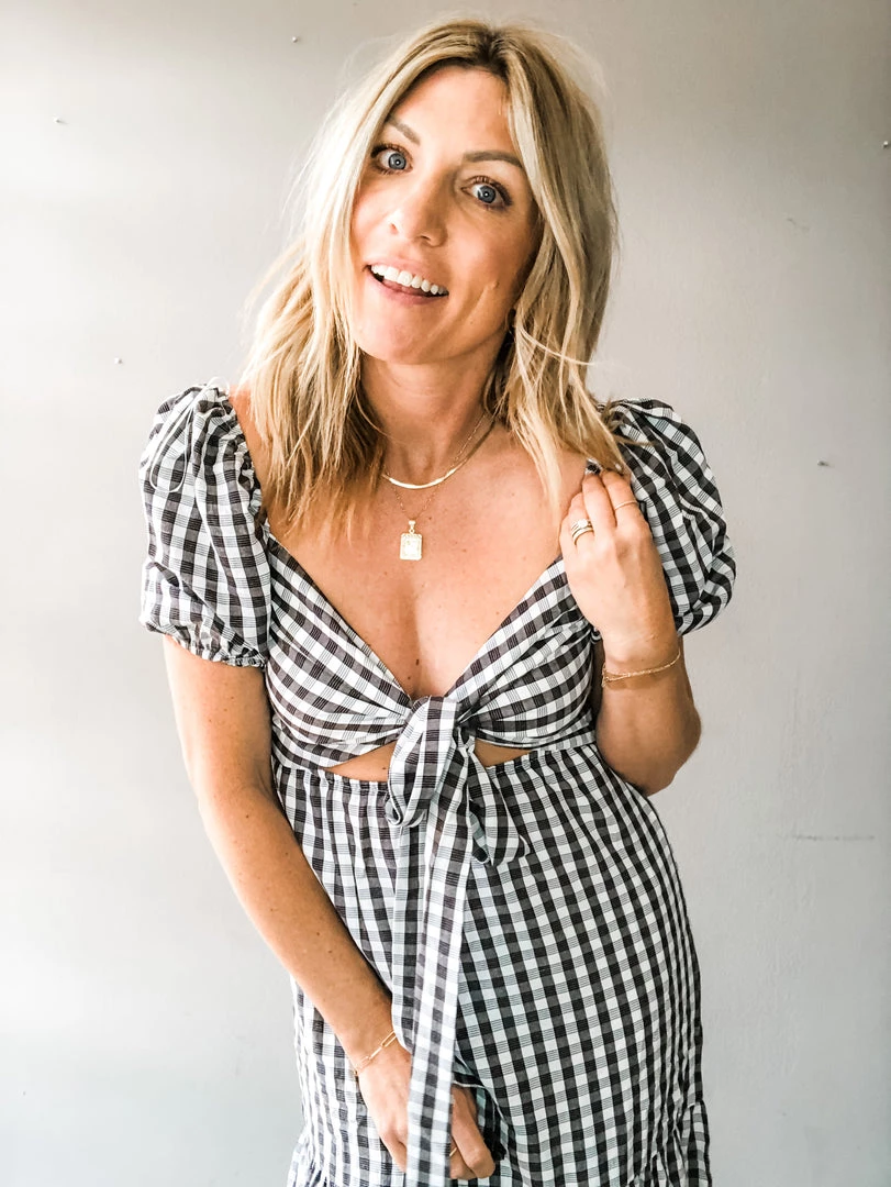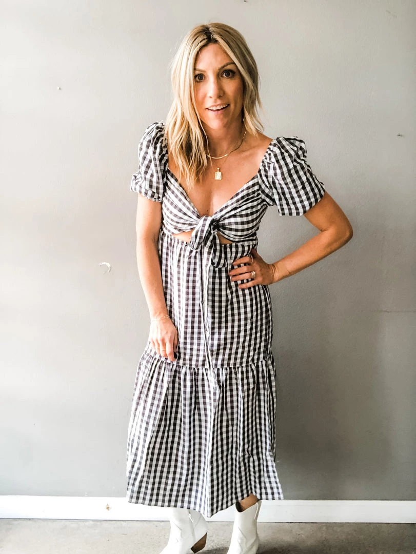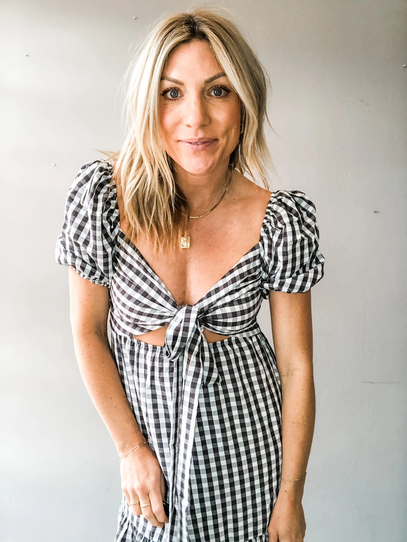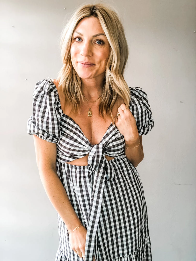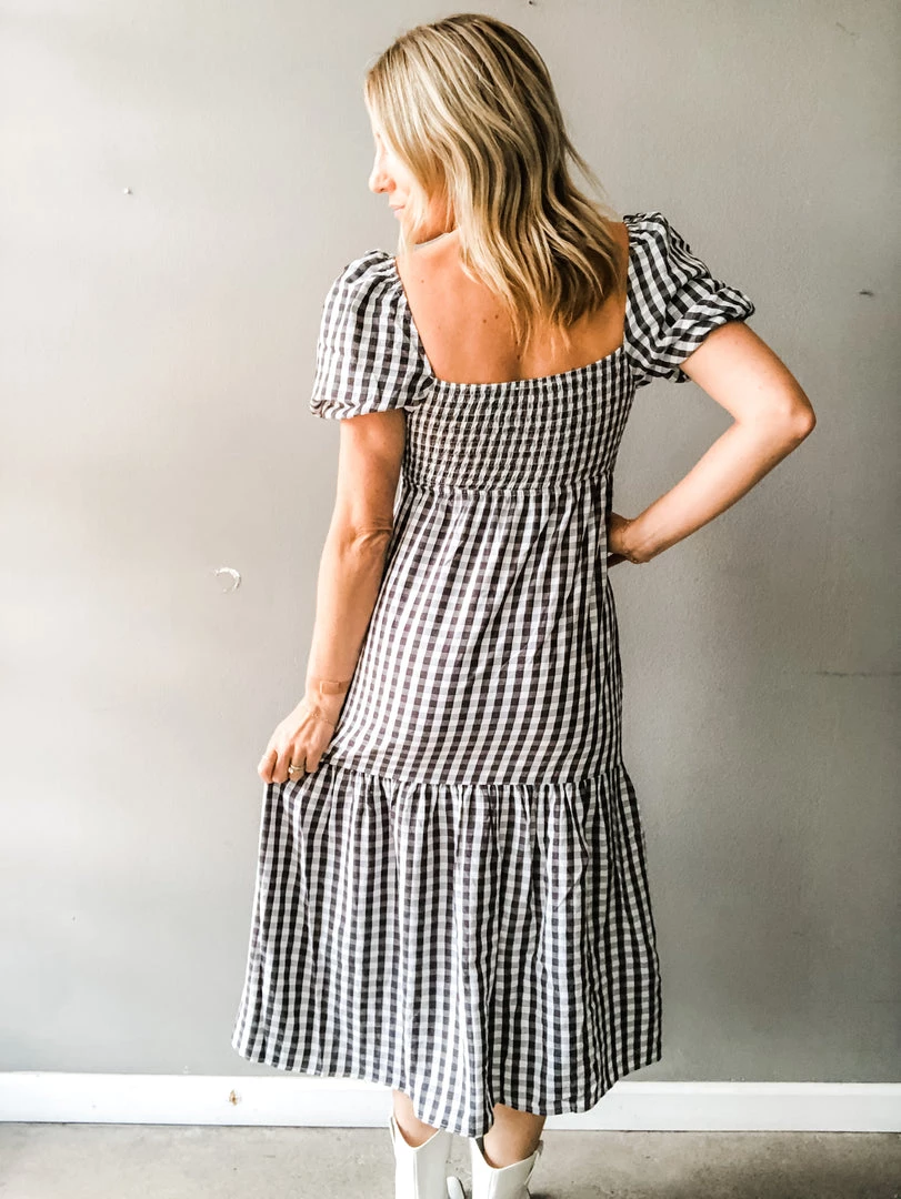 A gingham midi dress with a tiered skirt, tie front, puff sleeves and smocked back. Love this dress and the many ways you can pair it. Dress up for a special occasion or toss on some boots and wear casual. Lightweight for wear all summer long. Lined.