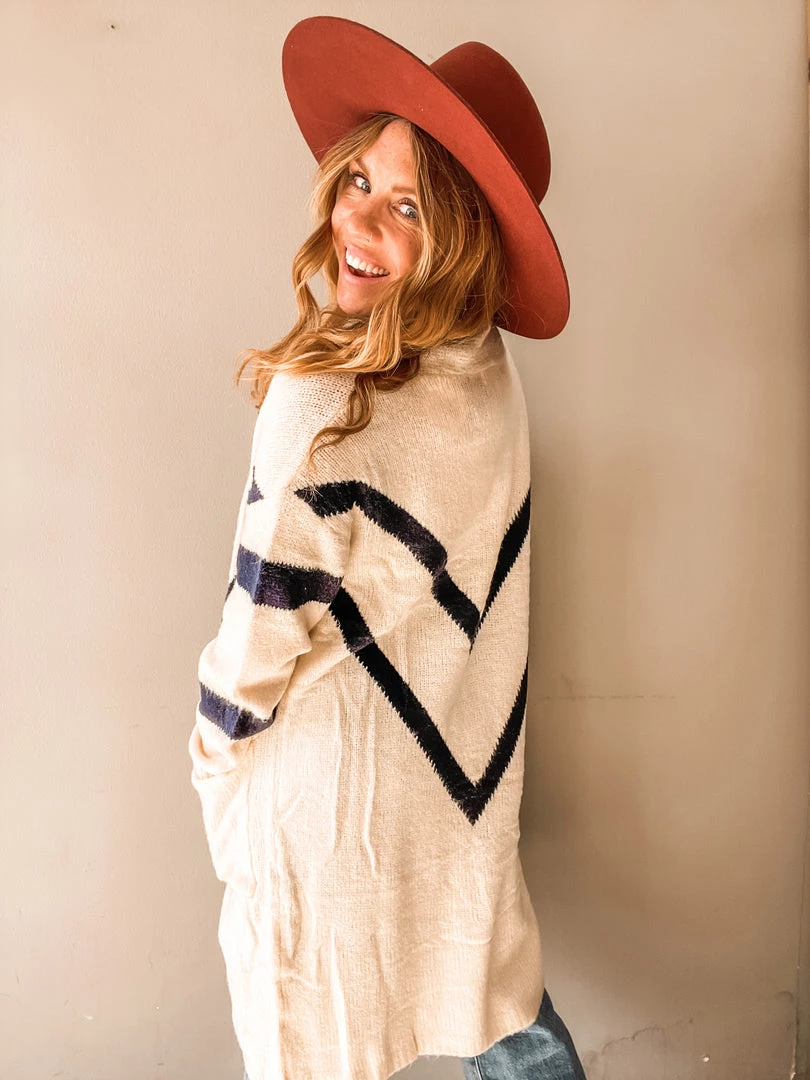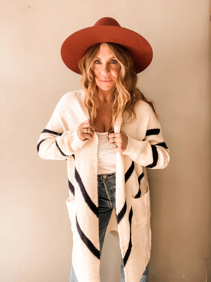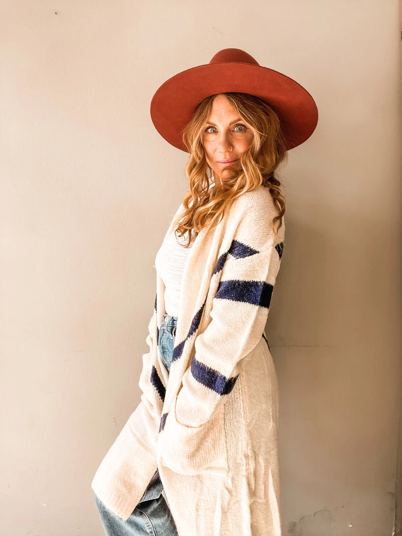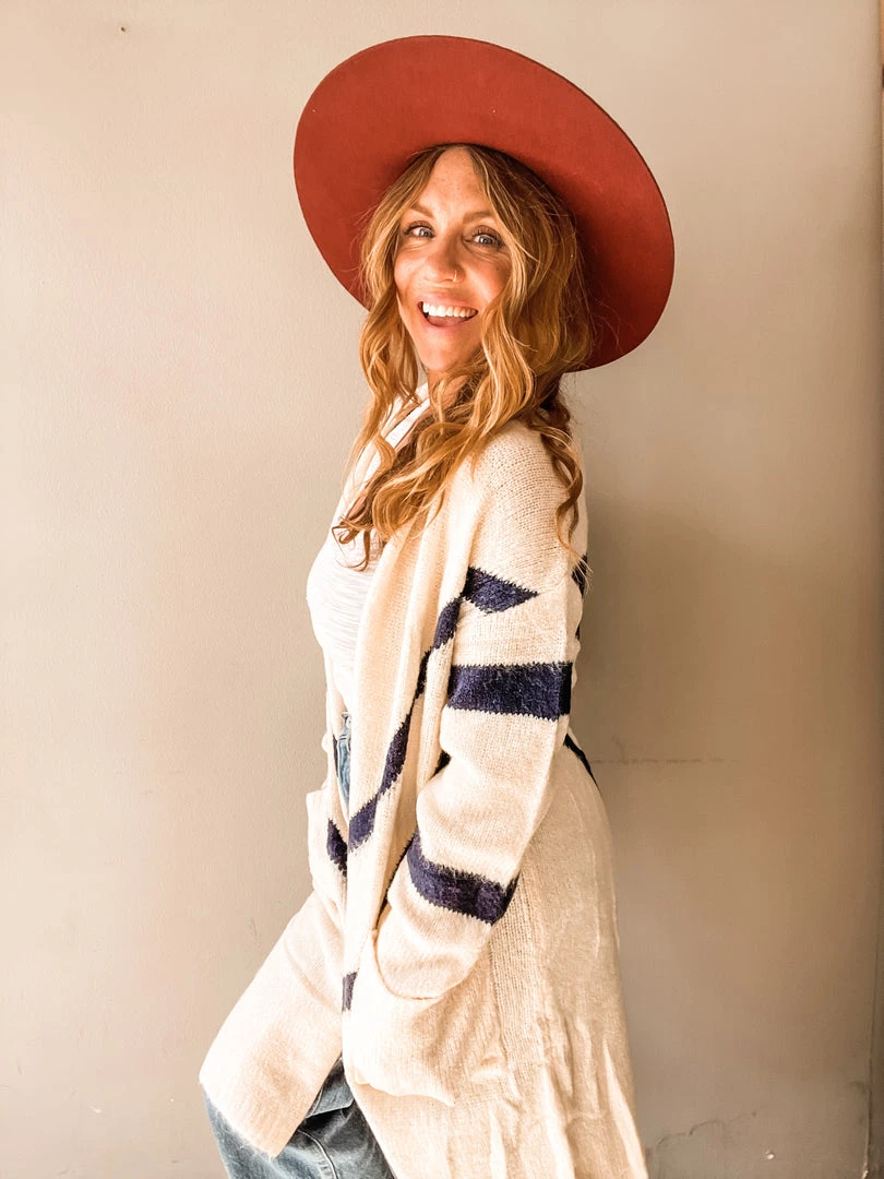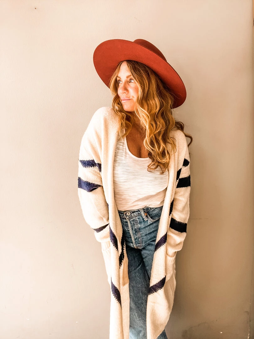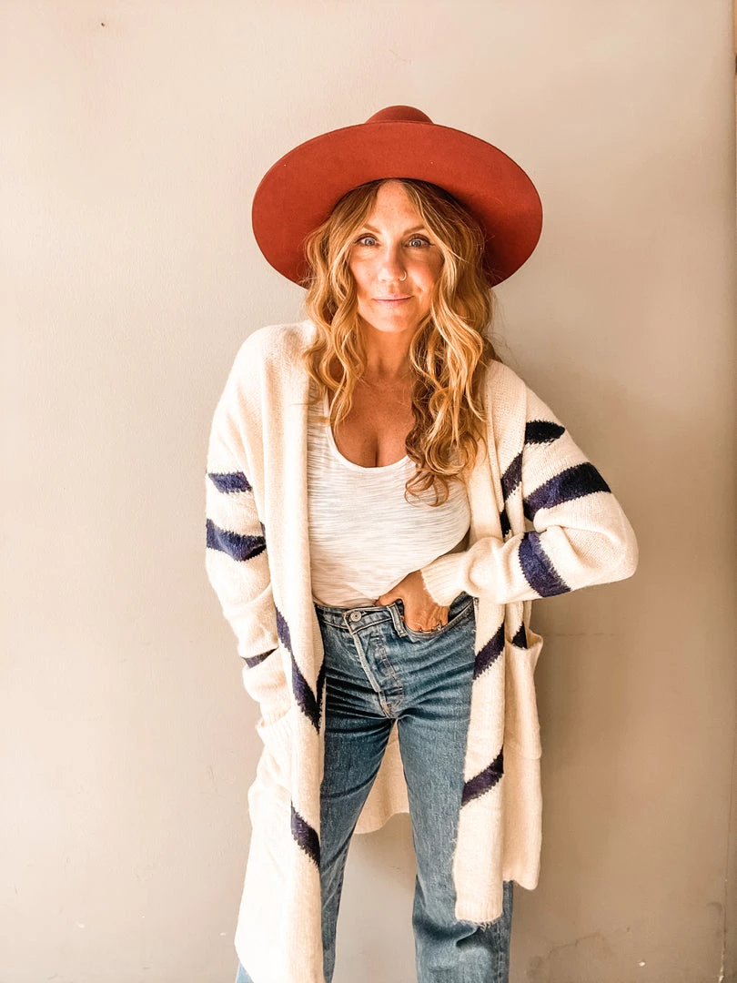 The River Runs Cardigan is a super cute ivory and navy chevron-style print with side pockets and a longer cardigan silhouette. We love this super soft staple piece paired with classic denim and a white tee and boots, and topped off with one of our fav Gigi Pip or Lack of Colour hats!!!